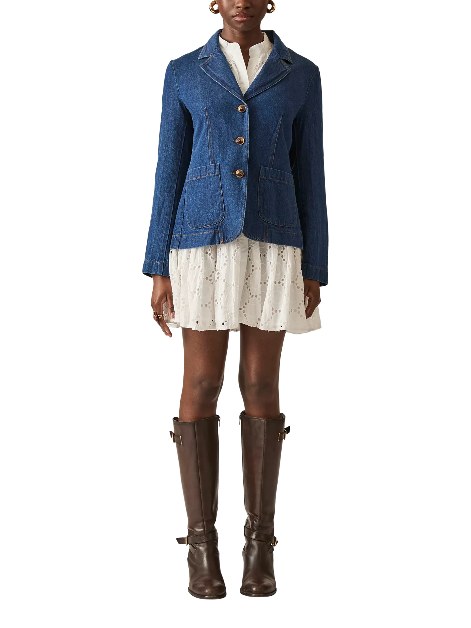 Elevate your style with the Denim Blazer by James Lakeland. This chic blazer features a notched lapel collar, three metallic buttons down the front, two large front pockets, a back opening, and decorative buttons on the cuffs. Perfect for casual or sophisticated looks. Made from cotton denim for comfort and durability.