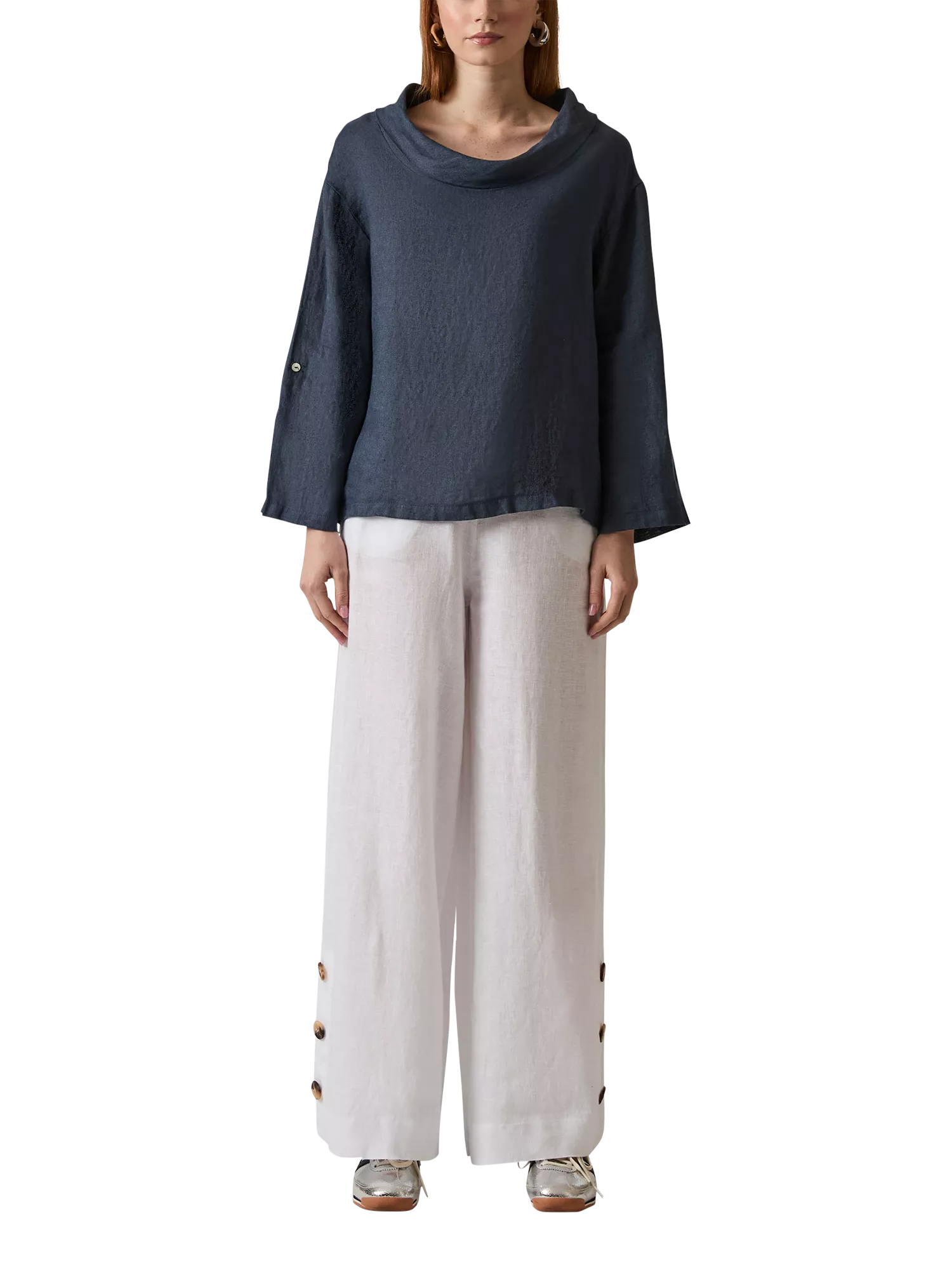 This James Lakeland Cowl Neck Linen Top blends effortless elegance with a relaxed silhouette. Featuring a soft, draped cowl neckline, it offers a chic yet comfortable fit. Crafted from breathable linen, it ensures ease of wear while maintaining a refined look. The long sleeves can be rolled up and secured to three-quarter length for versatile styling.
