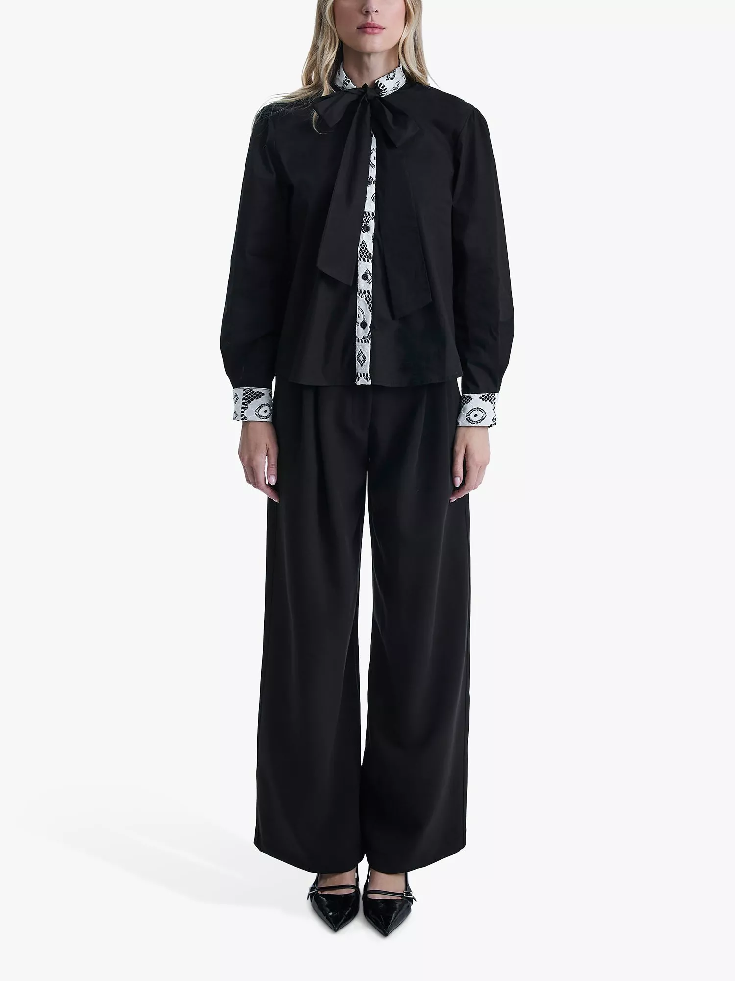 This original James Lakeland design features a cotton shirt adorned with beautiful crochet appliques. The band collar, buttoned cuffs, and button plate all showcase intricate detailing. Cut in a relaxed fit, this button-up shirt provides exceptional comfort due to its slight elasticity. The dramatic tie at the neck can also be styled as a bow or left casually undone.