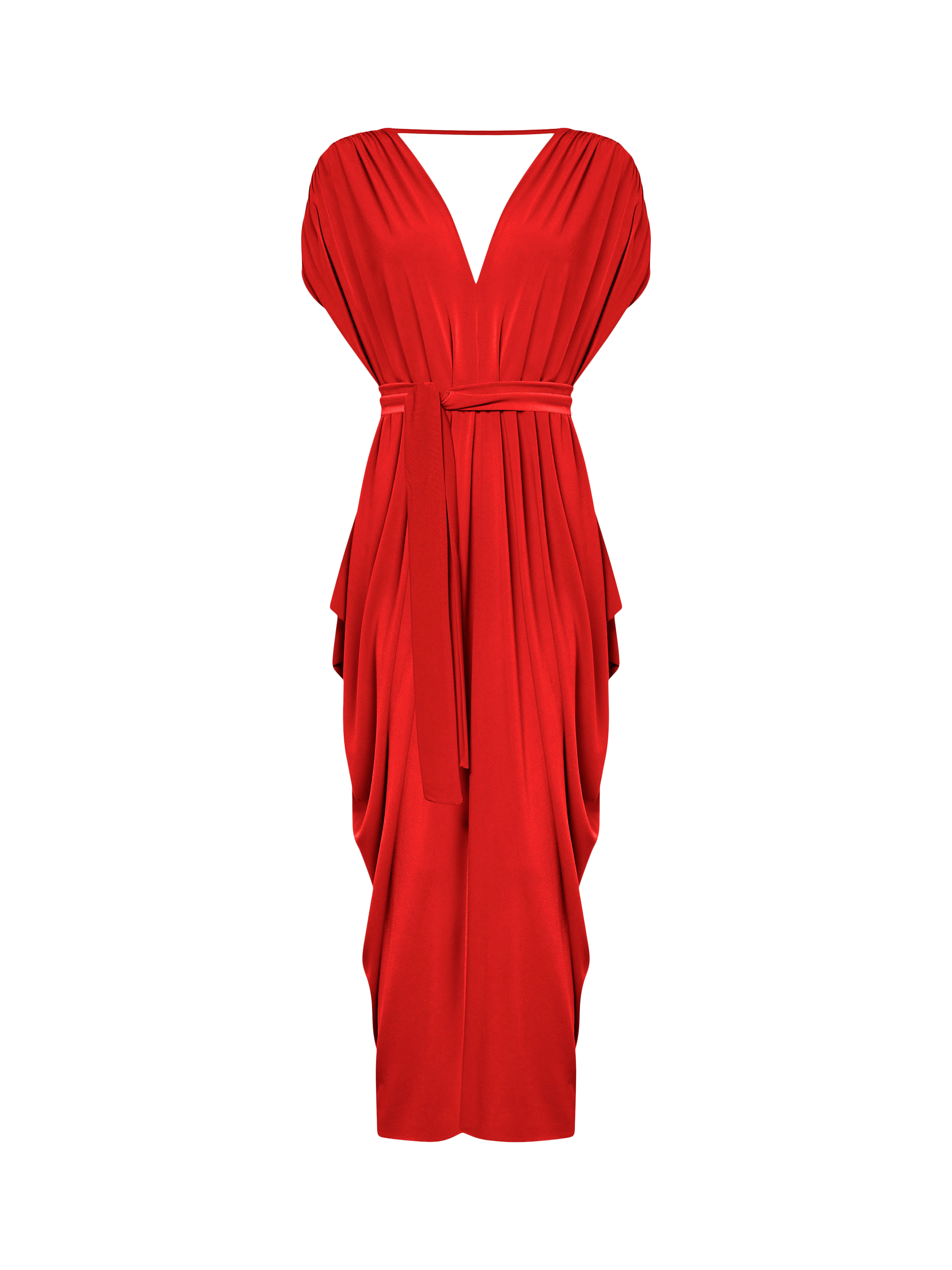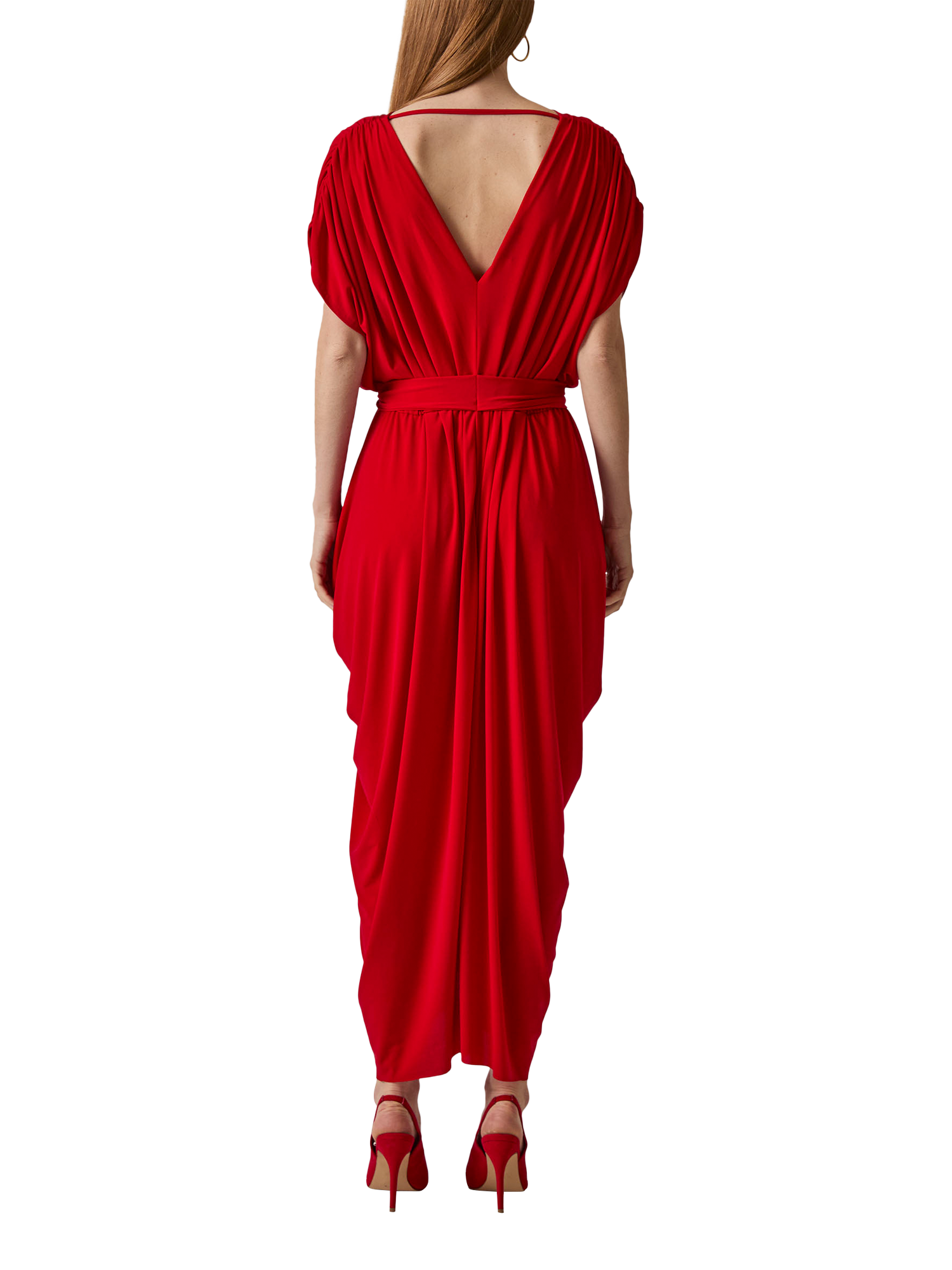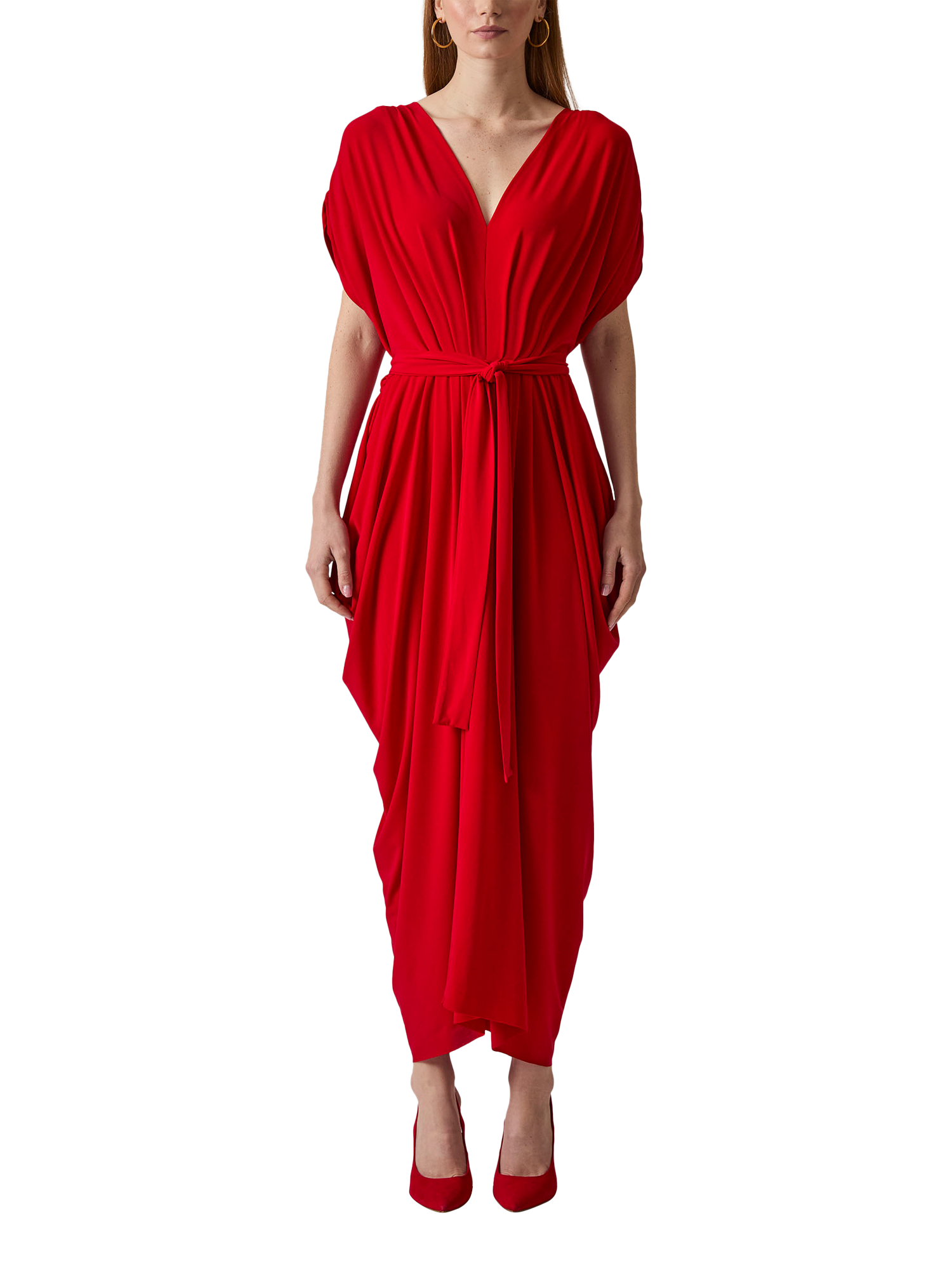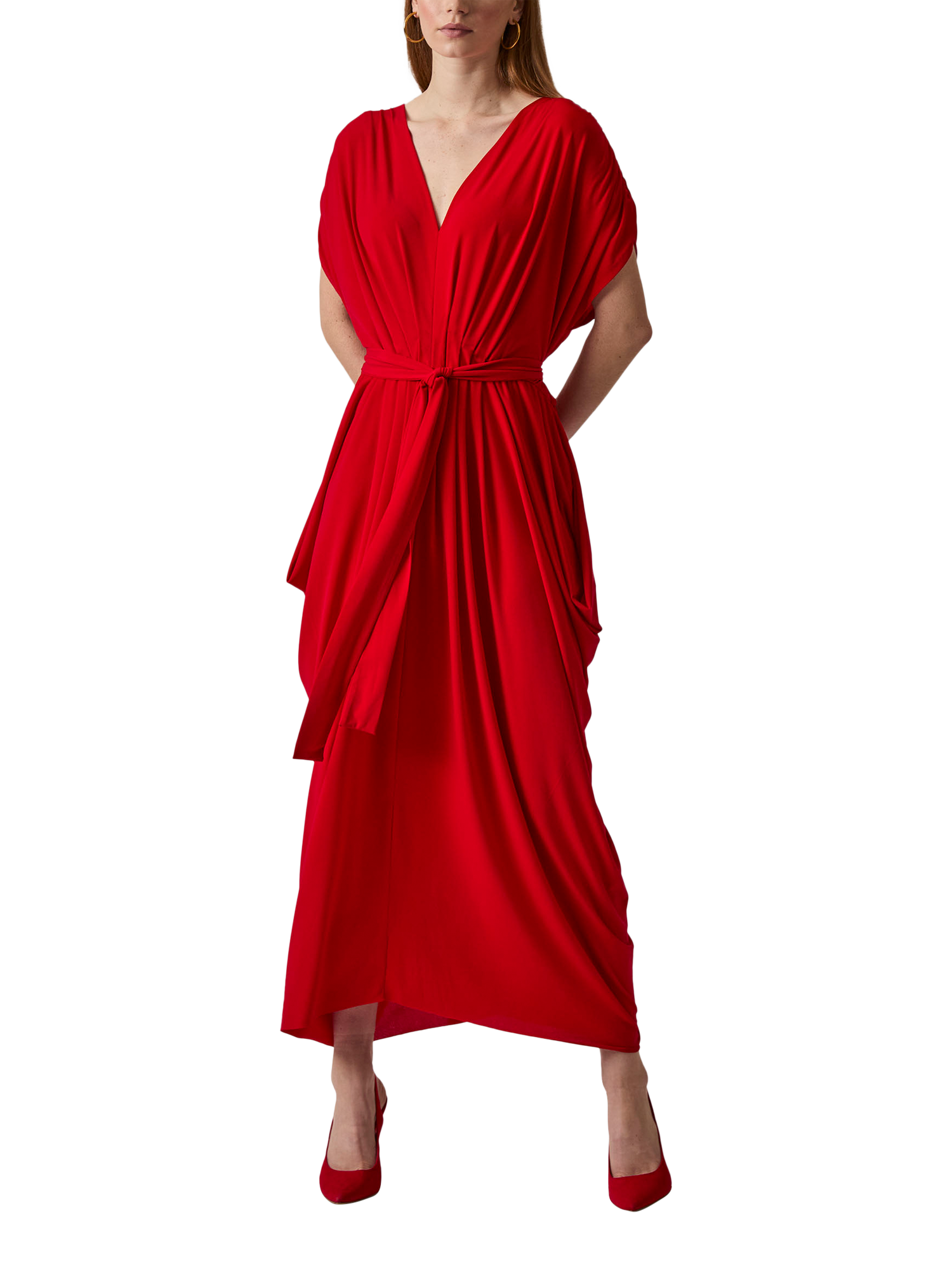 This James Lakeland Draped Maxi Dress embodies Grecian elegance with a deep V-neckline and soft, flowing fabric. A cinched waist and matching belt enhance the shape, while dramatic batwing sleeves add movement. The back mirrors the front's V-cut, with a delicate strap for structure. The full-length skirt cascades gracefully with fluid draping, creating a striking silhouette.