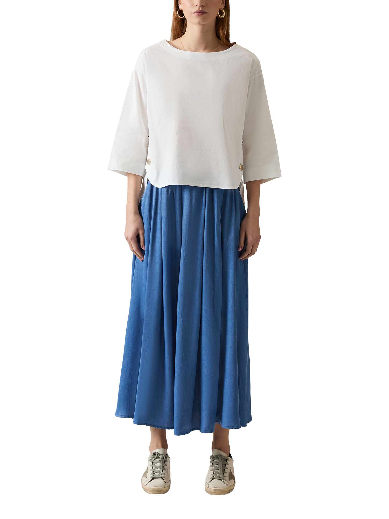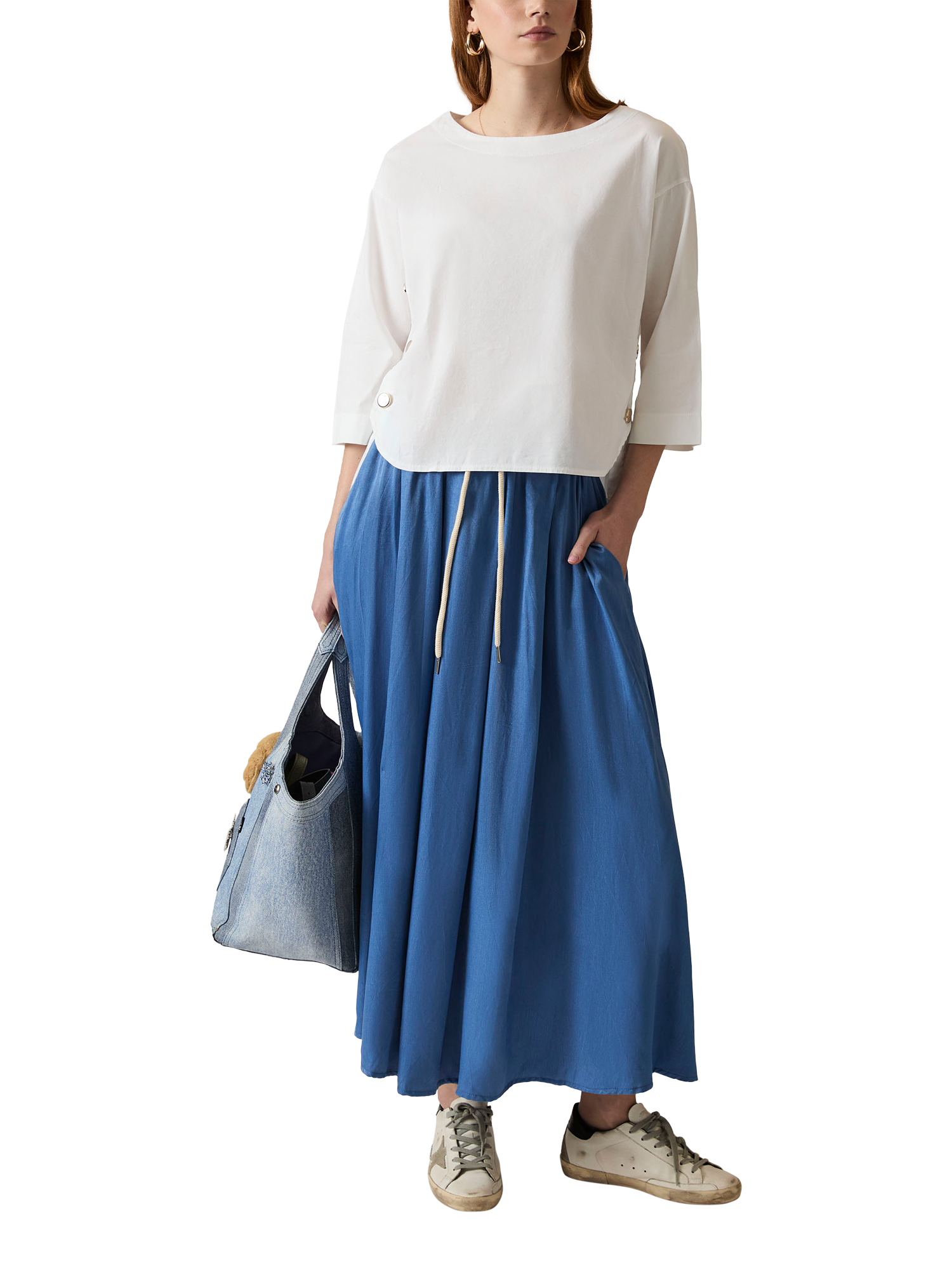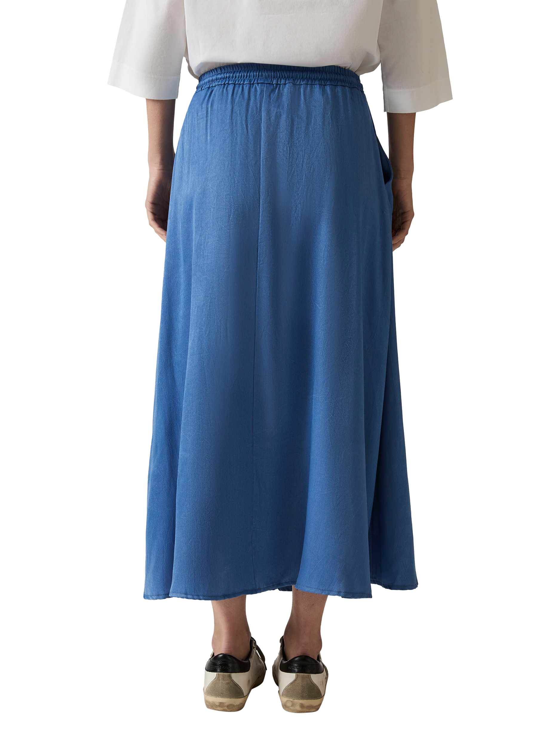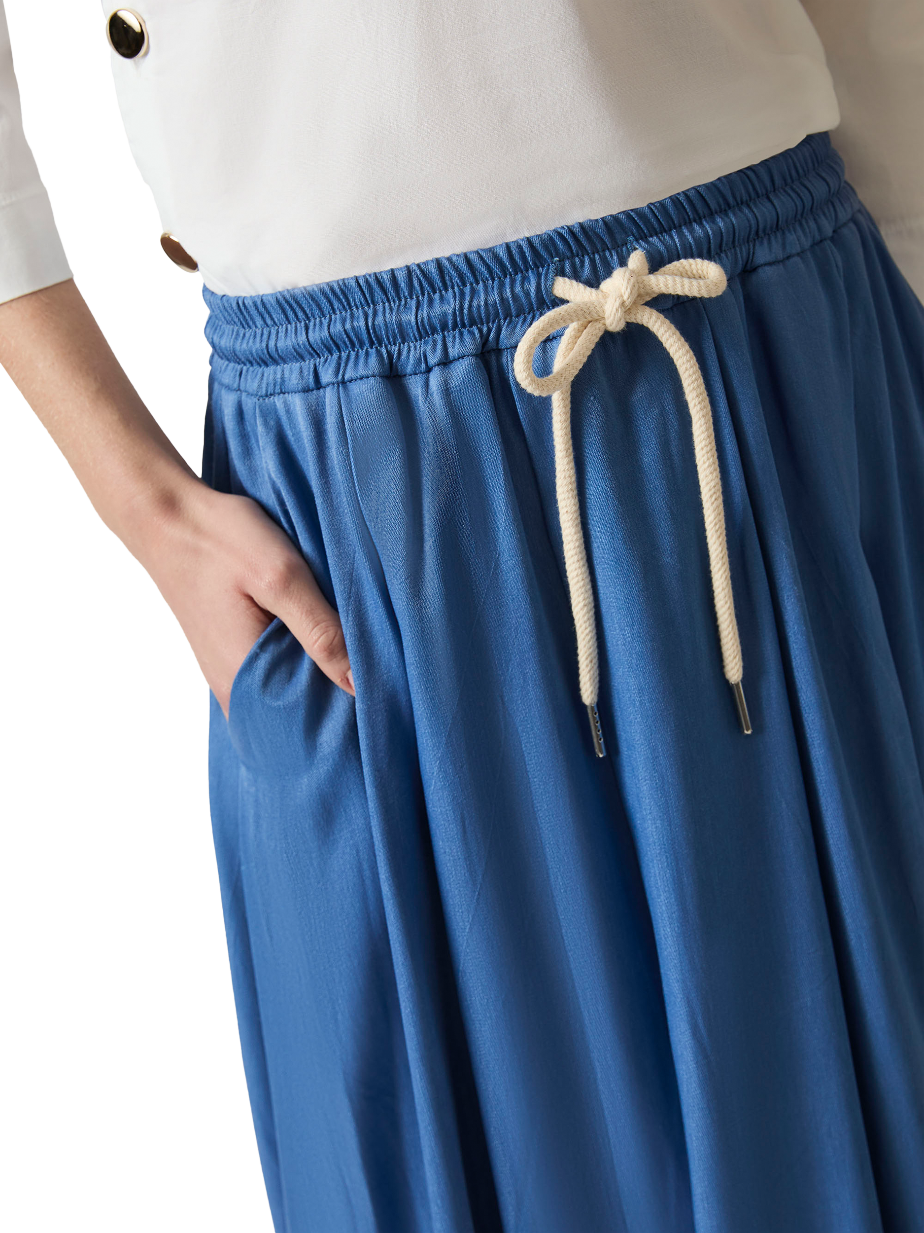 Elegant and versatile, this James Lakeland drawstring skirt reaches down to the ankles and features a loose, flowing design. The elastic waistband, adorned with a drawstring bow, ensures a comfortable and adjustable fit. It also includes convenient pockets on the sides for added functionality.