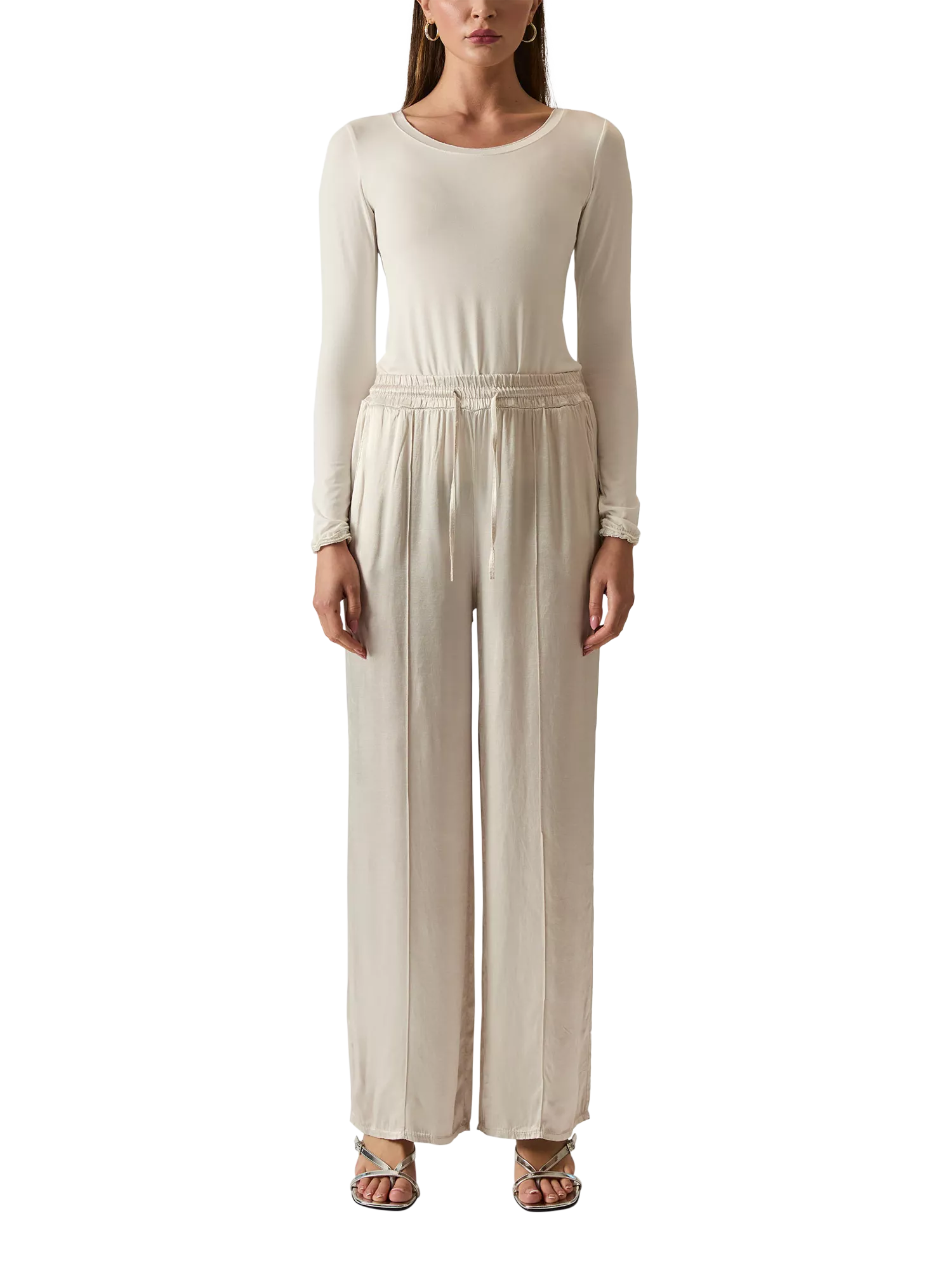 Enhance your everyday style with the James Lakeland satin finish wide-leg trousers. Crafted for both comfort and elegance, these trousers feature a soft elastic waistband with adjustable ties, two functional pockets, and a relaxed yet refined fit. Ideal for effortless day-to-night dressing.