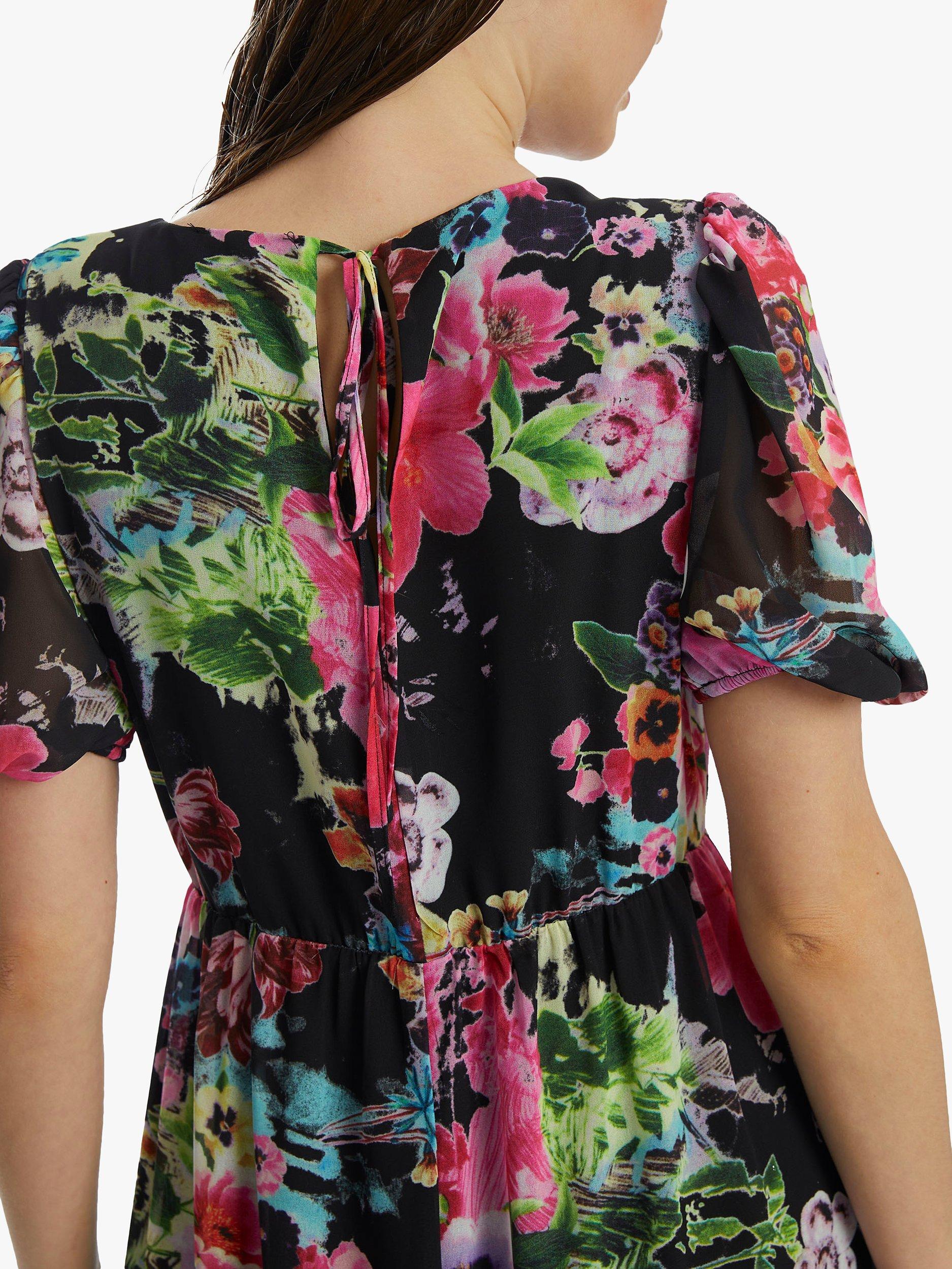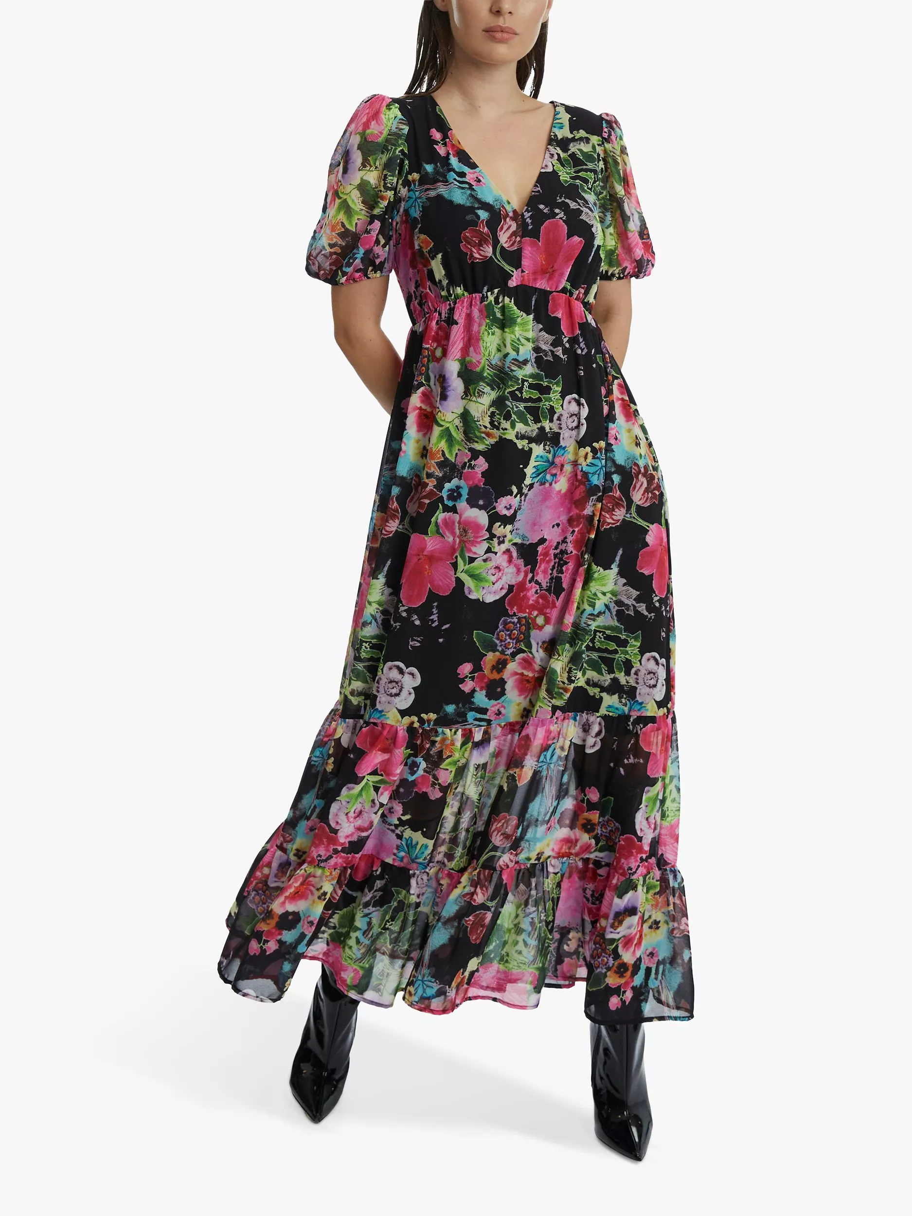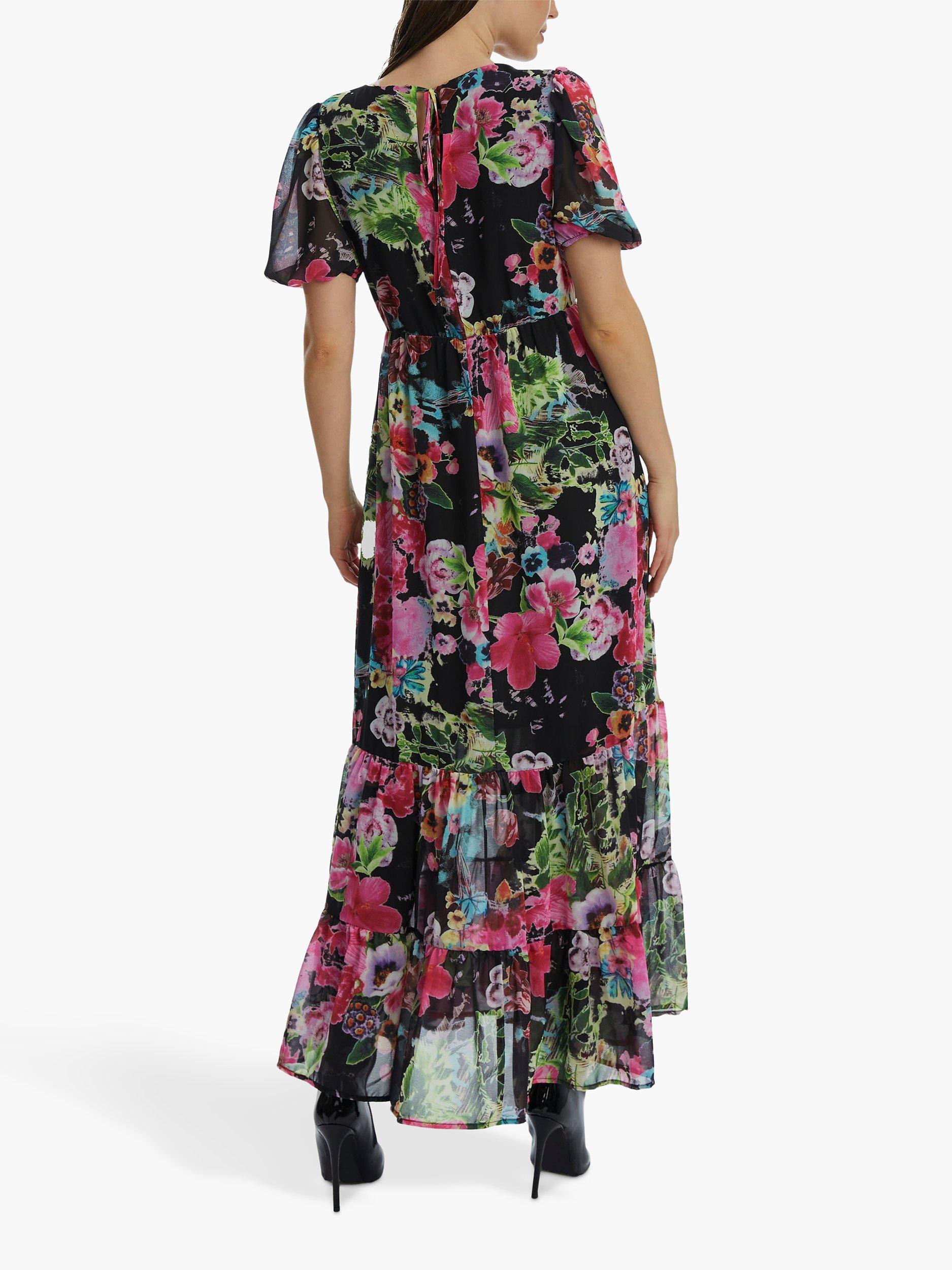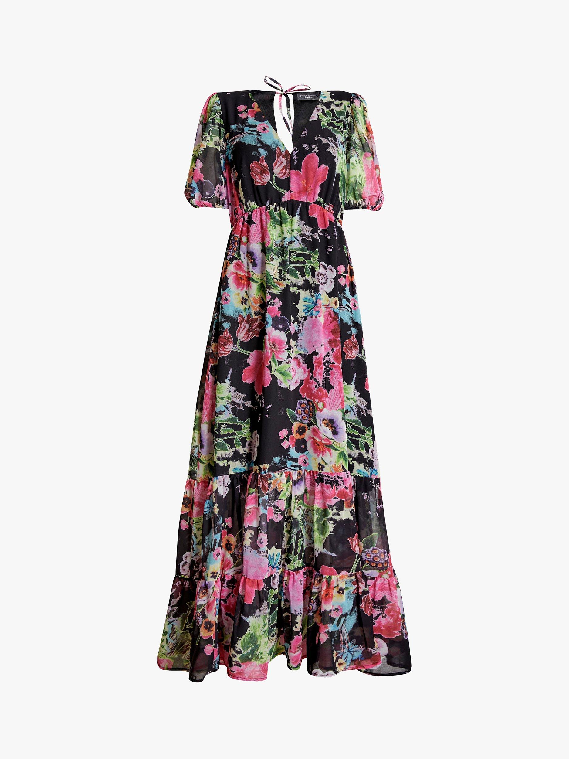 With tiers down its profile, this floor-length dress from James Lakeland comes in a fabric that's built to last. With a universally flattering v-neckline and short puffy sleeves, it blooms with joy through a refreshing floral print.