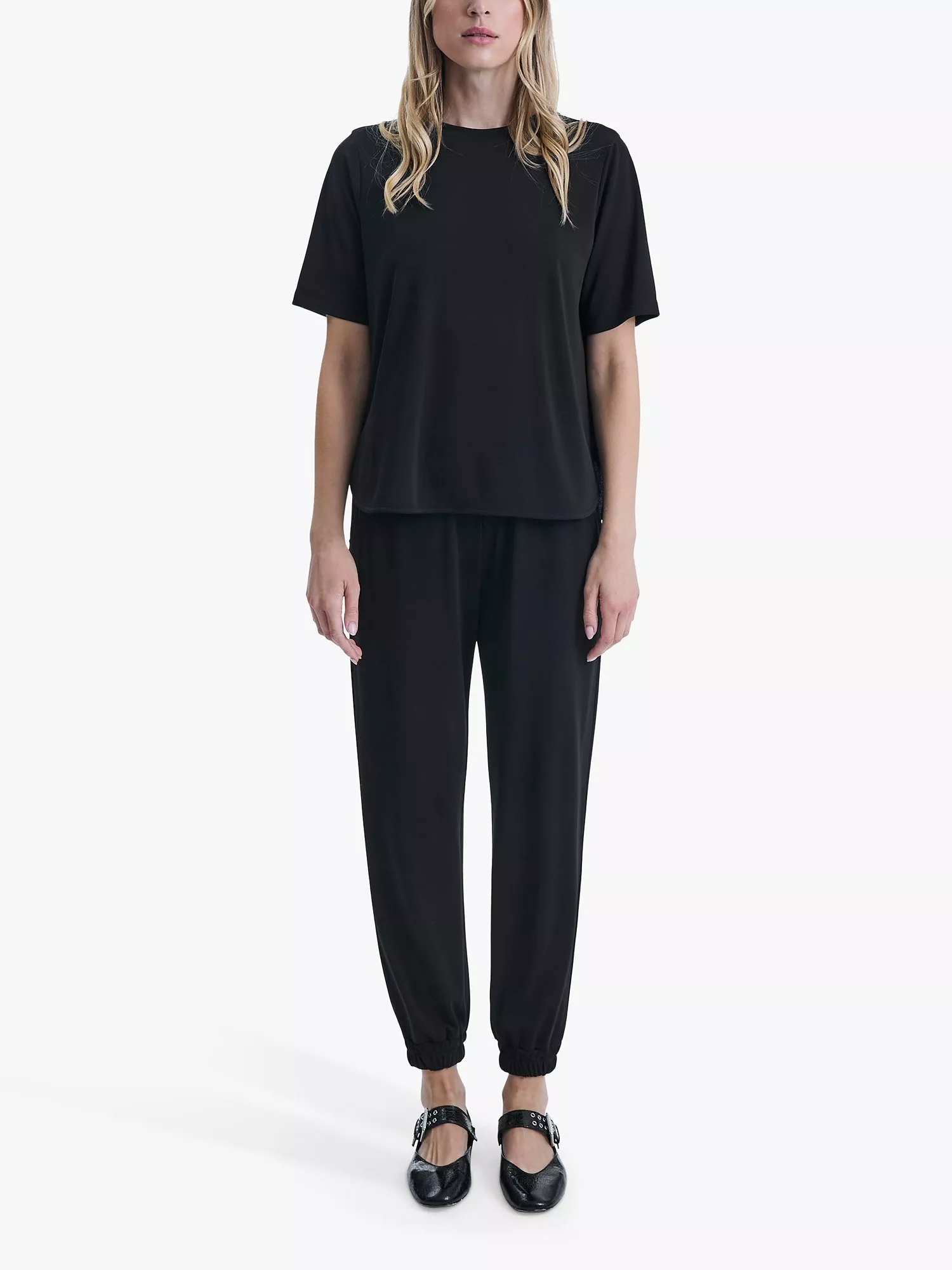 This wardrobe essential from James Lakeland boasts a relaxed cut and is crafted from technical fabric. Its substantial weight and stretch ensure exceptional comfort, while the crew neck and short sleeves enhance its versatility. The curved hem design creates slight openings on each side. Pair this T-shirt seamlessly with the Jersey Joggers and Long Cardigan for a perfect ensemble.