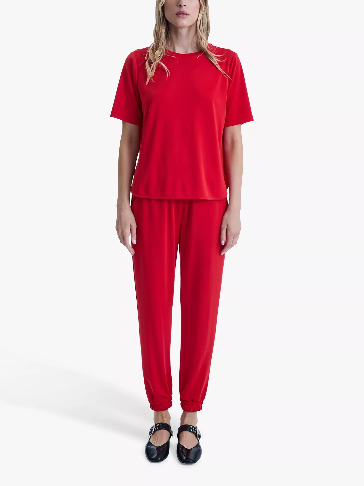 This wardrobe essential from James Lakeland boasts a relaxed cut and is crafted from technical fabric. Its substantial weight and stretch ensure exceptional comfort, while the crew neck and short sleeves enhance its versatility. The curved hem design creates slight openings on each side. Pair this T-shirt seamlessly with the Jersey Joggers and Long Cardigan for a perfect ensemble.
