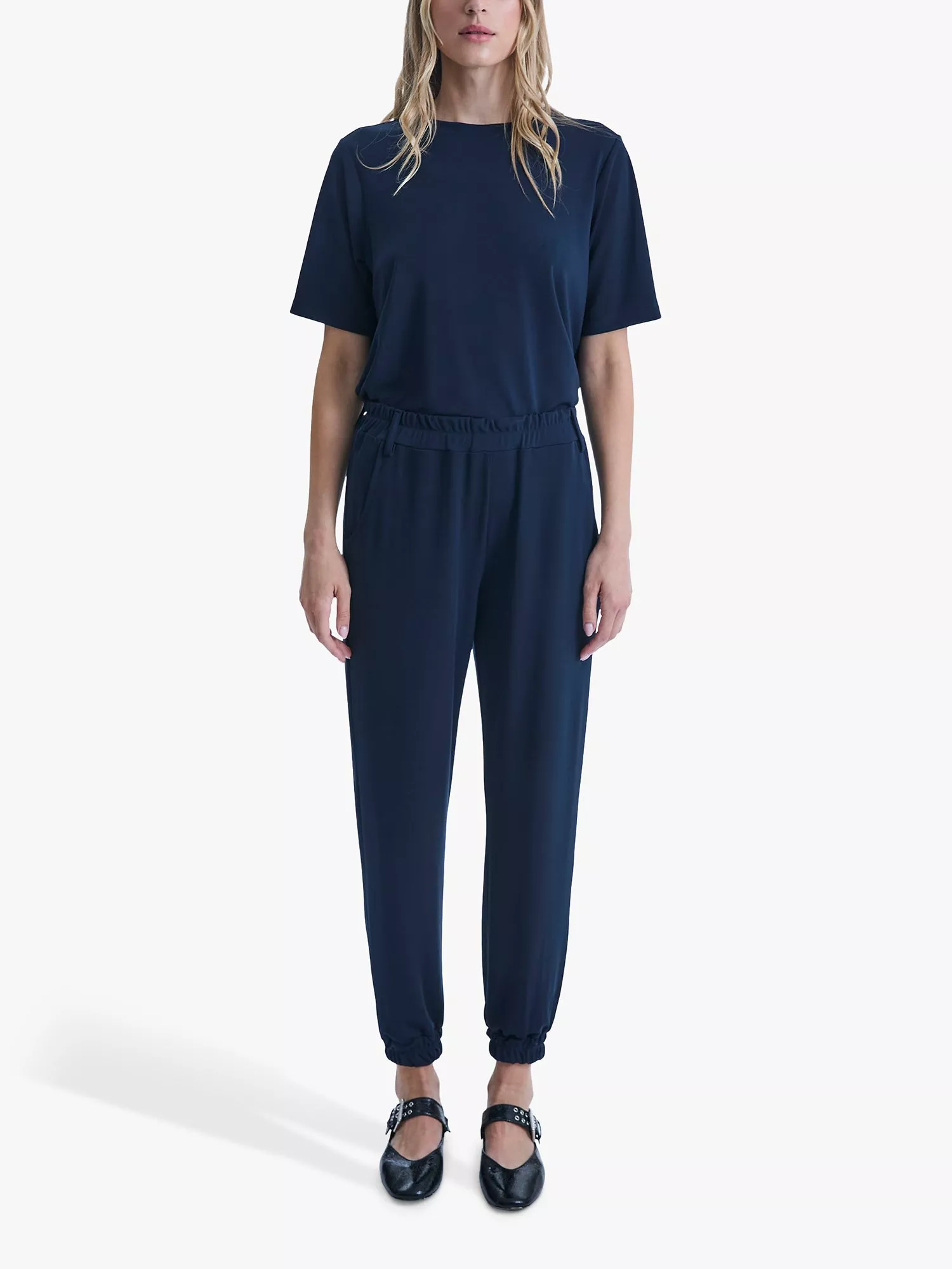Crafted from technical jersey fabric, these full-length James Lakeland Joggers offer the perfect blend of smart and casual style. The flowy stretch trousers provide exceptional comfort, while details like the ruched elasticated waistband with belt loops, two functional side pockets, and gathered ankles create an elongating effect for the legs.