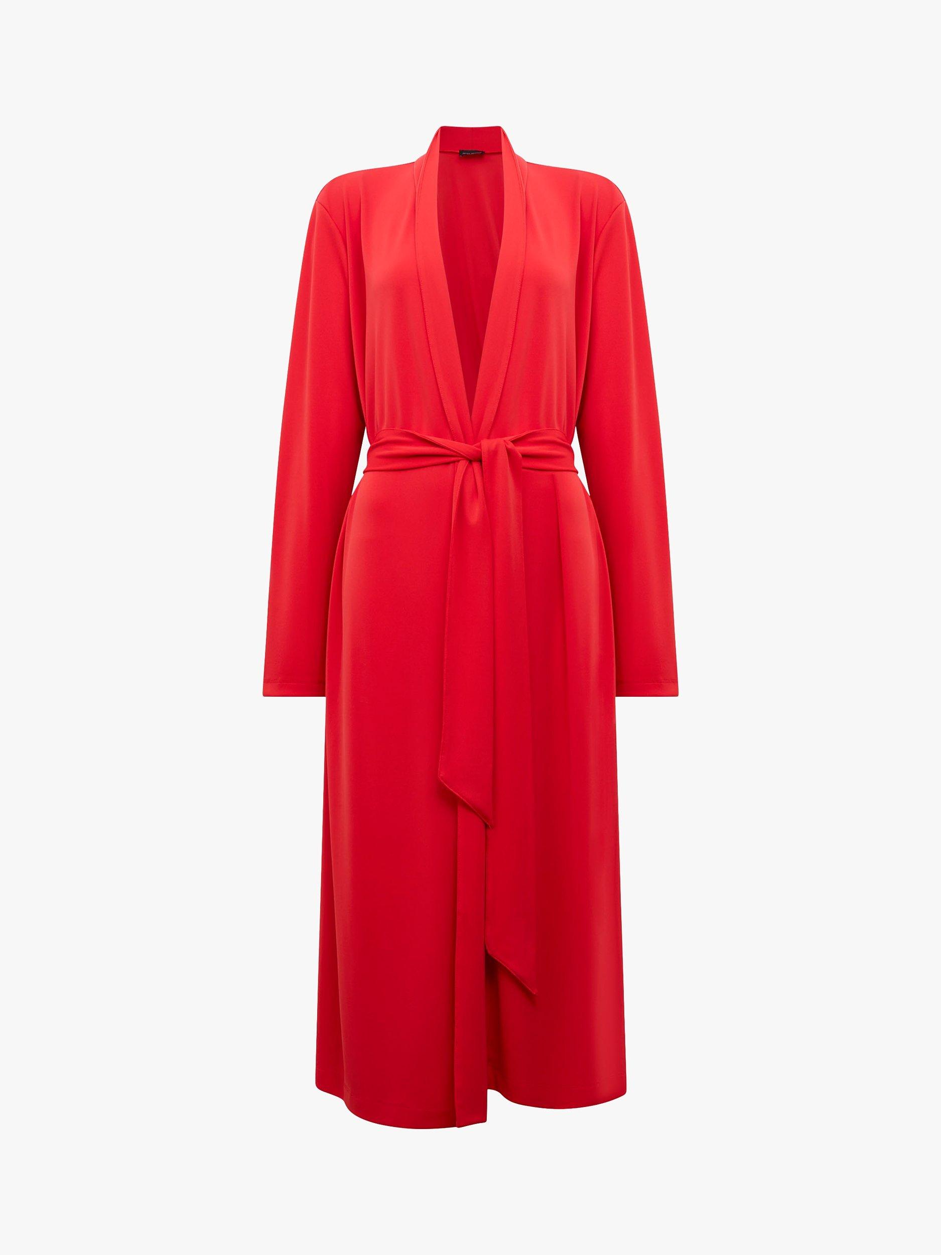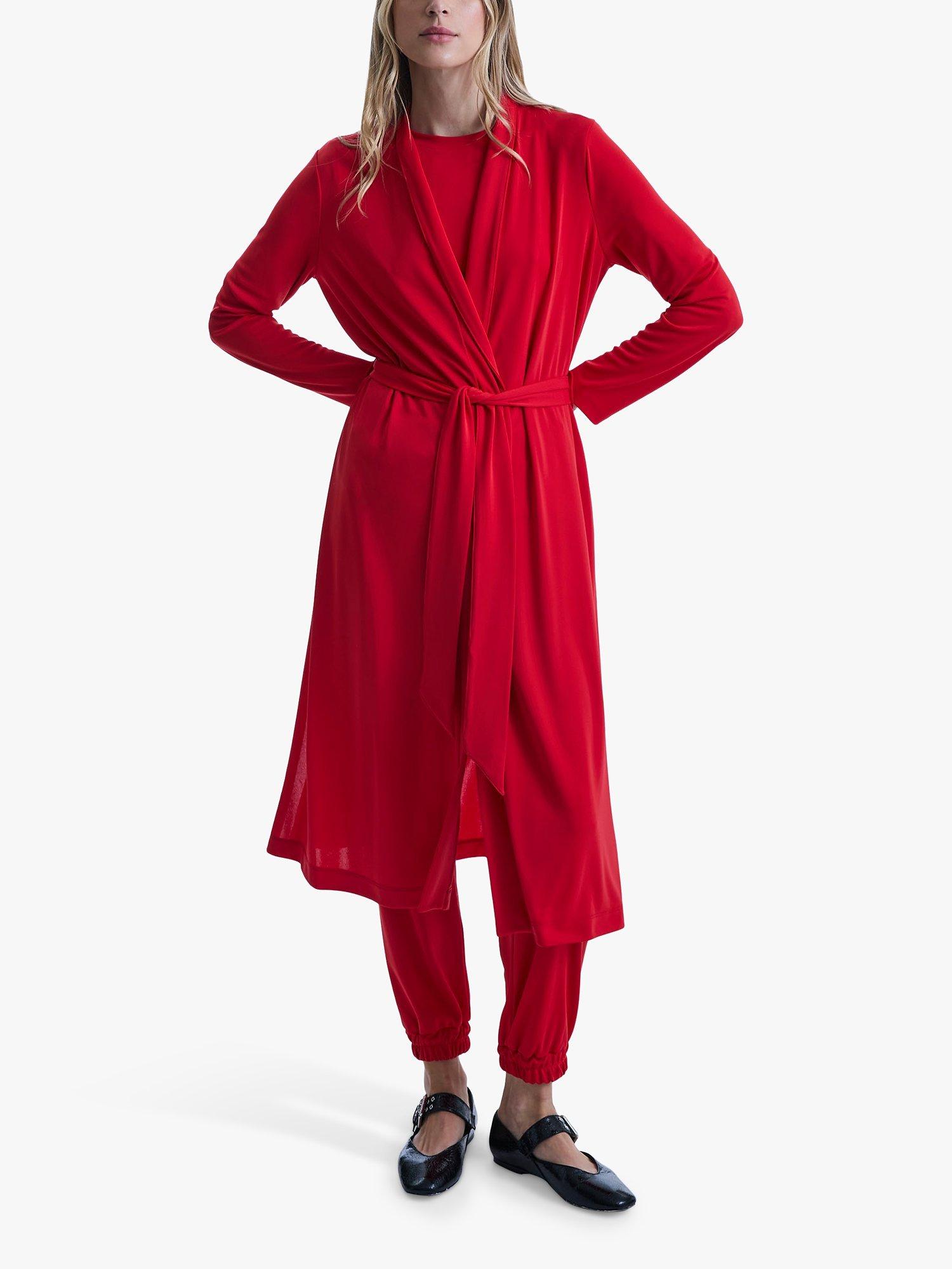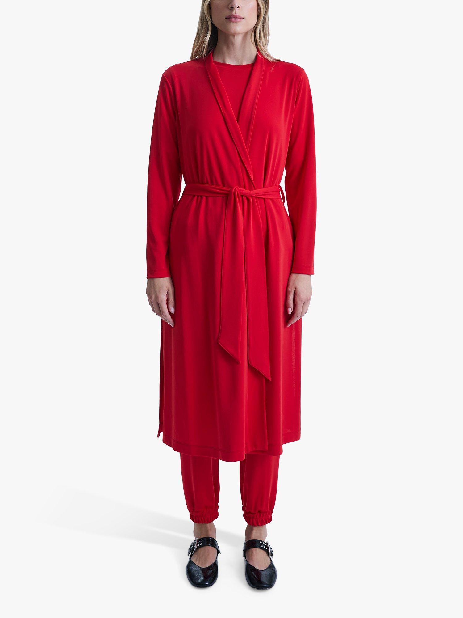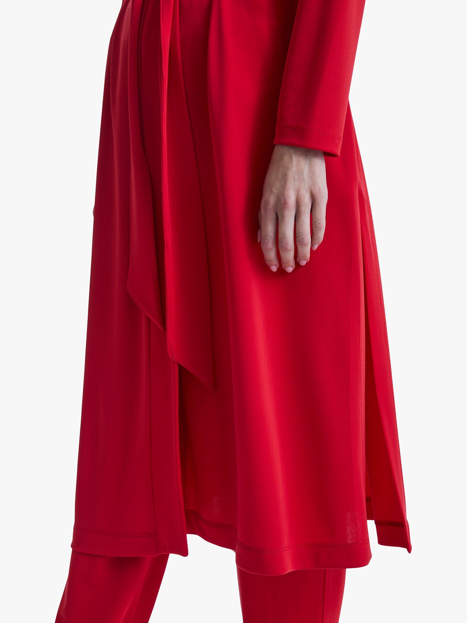 This elongated cardigan by James Lakeland features a sleek silhouette. Crafted from technical jersey, it offers excellent comfort due to its stretchy properties and substantial weight, resulting in a perfect drape. The waist can be cinched using a long sash belt from the same fabric. Wear it effortlessly with the Jersey T-shirt and joggers for a casual look.