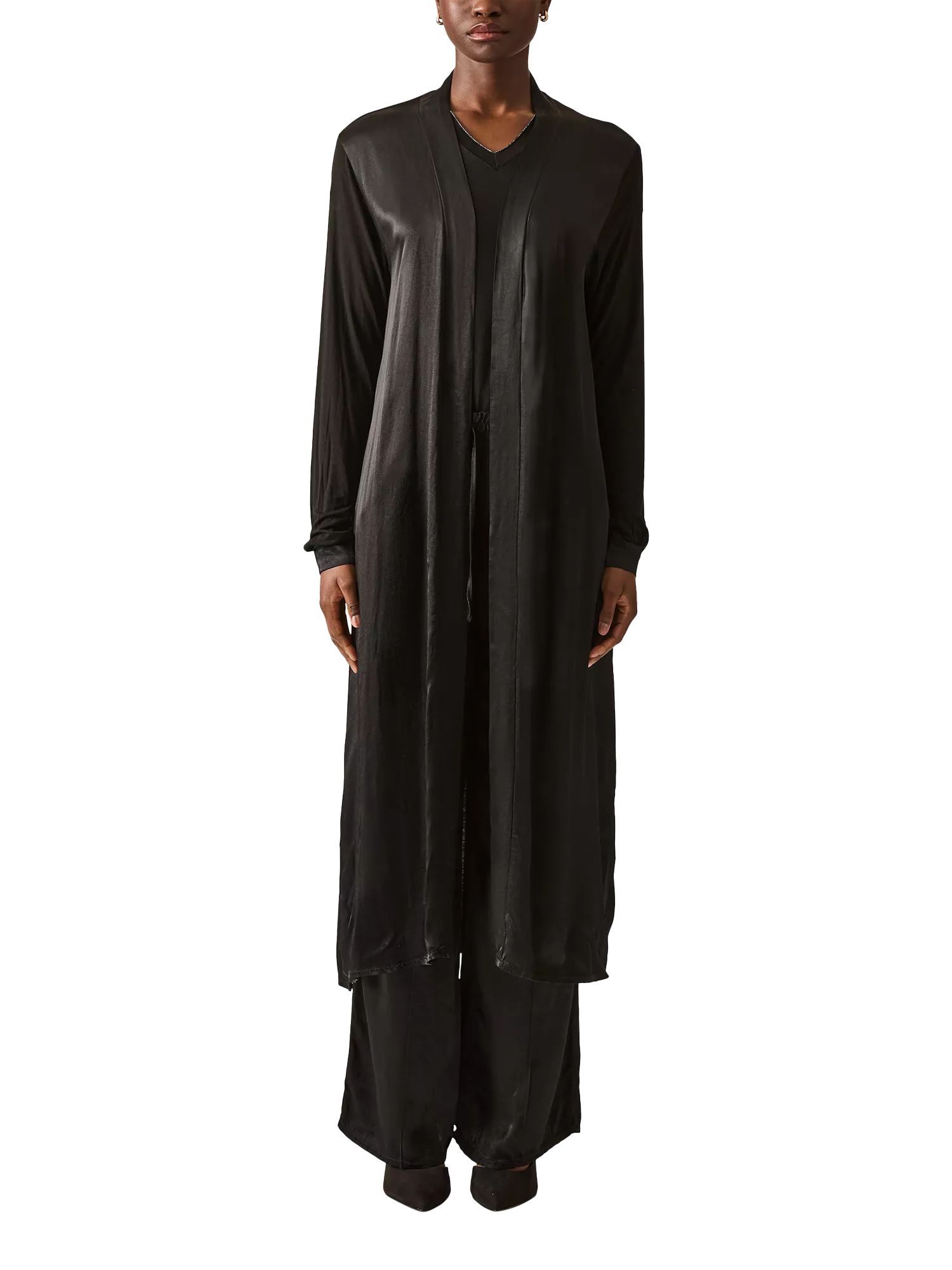 Wrap yourself in elegance with the James Lakeland Long Satin Finish Cardigan. Featuring a sleek satin front with stitched border and soft jersey back, it drapes beautifully. Practical pockets and lightweight design make it perfect for any occasion. Wear it with matching top and trousers for a coordinated look.