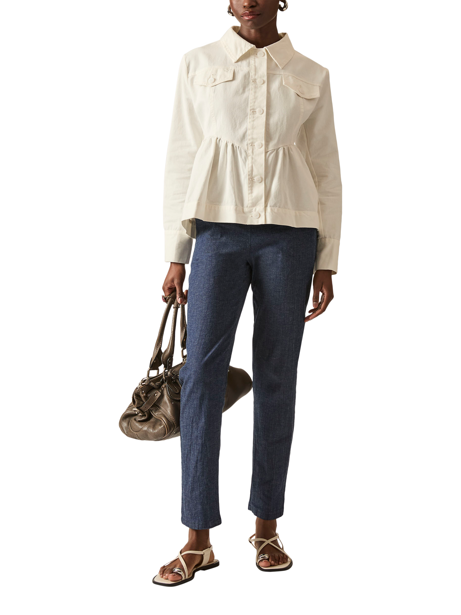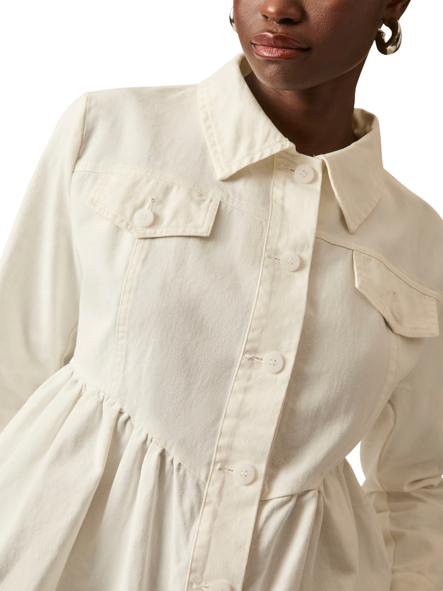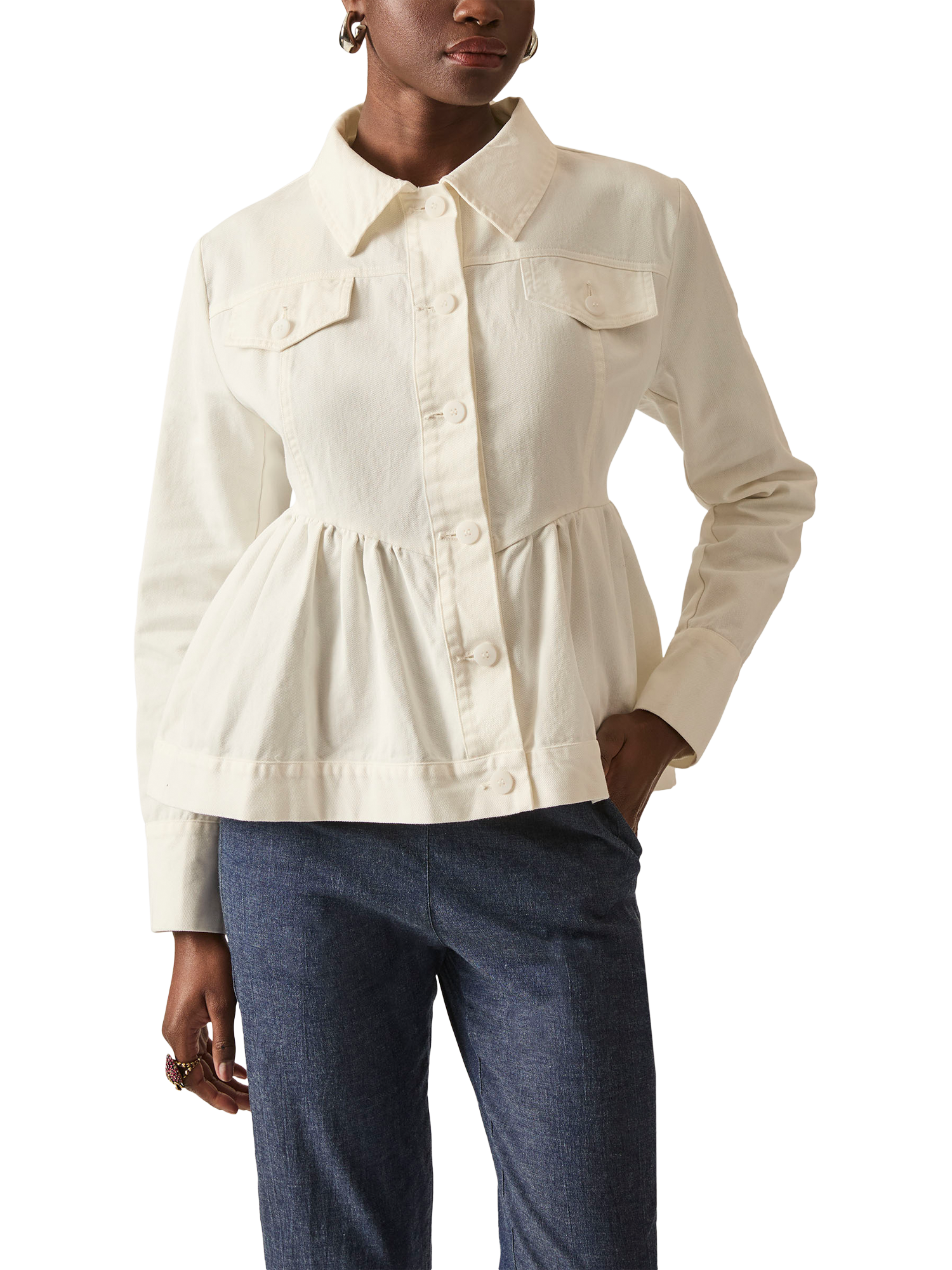 Elevate your style with the Peplum Denim Jacket by James Lakeland. This chic jacket features a button-down front, chest pockets with button flaps, and a feminine peplum design. Perfect for casual or sophisticated looks. Made from cotton denim for comfort and durability.