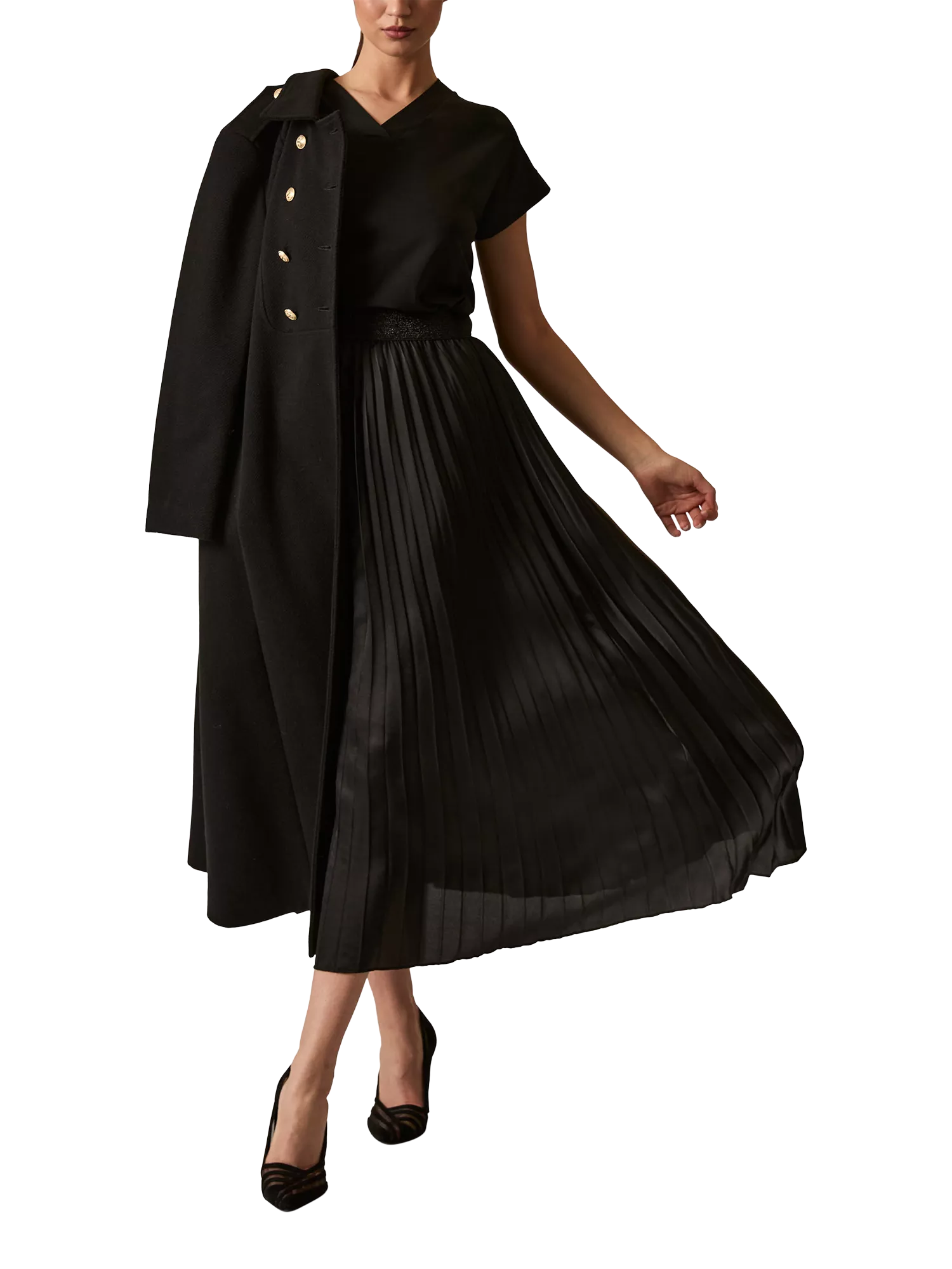 The James Lakeland pleated maxi skirt with high waist and textured waistband. Crisp vertical pleats create elegant movement and an A-line silhouette with a relaxed, flowing fit. A versatile piece for refined daywear or elevated evening looks.