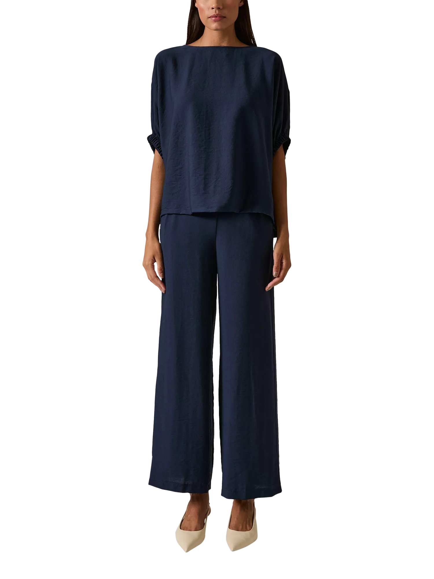 The Gathered Blouse by James Lakeland, featuring gathered batwing sleeves that fall to the elbow and a clean, round neckline. Cut in lightweight fabric with an oversized silhouette, it offers fluid movement and effortless sophistication for versatile styling.
