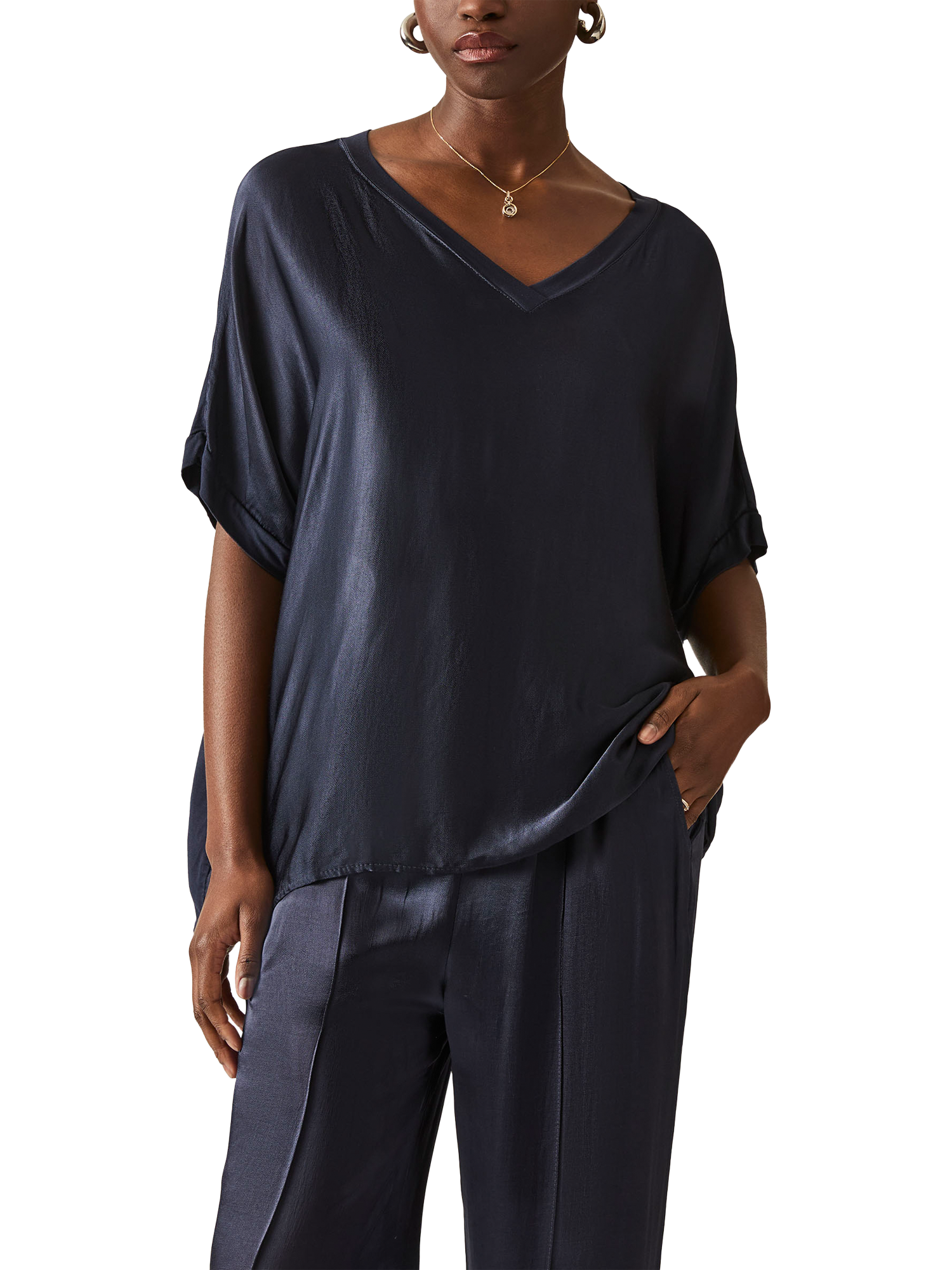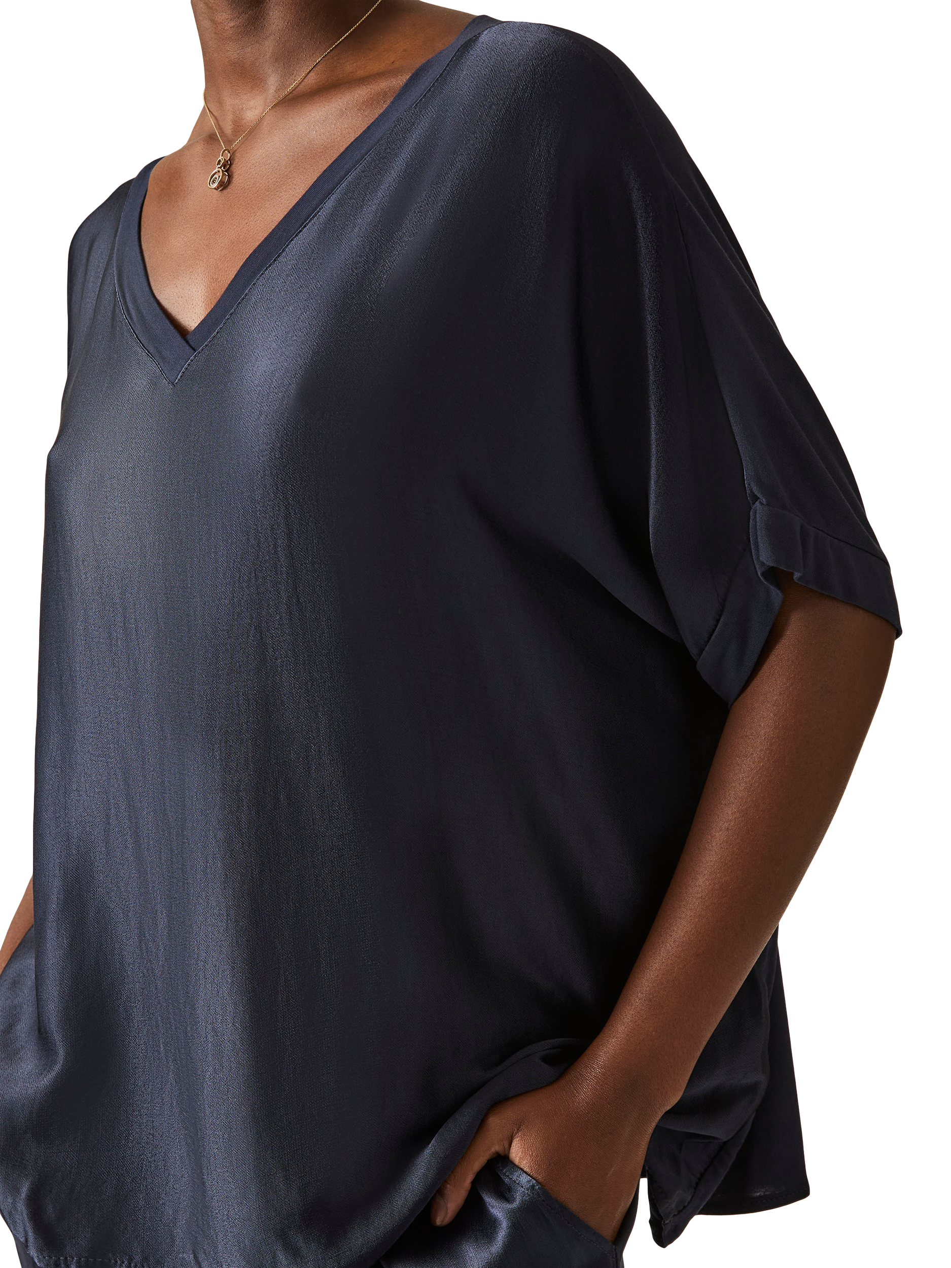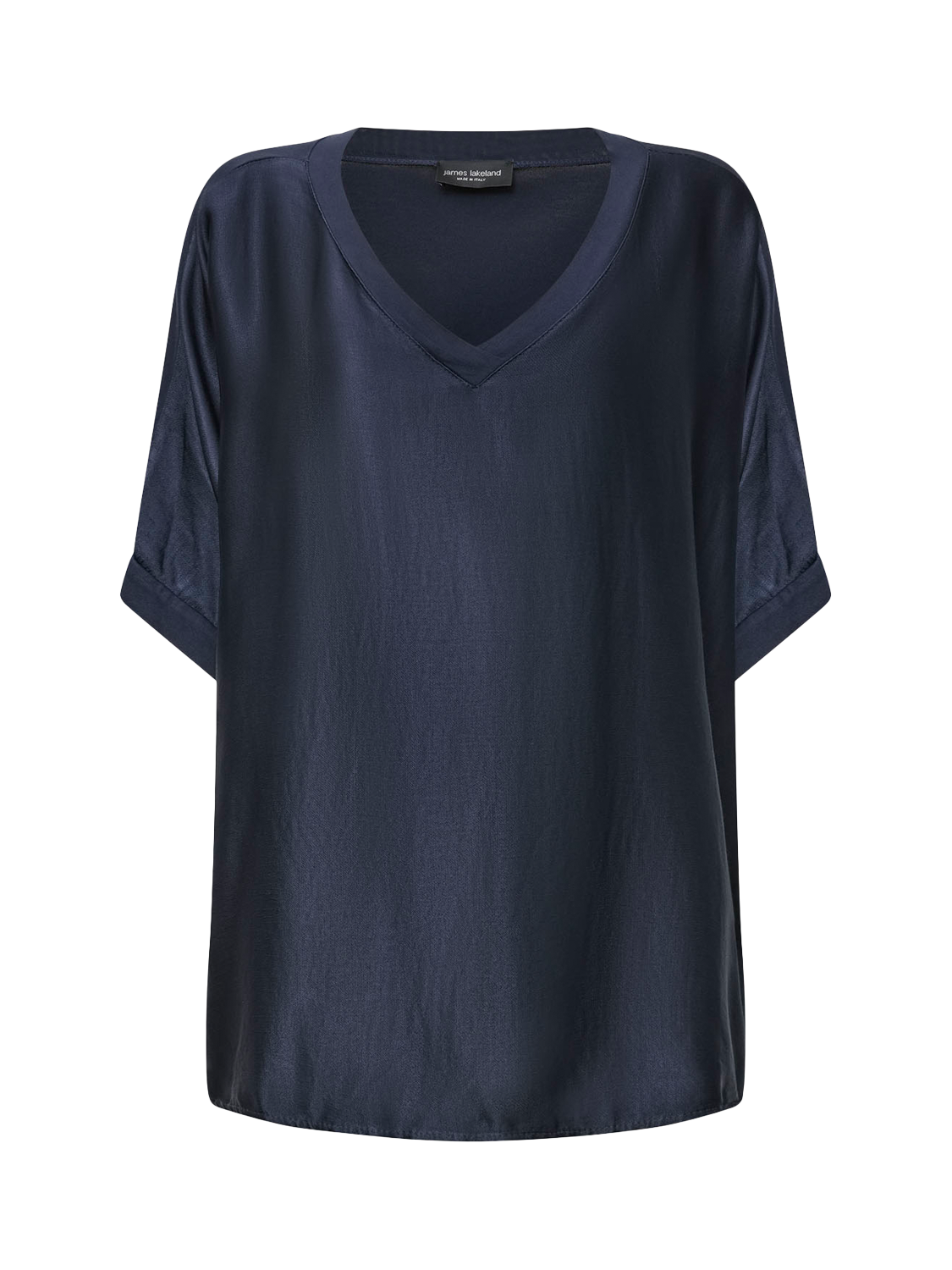 Elevate your look with the James Lakeland Navy Satin V-Neck Short Sleeve Top. Featuring a front satin feel finish and soft jersey back, this top offers elegance and comfort. Relaxed fit, V-neckline, short sleeves with slight cuff. Perfect for any occasion, pair it with matching navy trousers and cardigan.