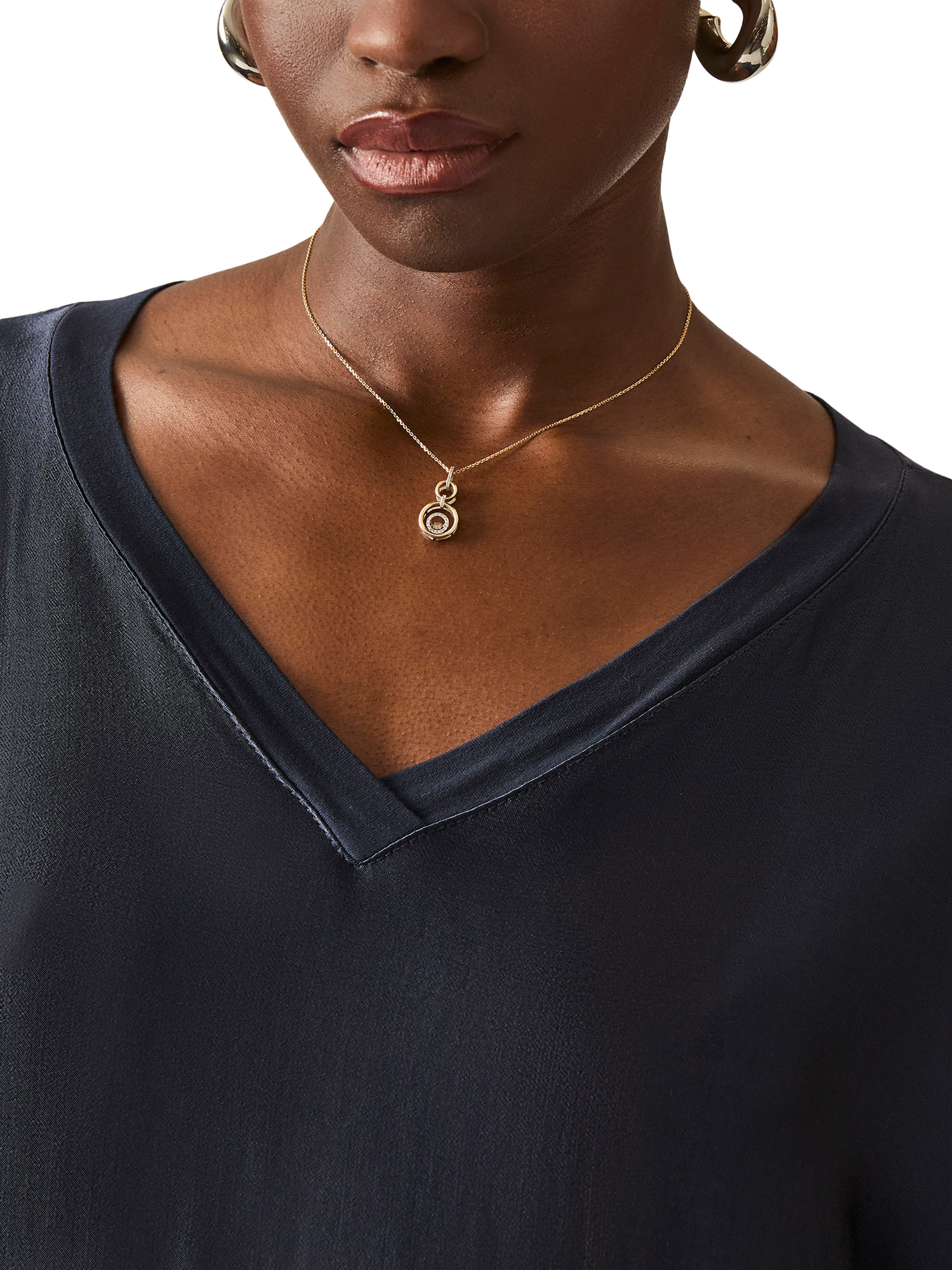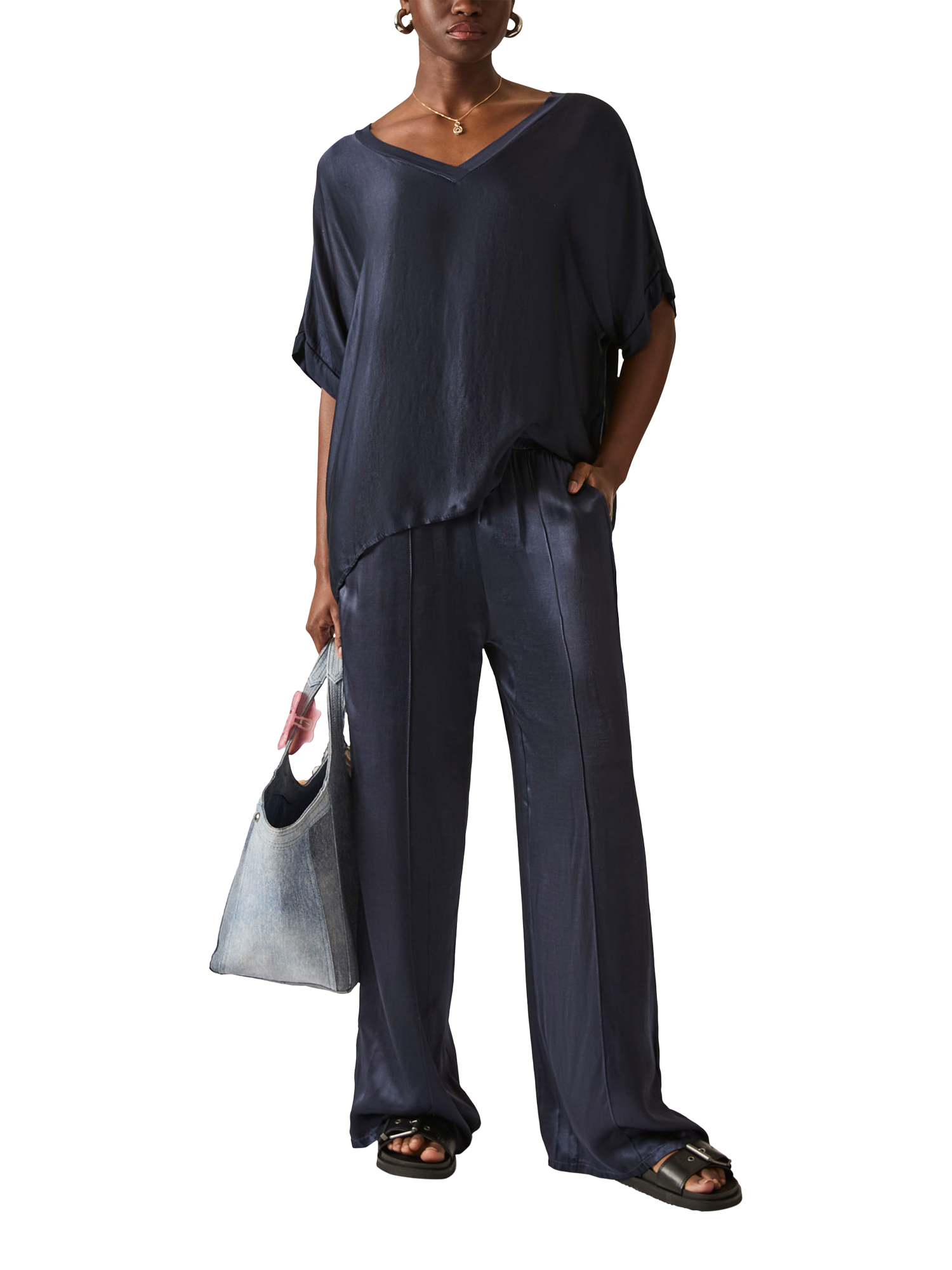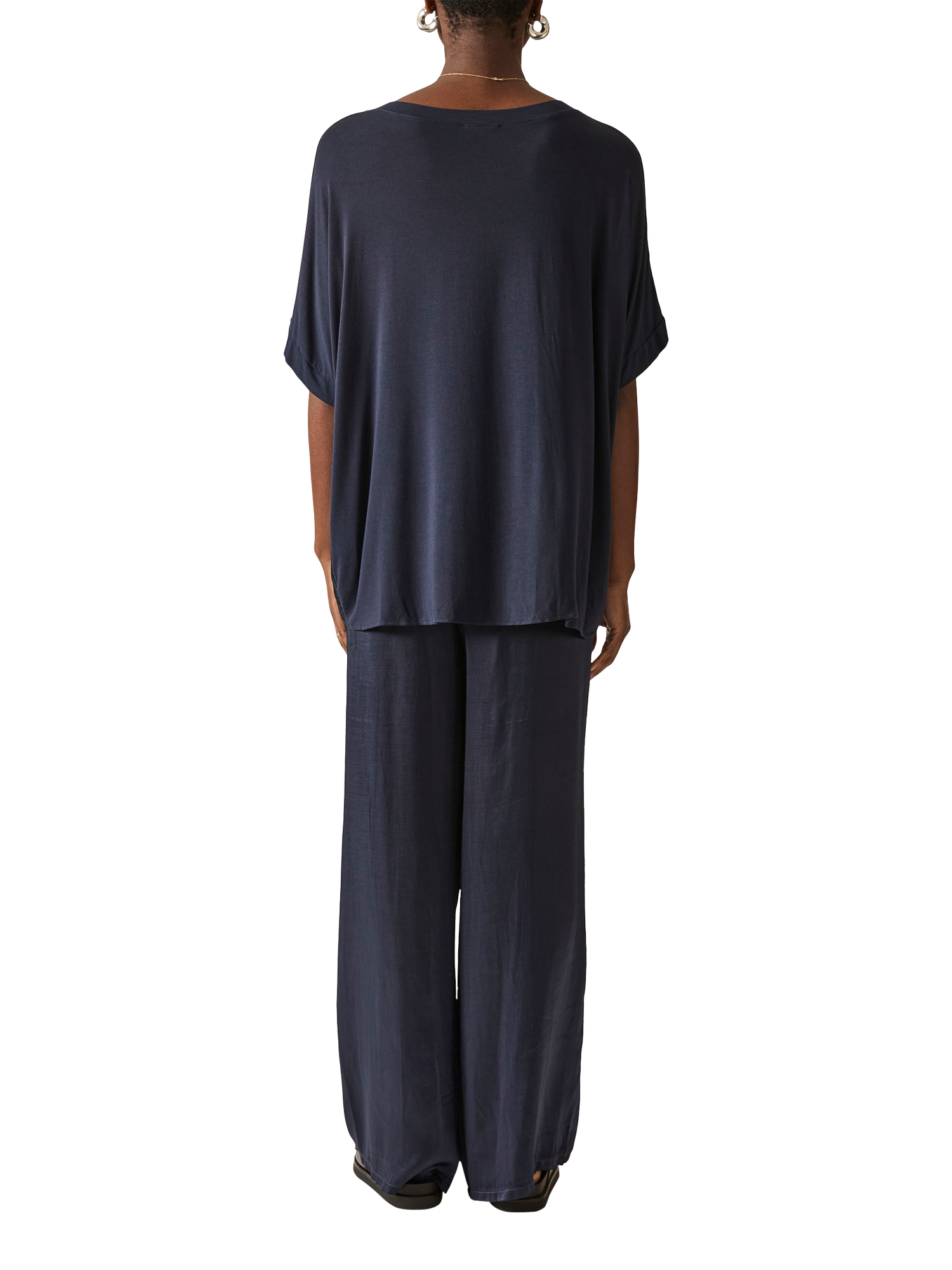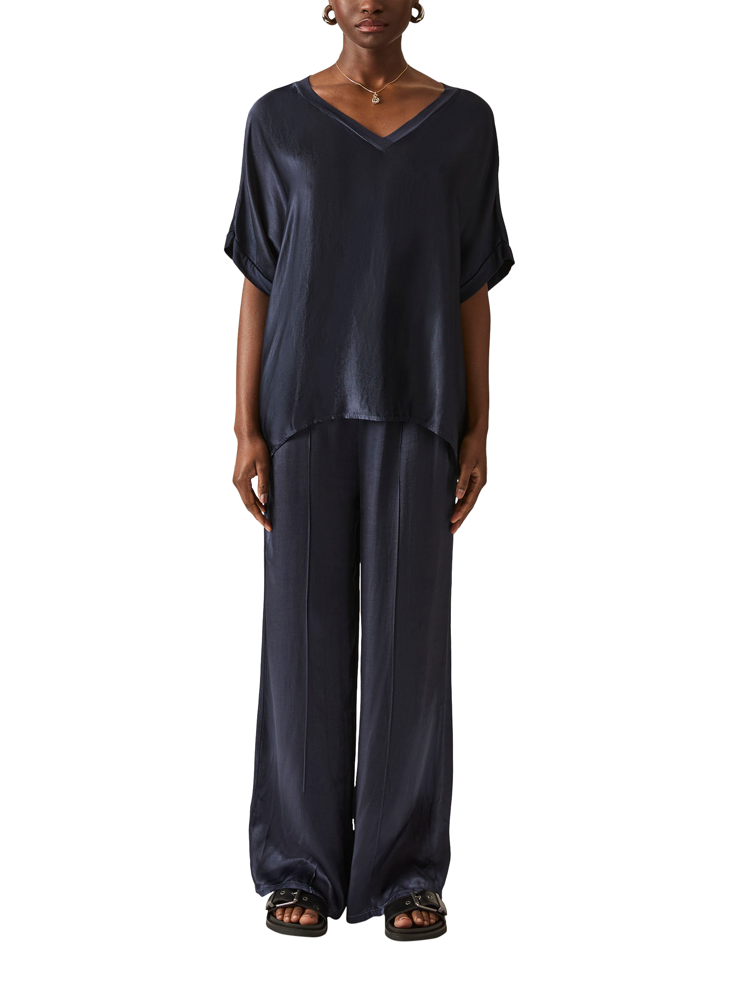Elevate your look with the James Lakeland Navy Satin V-Neck Short Sleeve Top. Featuring a front satin feel finish and soft jersey back, this top offers elegance and comfort. Relaxed fit, V-neckline, short sleeves with slight cuff. Perfect for any occasion, pair it with matching navy trousers and cardigan.