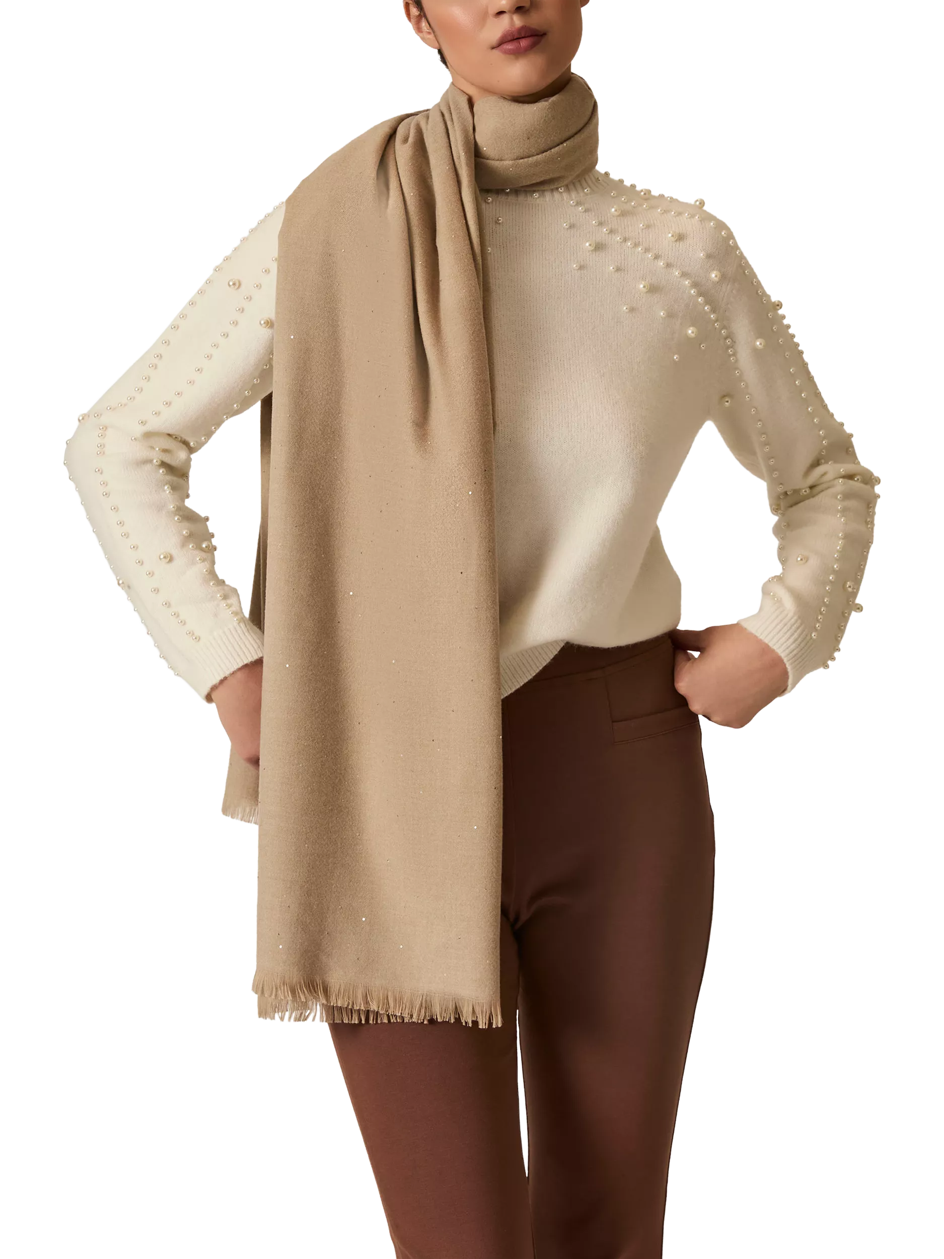 Chic scarf adorned with scattered contrasting sequins for subtle sparkle. A versatile, stylish accessory that adds texture and shine to any outfit.