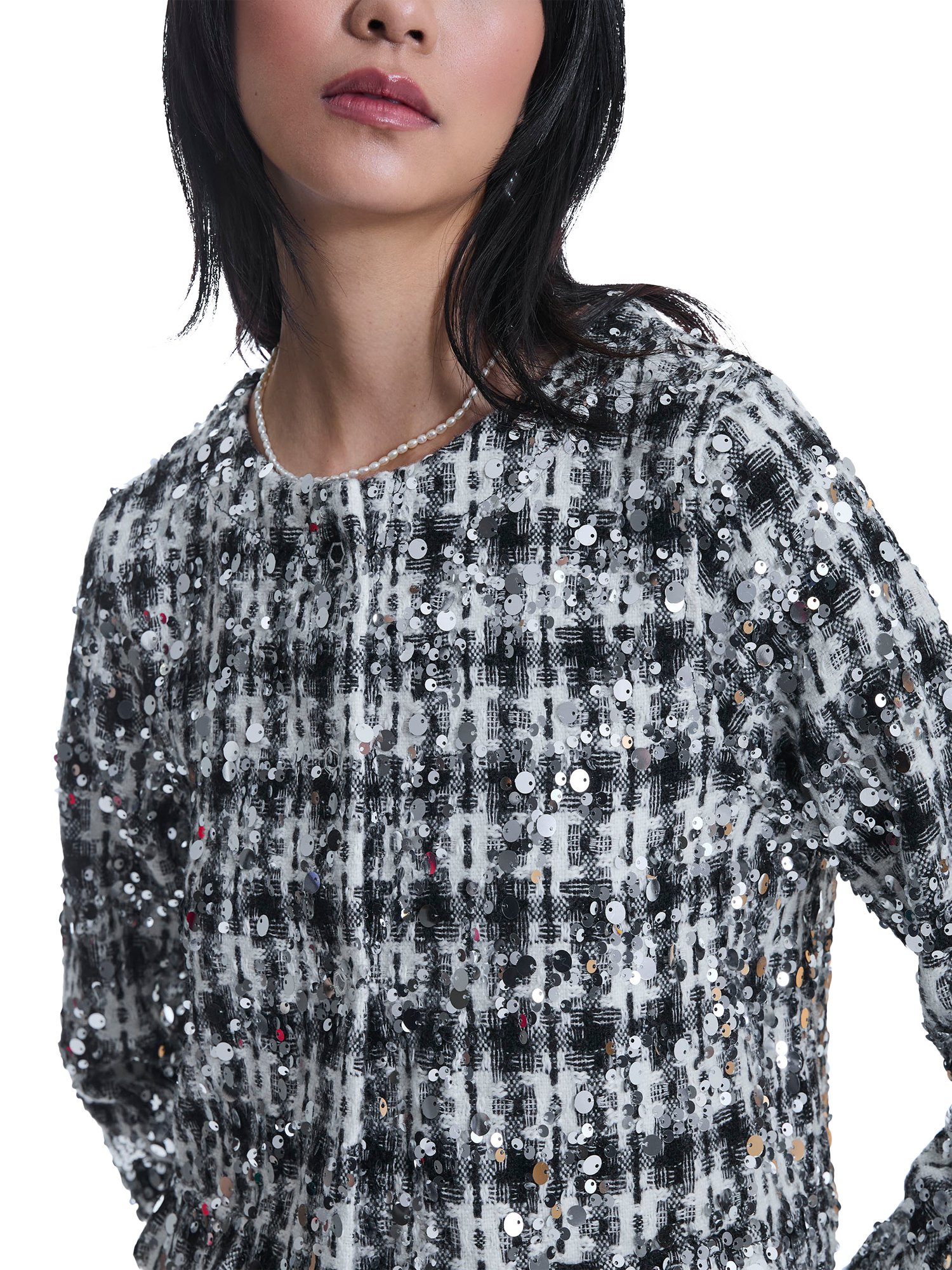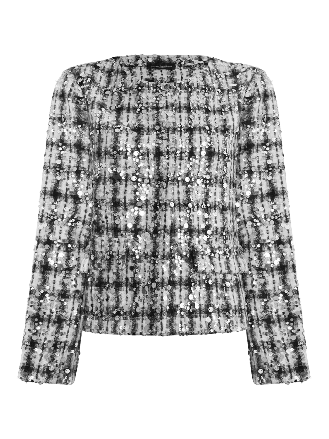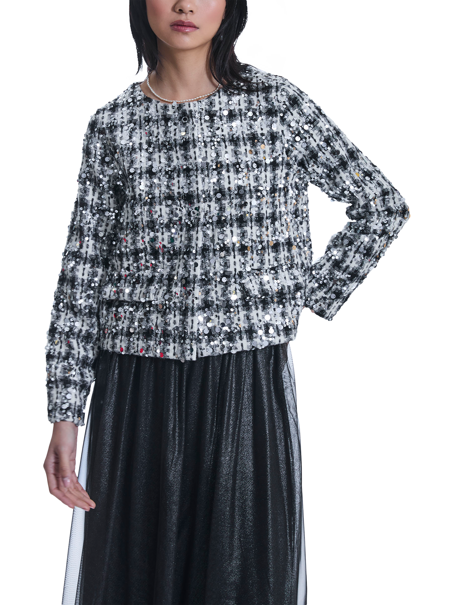 This modern take on a classic tweed jacket, is an original James Lakeland design. Featuring beautiful sequins, of odd sizes, scattered all over this short jacket. Closing at the front with invisible snap buttons, up to a round collar. Two faux flap pockets on each side, tie the overall aesthetic of the jacket.