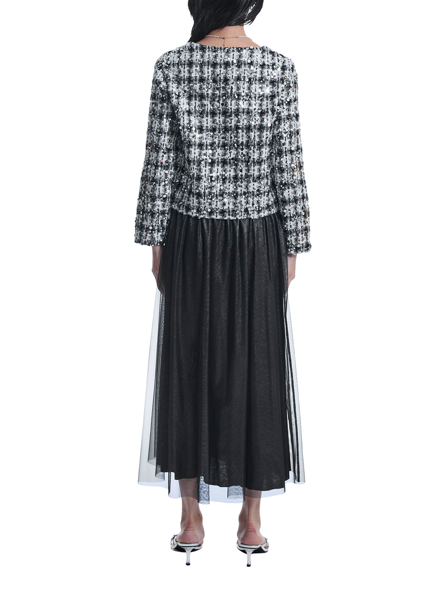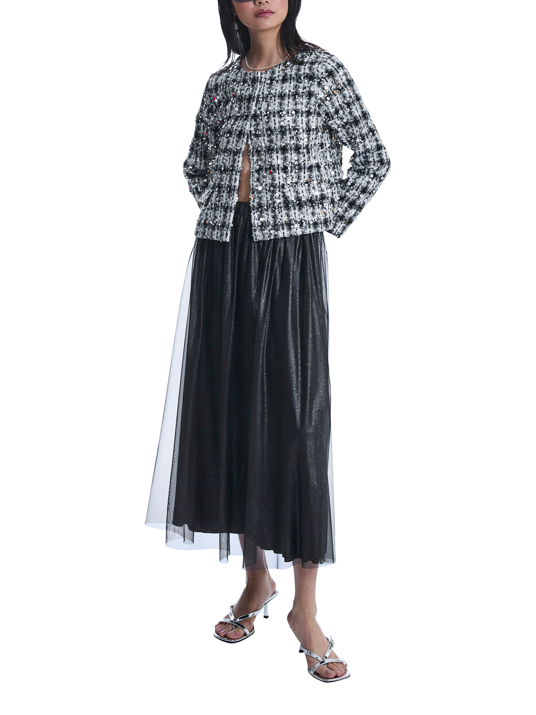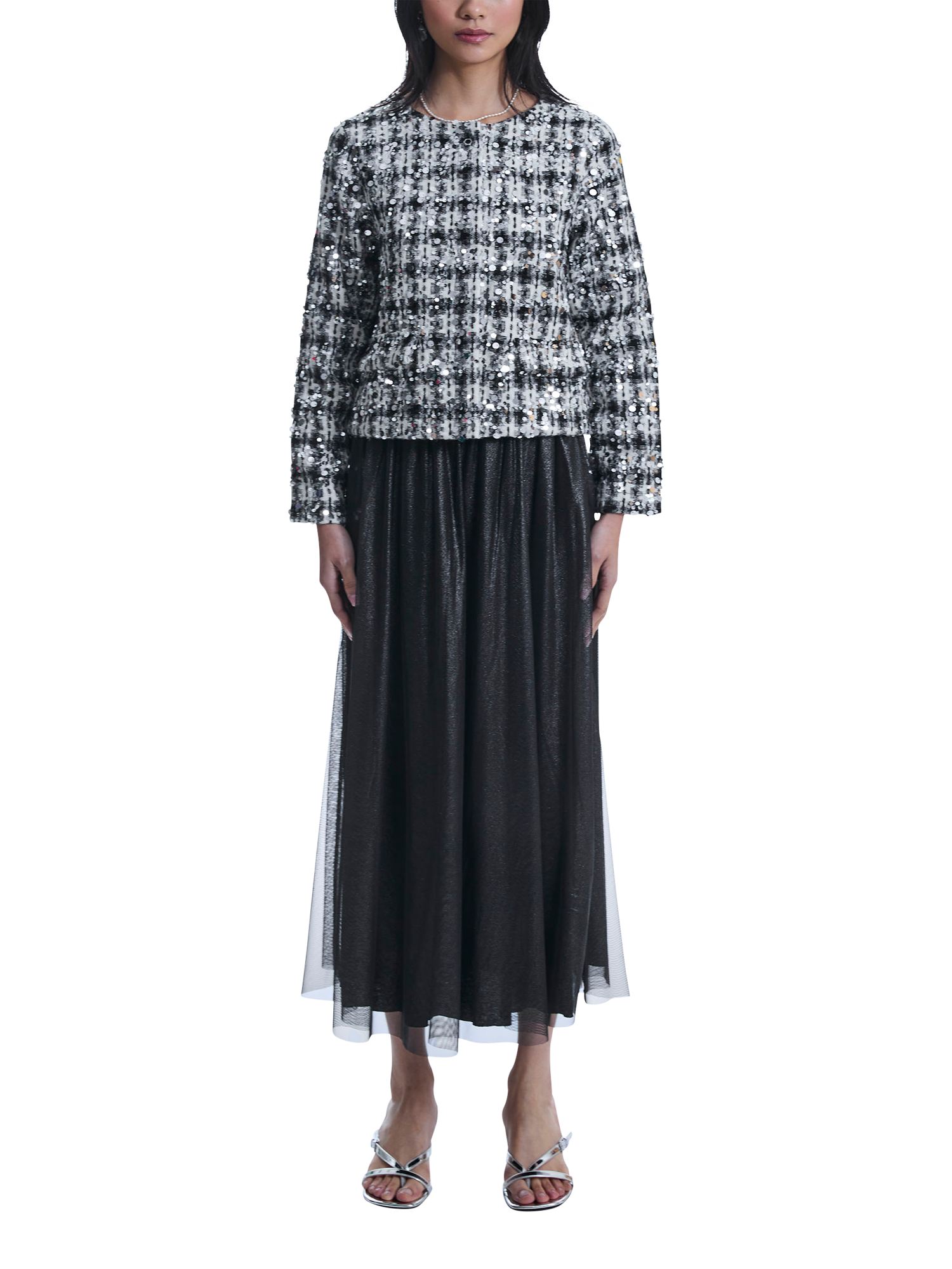 This modern take on a classic tweed jacket, is an original James Lakeland design. Featuring beautiful sequins, of odd sizes, scattered all over this short jacket. Closing at the front with invisible snap buttons, up to a round collar. Two faux flap pockets on each side, tie the overall aesthetic of the jacket.