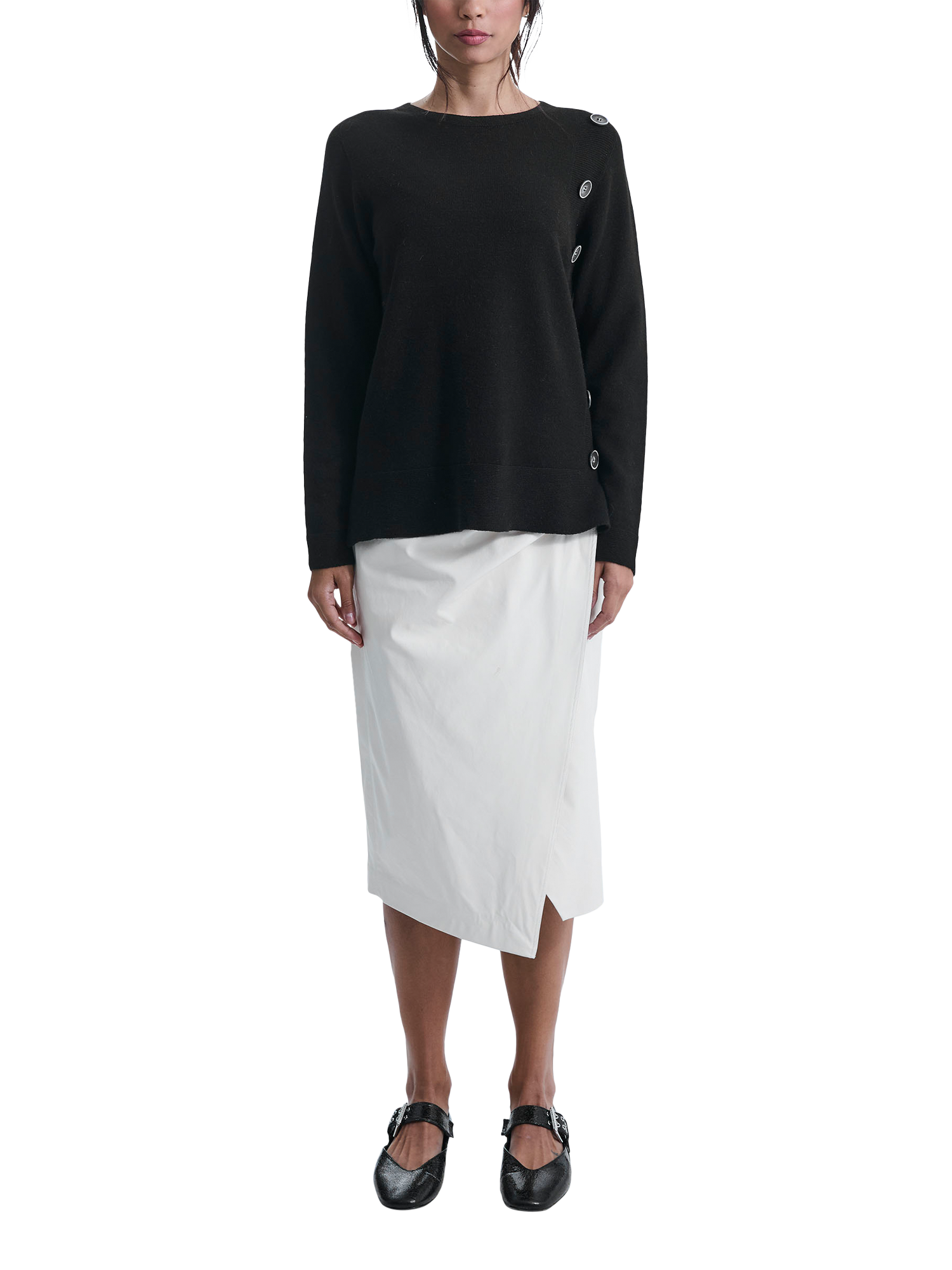 An elegant James Lakeland knitted jumper with side button details. Small side slits offer comfort and versatility, perfect for tucking in. The round neckline and long sleeves make it a timeless piece for any season.