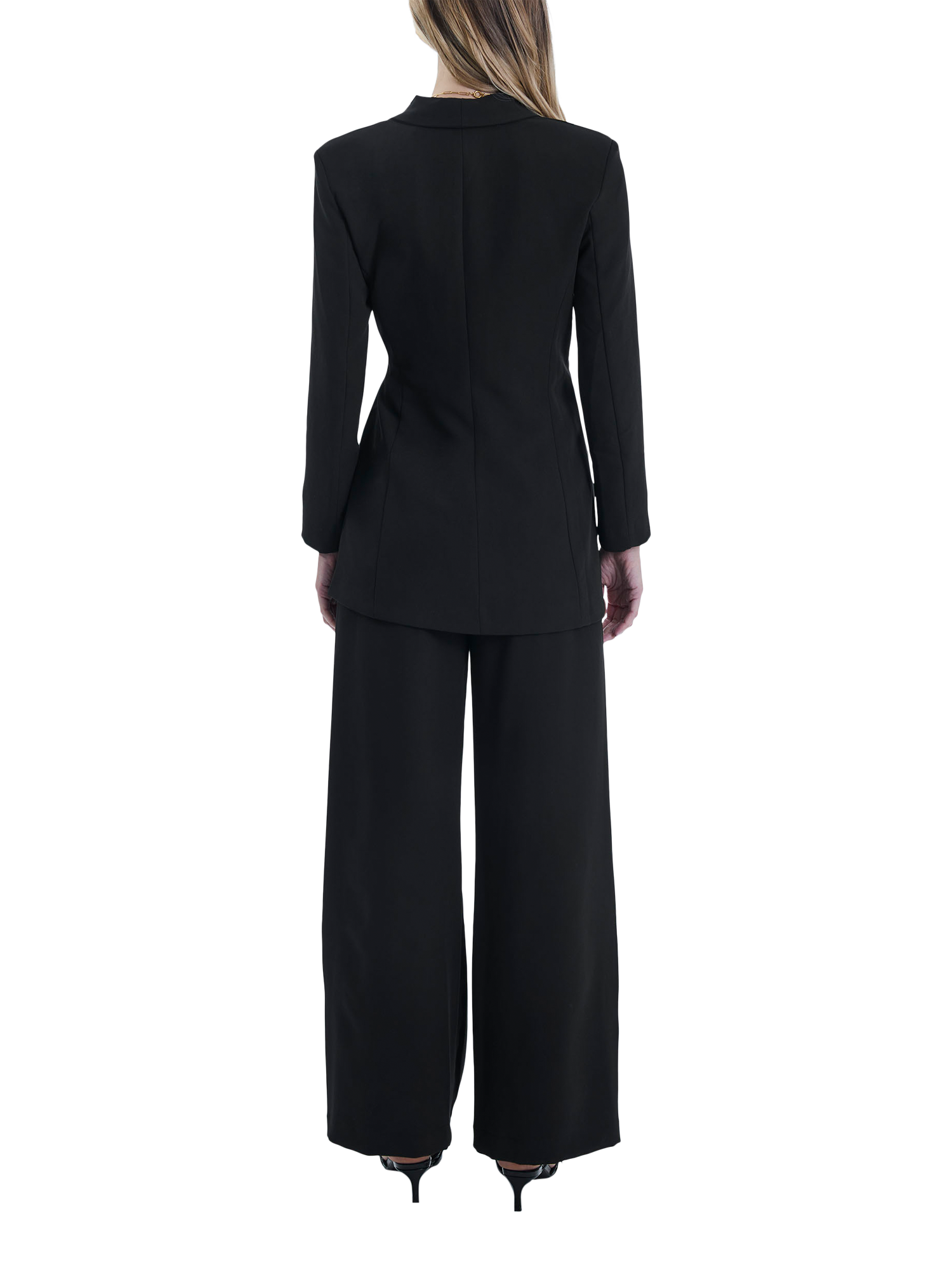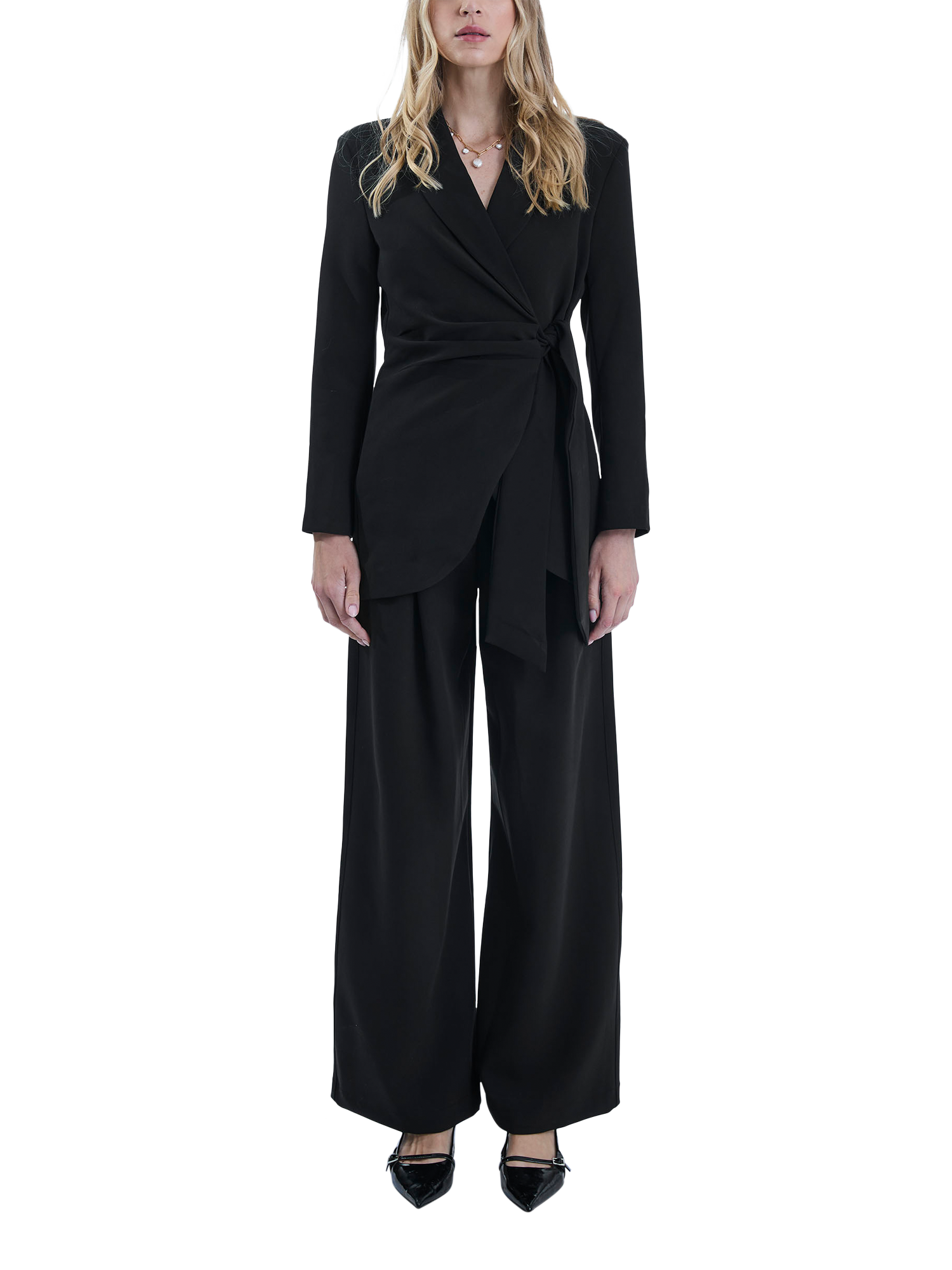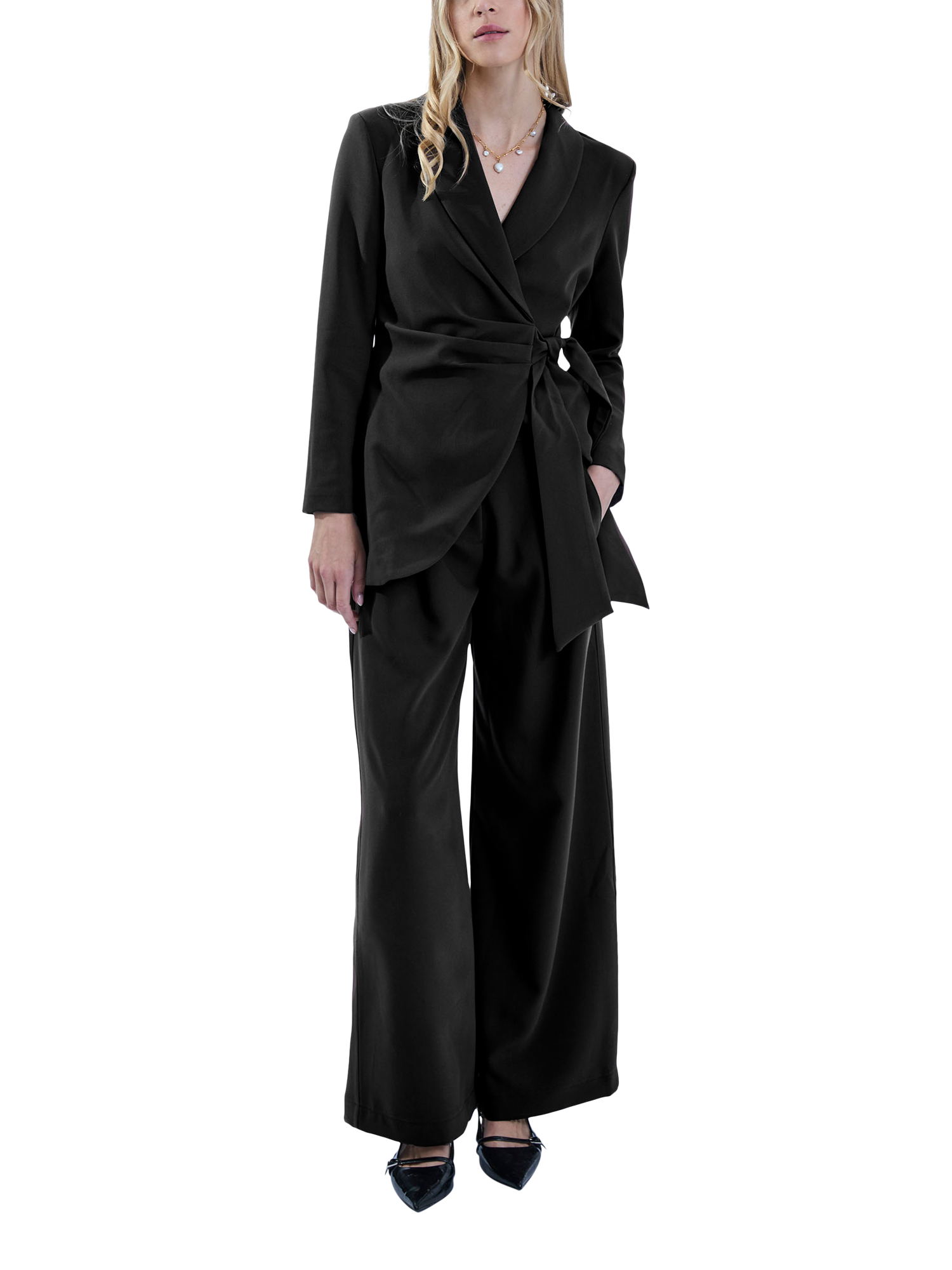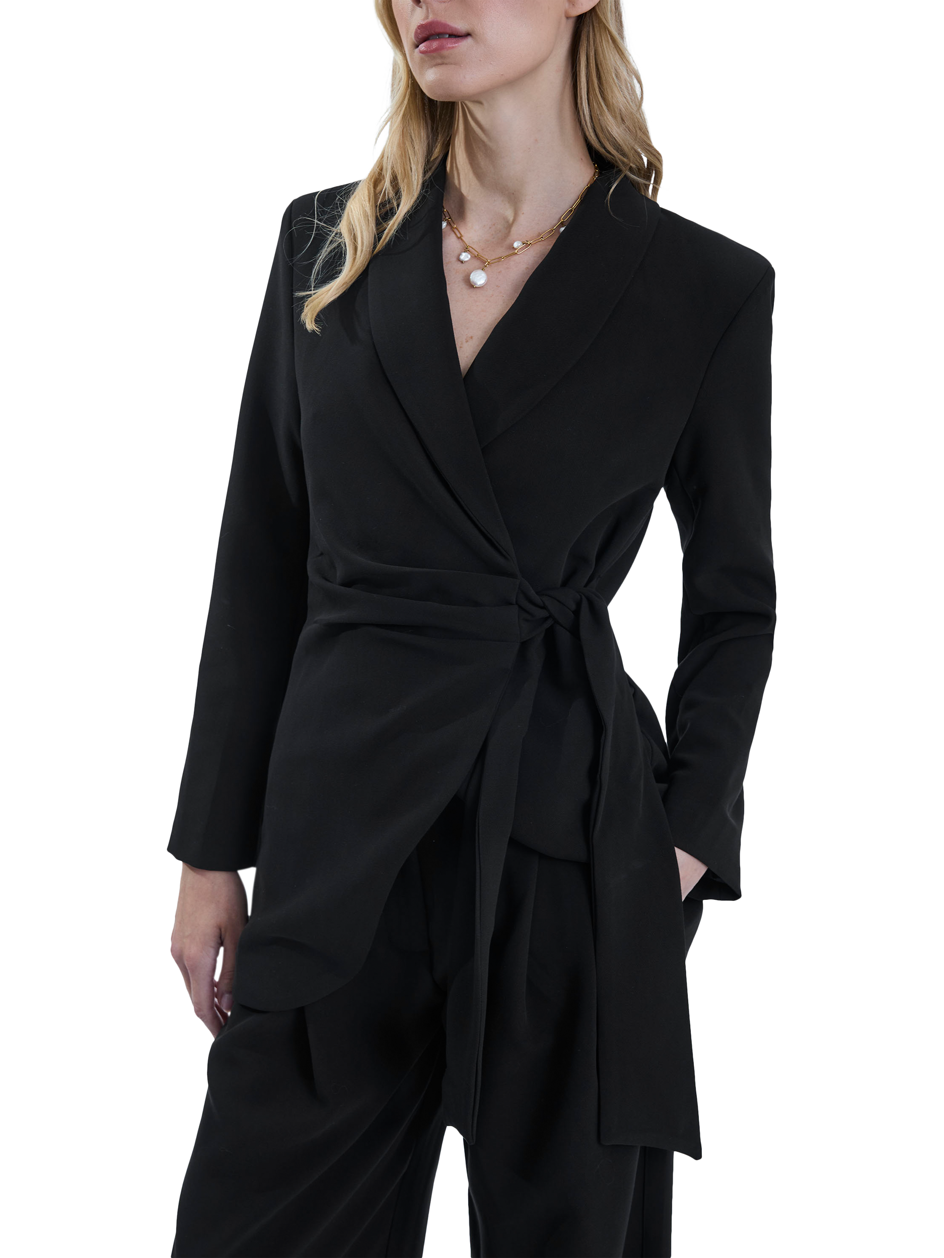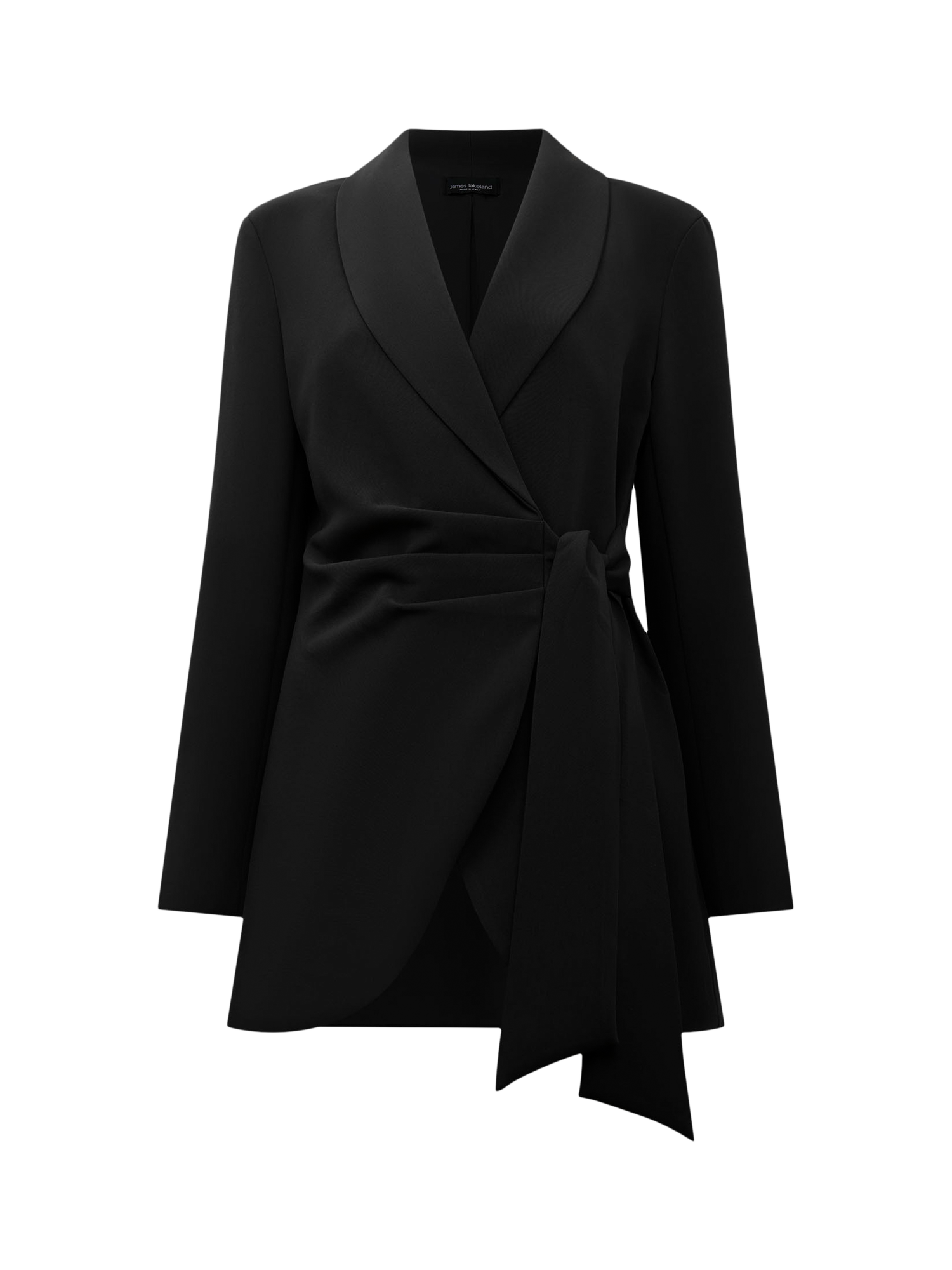 A chic James Lakeland Blazer with a shawl lapel and glamorous front ruching. Features a hidden front button and long sash belts for tying. Curved hems create a cinched waist illusion. Three-quarter sleeves and slim silhouette tailoring make this a sleek, stylish piece.