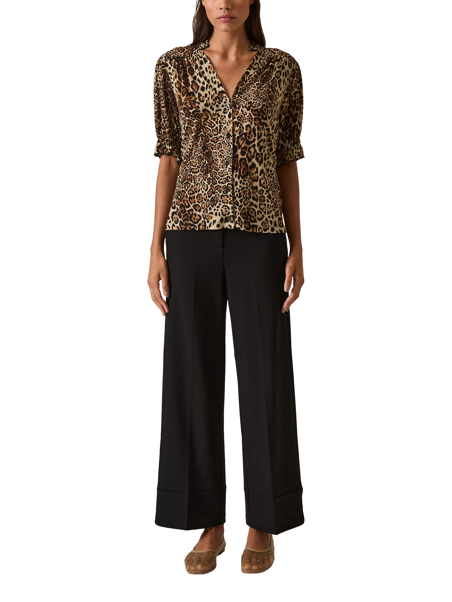 The Jersey Blouse by James Lakeland is crafted in premium Italian jersey for comfort and ease. Designed with a structured V-neckline, softly gathered ruffled collar, and subtly shaped shoulders for a tailored fit. Features elbow-length sleeves with smocked cuffs and a full button-front closure. Suitable for day-to-evening wear.