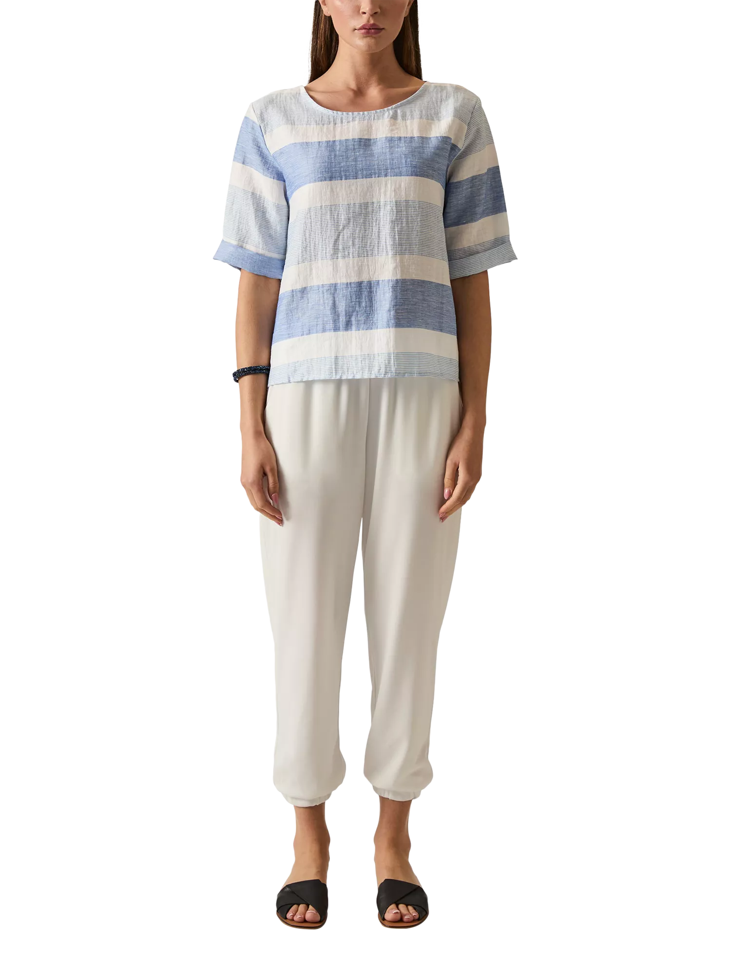 Make a statement with the Stripe Back Button Top by James Lakeland. With stylish stripes, a comfortable round neckline, and short sleeves, it's designed for effortless elegance. The standout back button fastening ensures a unique twist. Pair with white trousers or classic denim to shine.