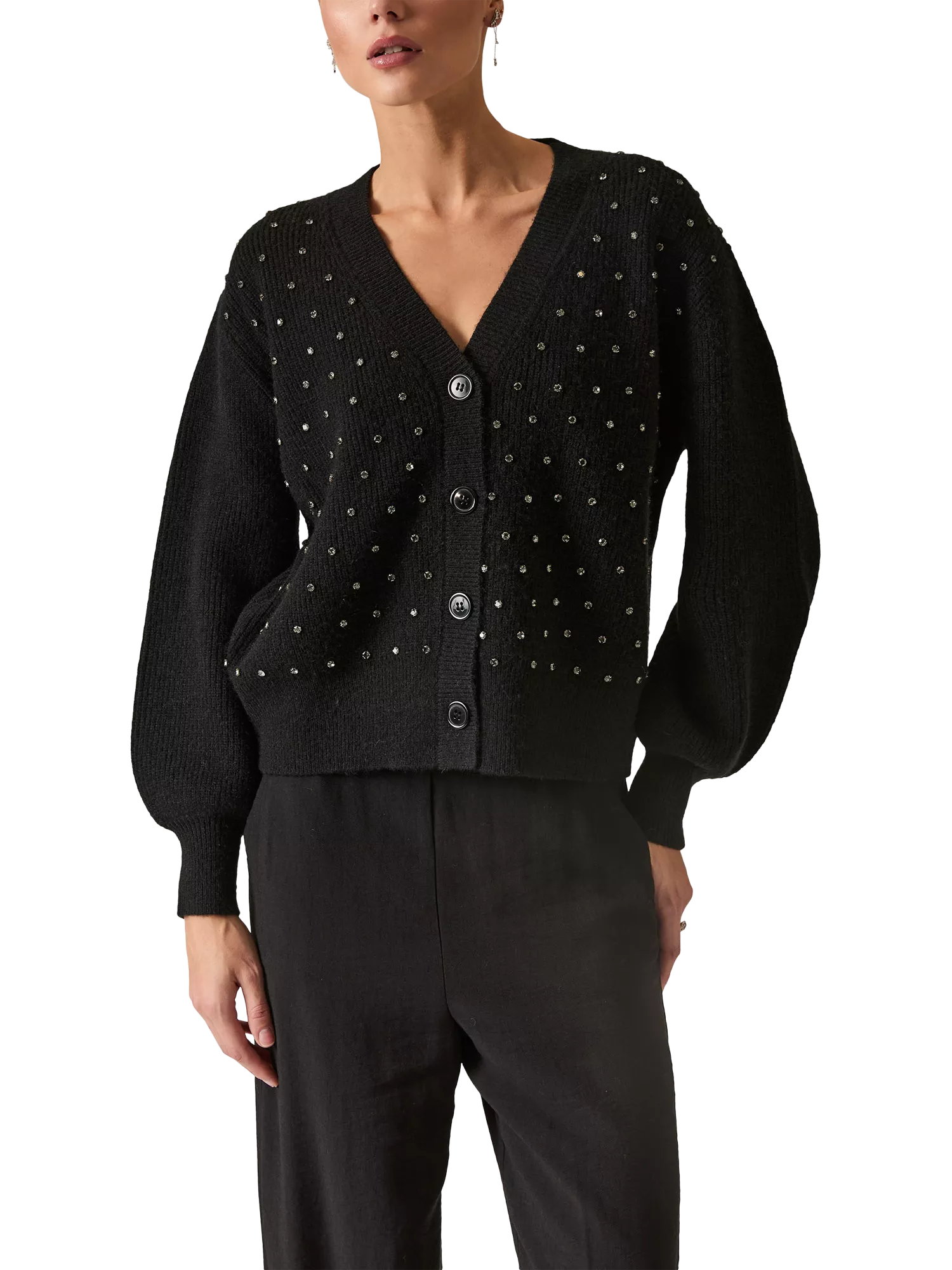 James Lakeland’s Studded V-Neck Cardigan blends softness with edge. Featuring Swarovski-style studs with metallic cores across the chest, plain button fastening, and gently puffed sleeves, it adds subtle sparkle to everyday dressing.