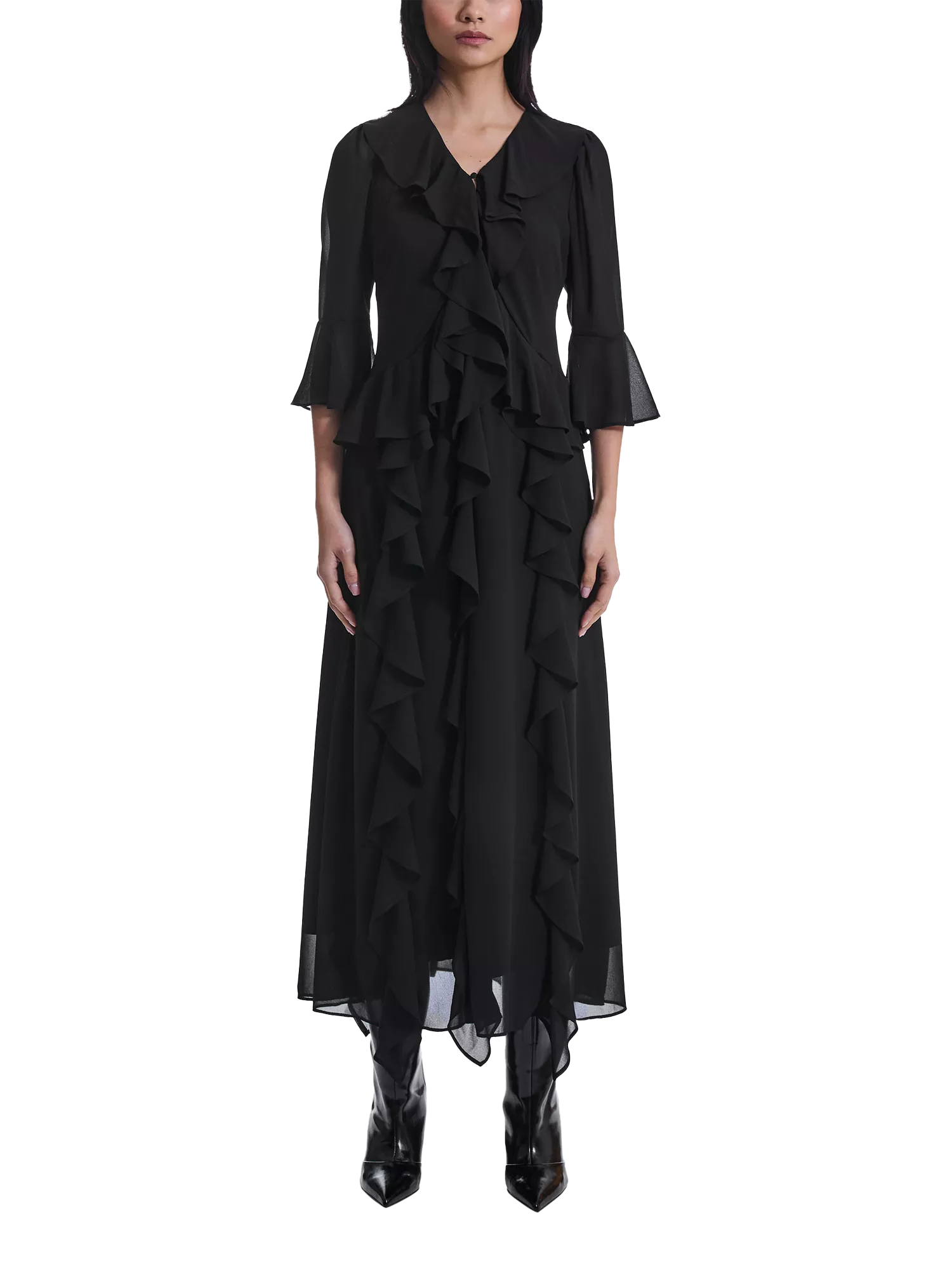 Embrace luxury with the James Lakeland V-neck Ruffle Dress. Crafted from soft, flowy chiffon, this full-length dress features a flattering V-neck with a single button and cascading ruffles across the bust and skirt. The ethereal design includes a back zip, three quarter length sleeves with fluted cuffs, and a slick silhouette that enhances your figure.