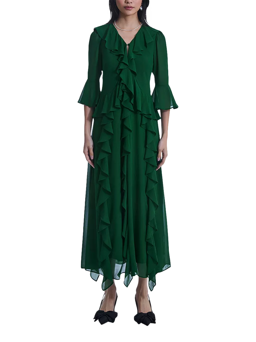 Embrace luxury with the James Lakeland V-neck Ruffle Dress. Crafted from soft, flowy chiffon, this full-length dress features a flattering V-neck with a single button and cascading ruffles across the bust and skirt. The ethereal design includes a back zip, three quarter length sleeves with fluted cuffs, and a slick silhouette that enhances your figure.