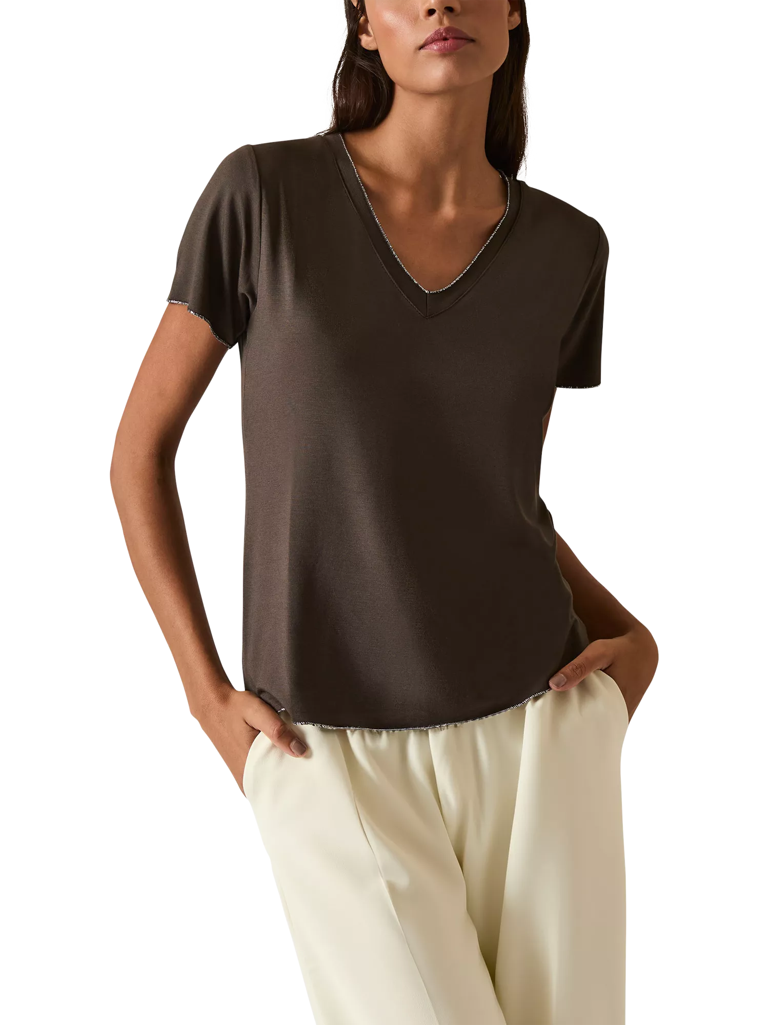 Thoughtfully designed in the softest natural viscose, this T-shirt features elegant Lurex detailing along the V-neck, short sleeves, and hem. Slightly tailored at the waist.