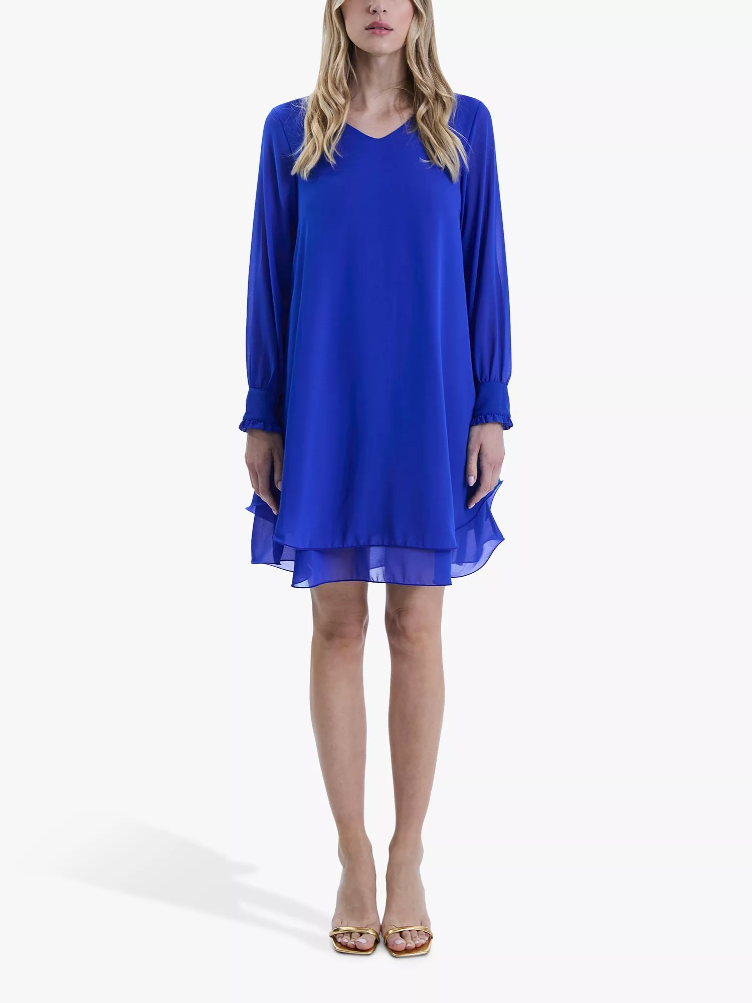 Embrace the changing seasons with this beautiful knee-length flowy dress by James Lakeland. The A-line silhouette flatters all body types, while the two-tier wave hem detail adds a unique touch. Ruffled cuffs and mother-of-pearl buttons adorn the long sleeves, creating a stylish finish. The keyhole slit at the back ensures both style and comfort.