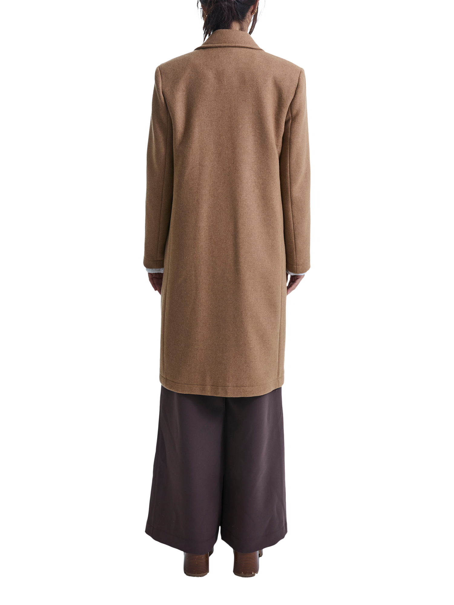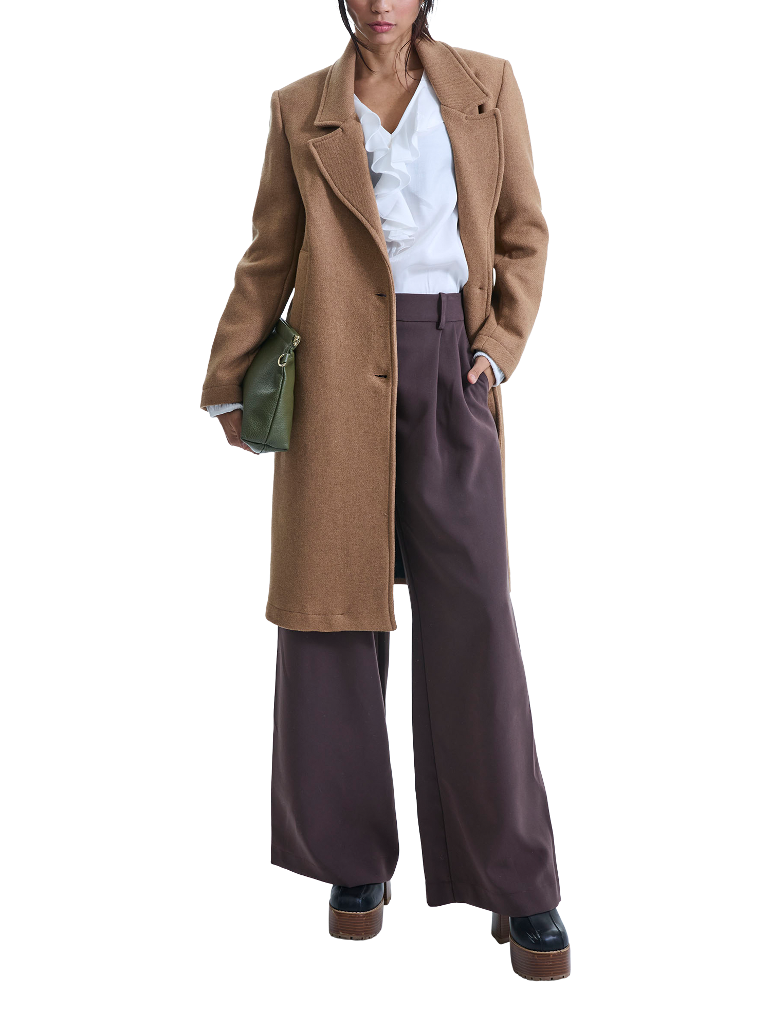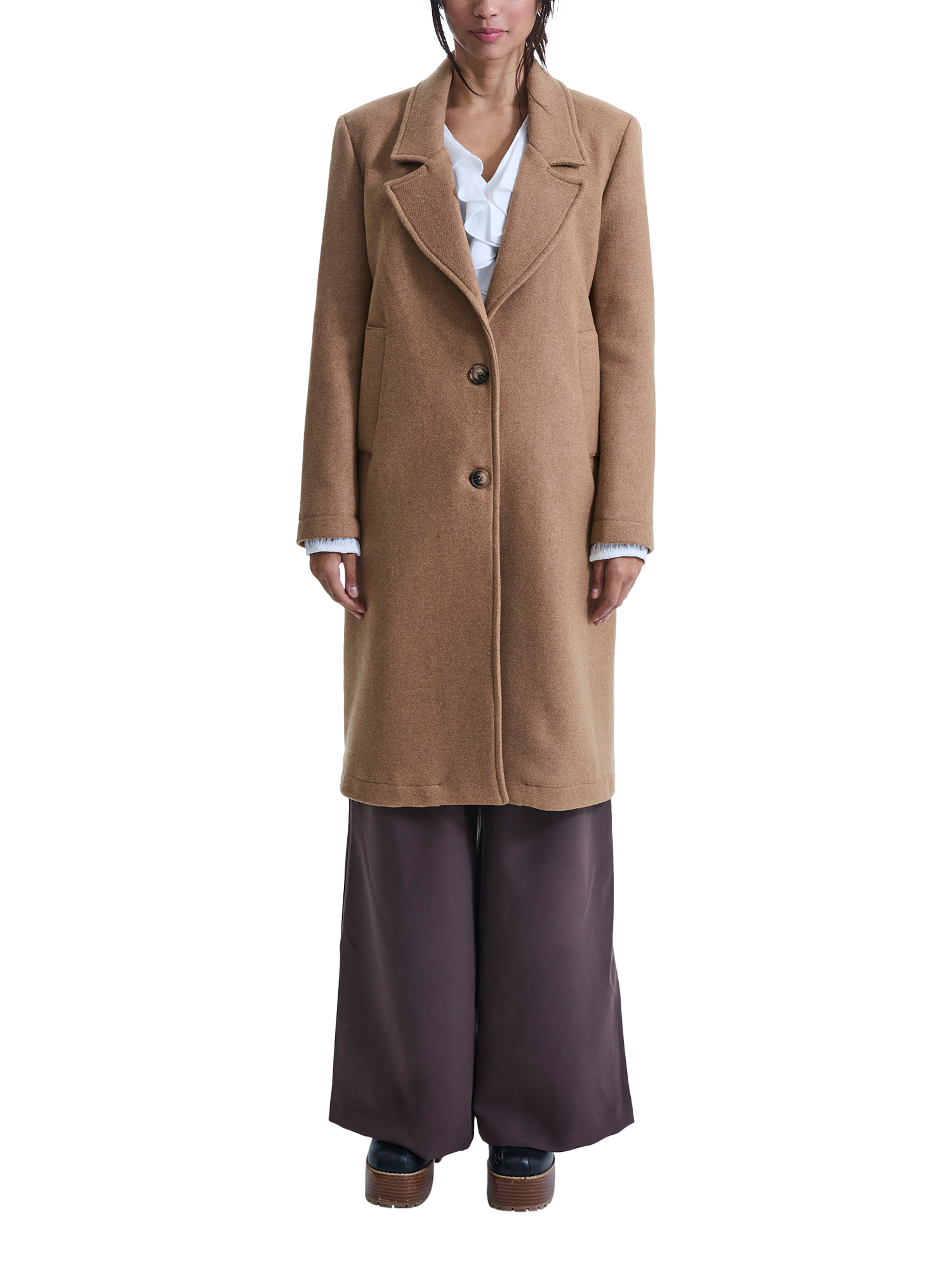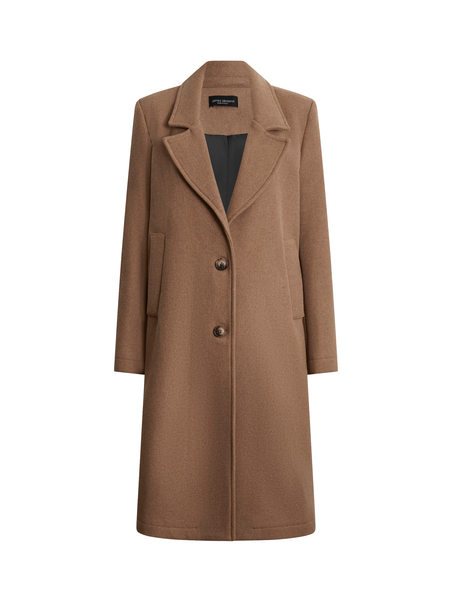 Stay warm and stylish with this beautiful James Lakeland coat, a winter wardrobe staple. Crafted from a mid to heavy wool blend, it offers exceptional comfort and warmth. This chic coat features a classic peak collar, two faux horn buttons, and two side vertical welt pockets. Light shoulder pads add structure, enhancing the overall tailored look.