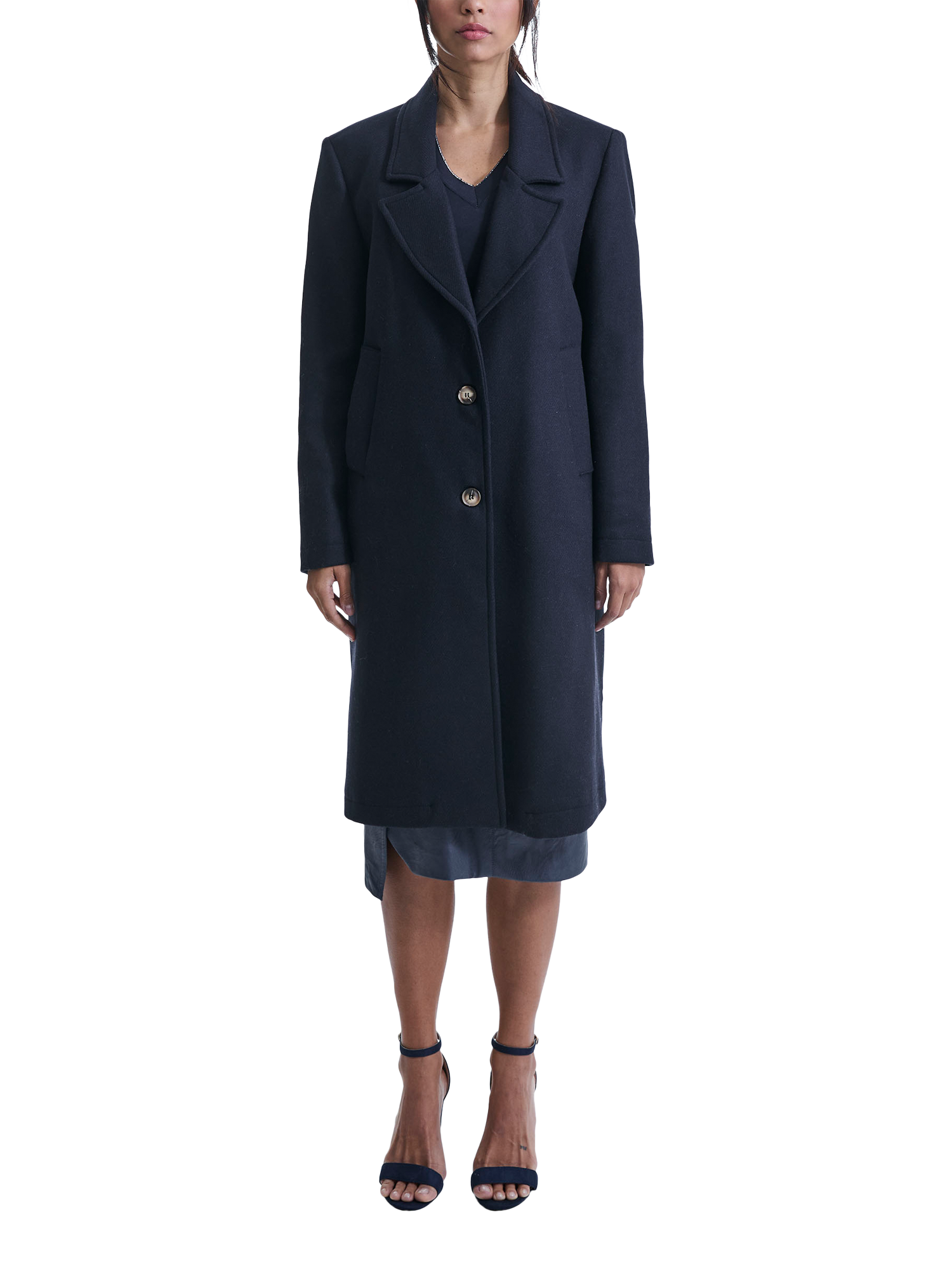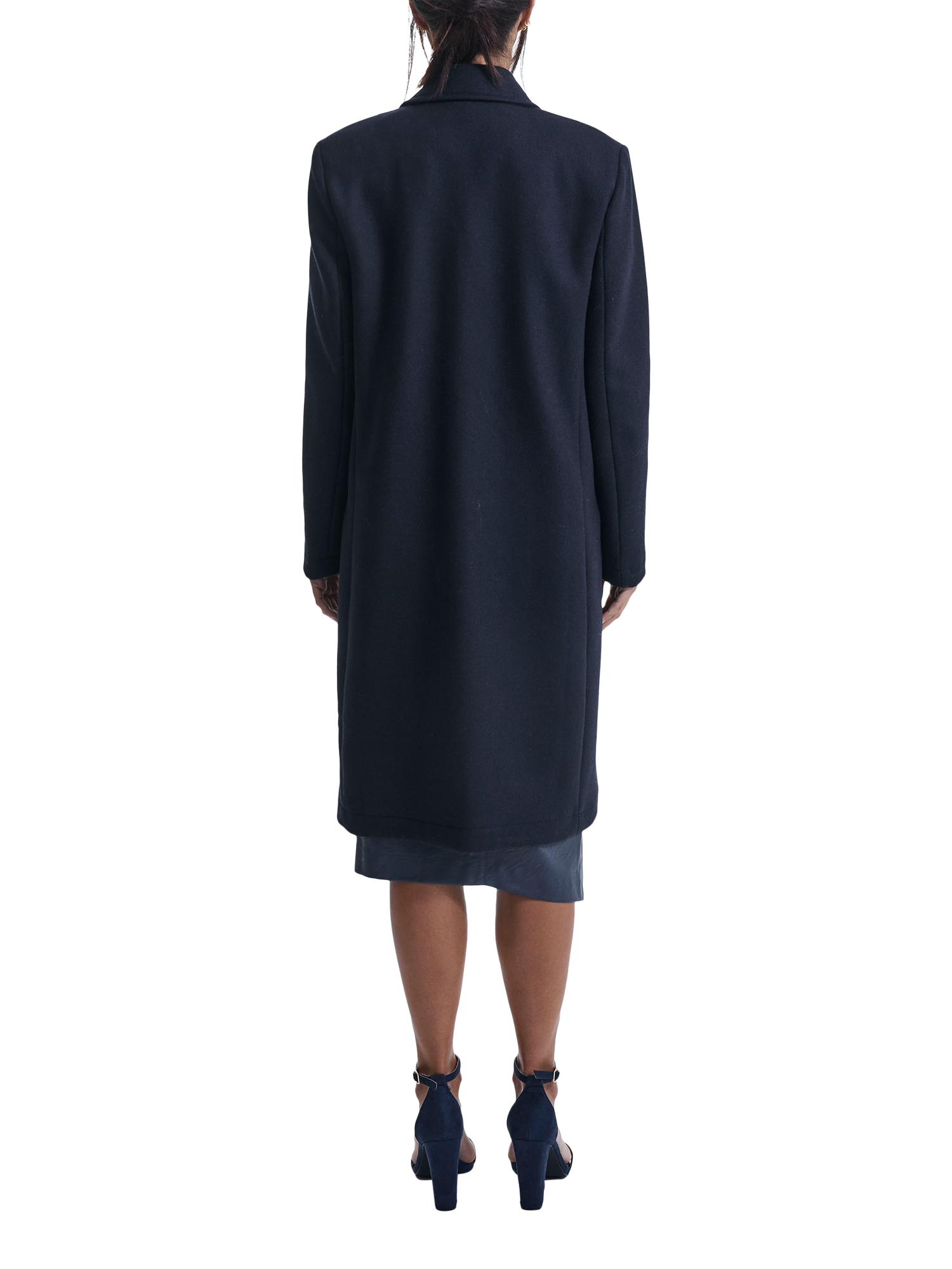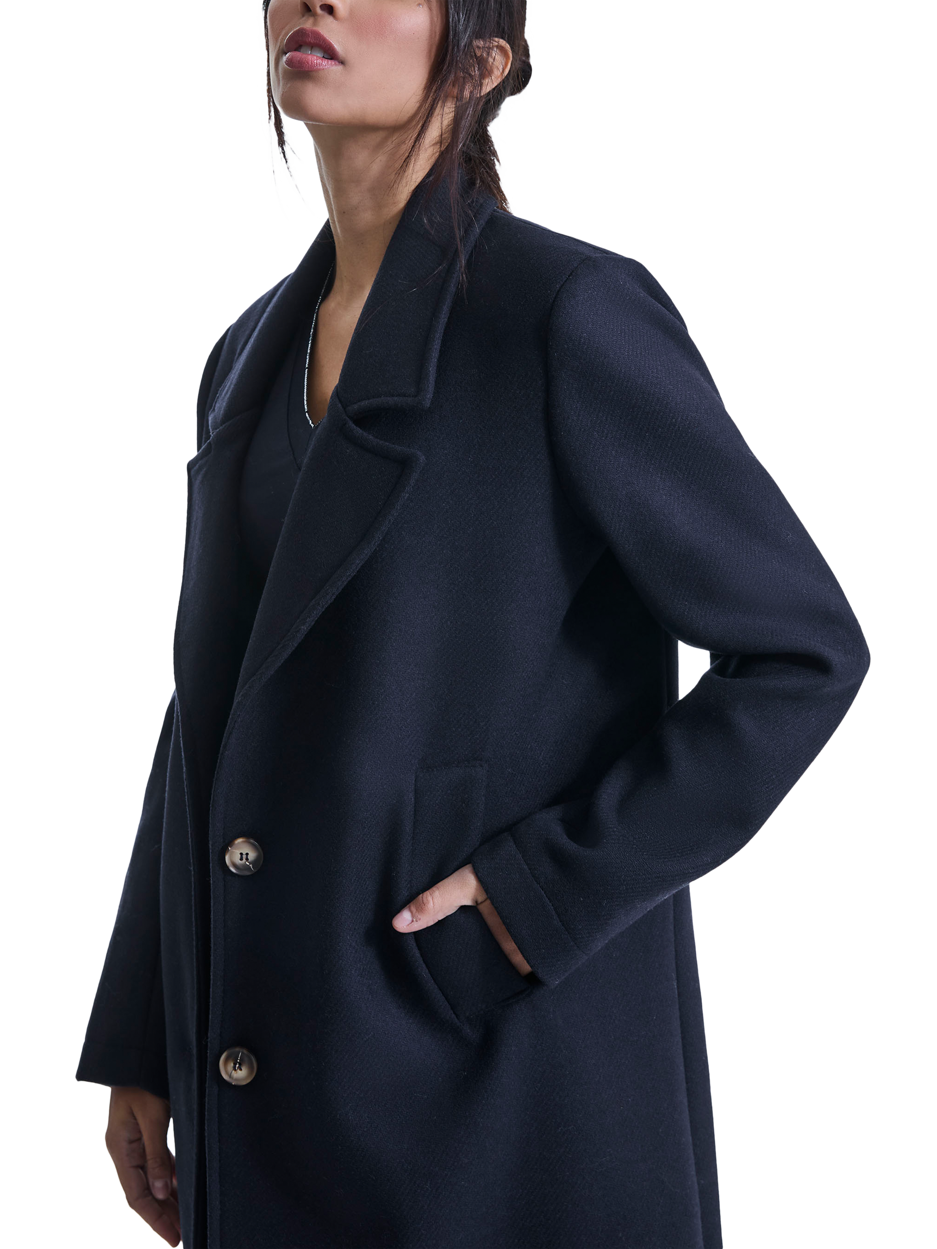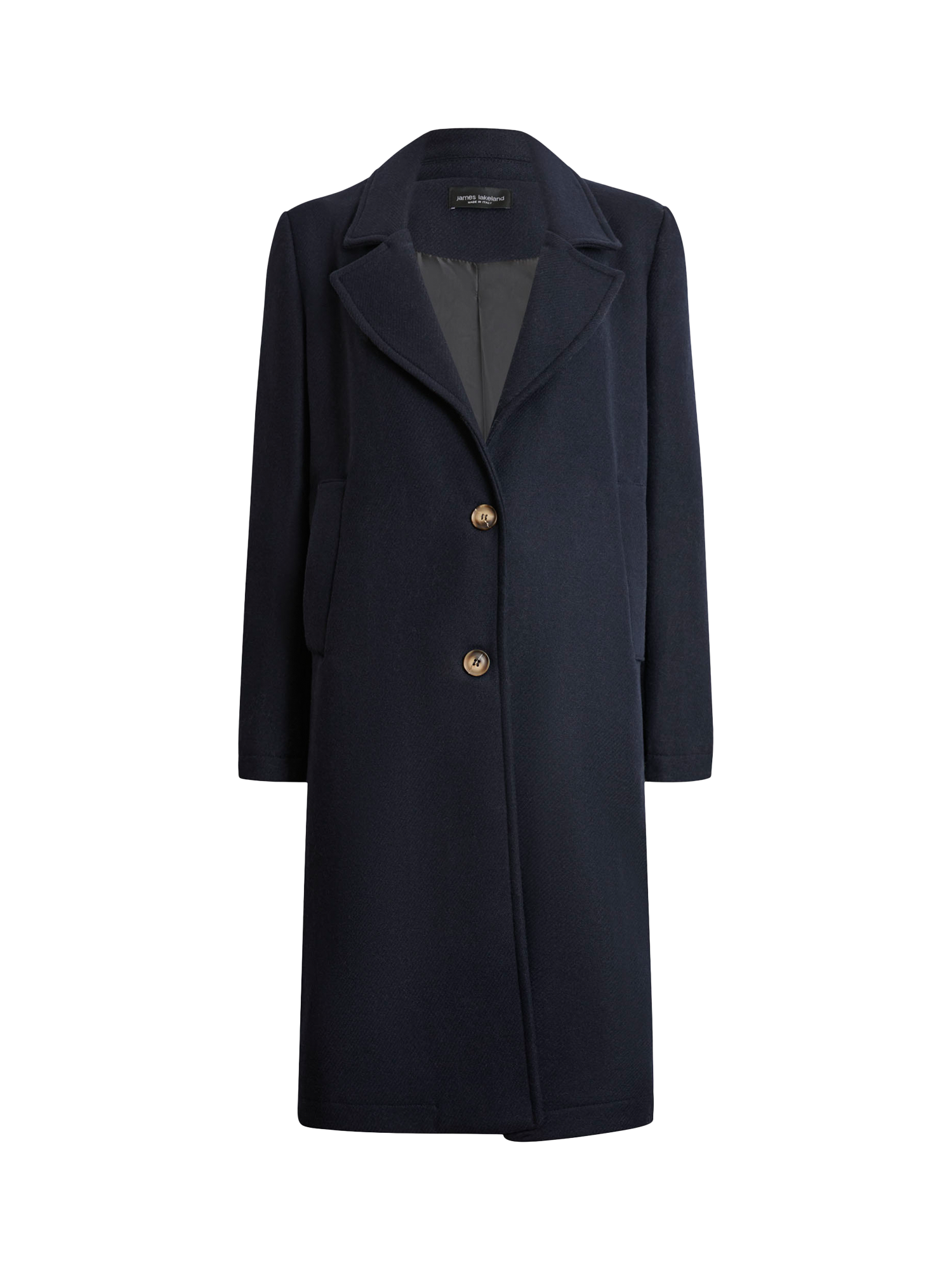 Stay warm and stylish with this beautiful James Lakeland coat, a winter wardrobe staple. Crafted from a mid to heavy wool blend, it offers exceptional comfort and warmth. This chic coat features a classic peak collar, two faux horn buttons, and two side vertical welt pockets. Light shoulder pads add structure, enhancing the overall tailored look.