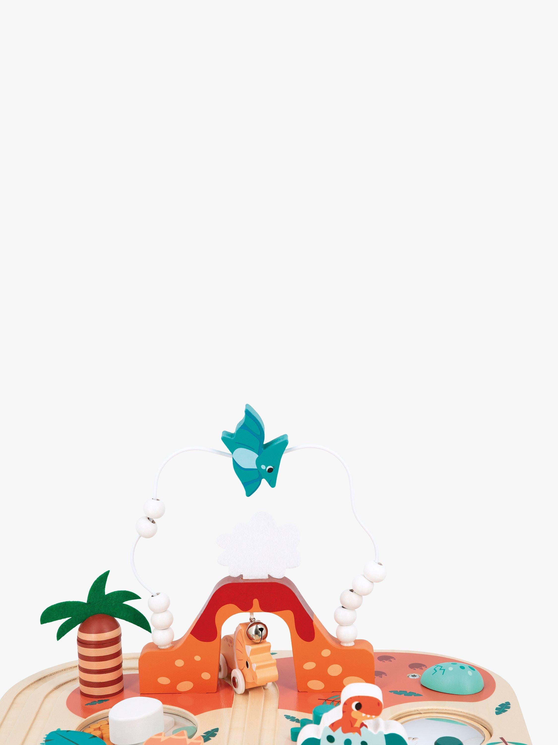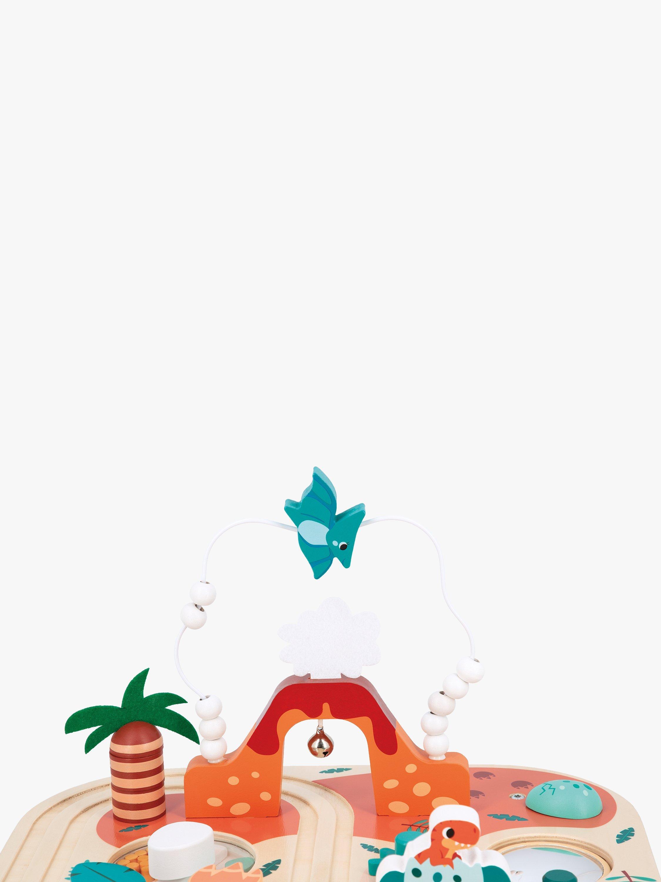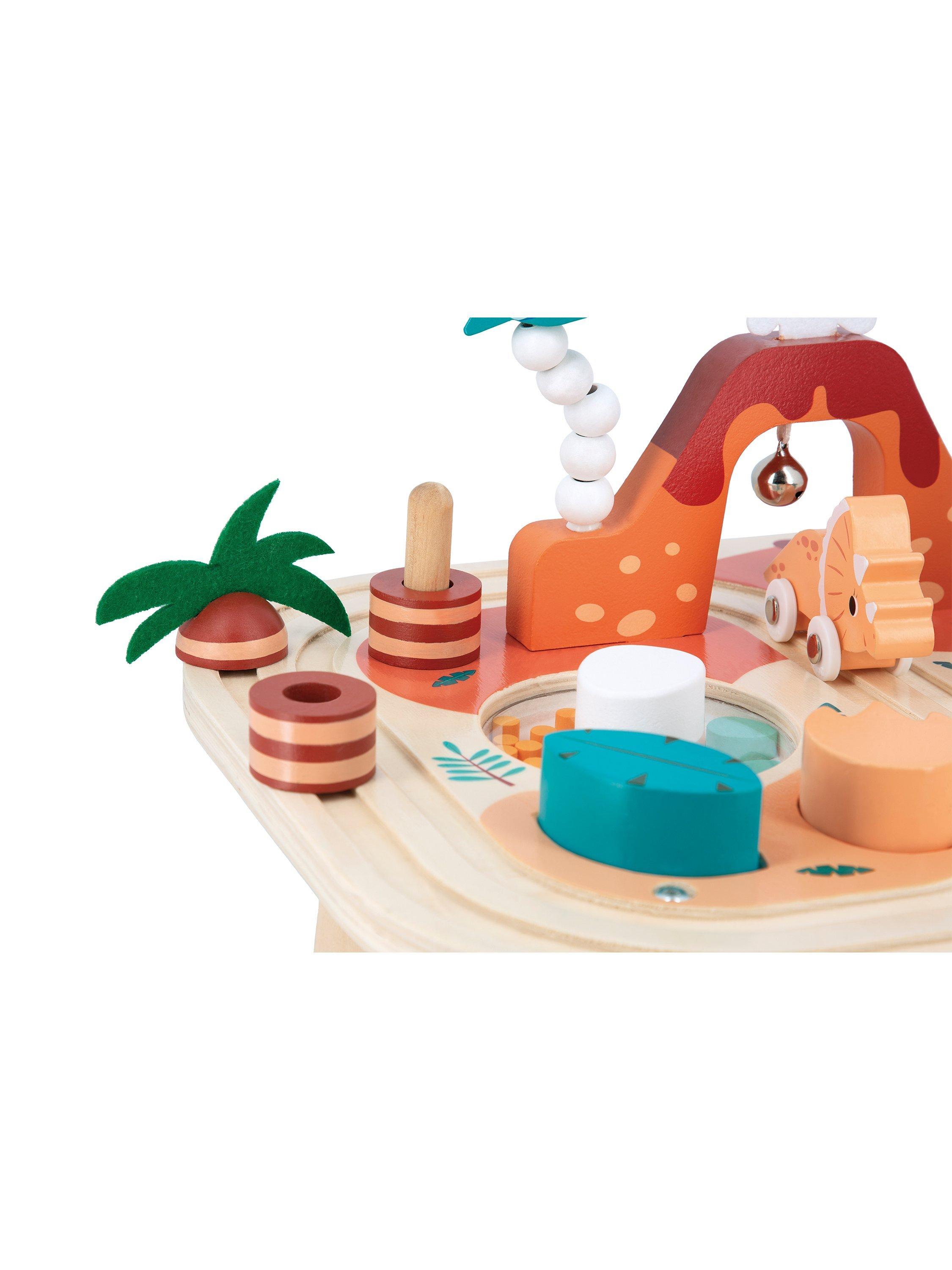 There are 8 different activities to help develop their curiosity, motor skills and concentration: a triceratops that wheels along its track which passes under the volcano to ring the bell, an abacus comprising 10 wooden beads and a pteranodon in full flight, a 3-piece palm tree-shaped stacking toy, and even slot-in wooden pieces in the shape of a footprint and leaf.