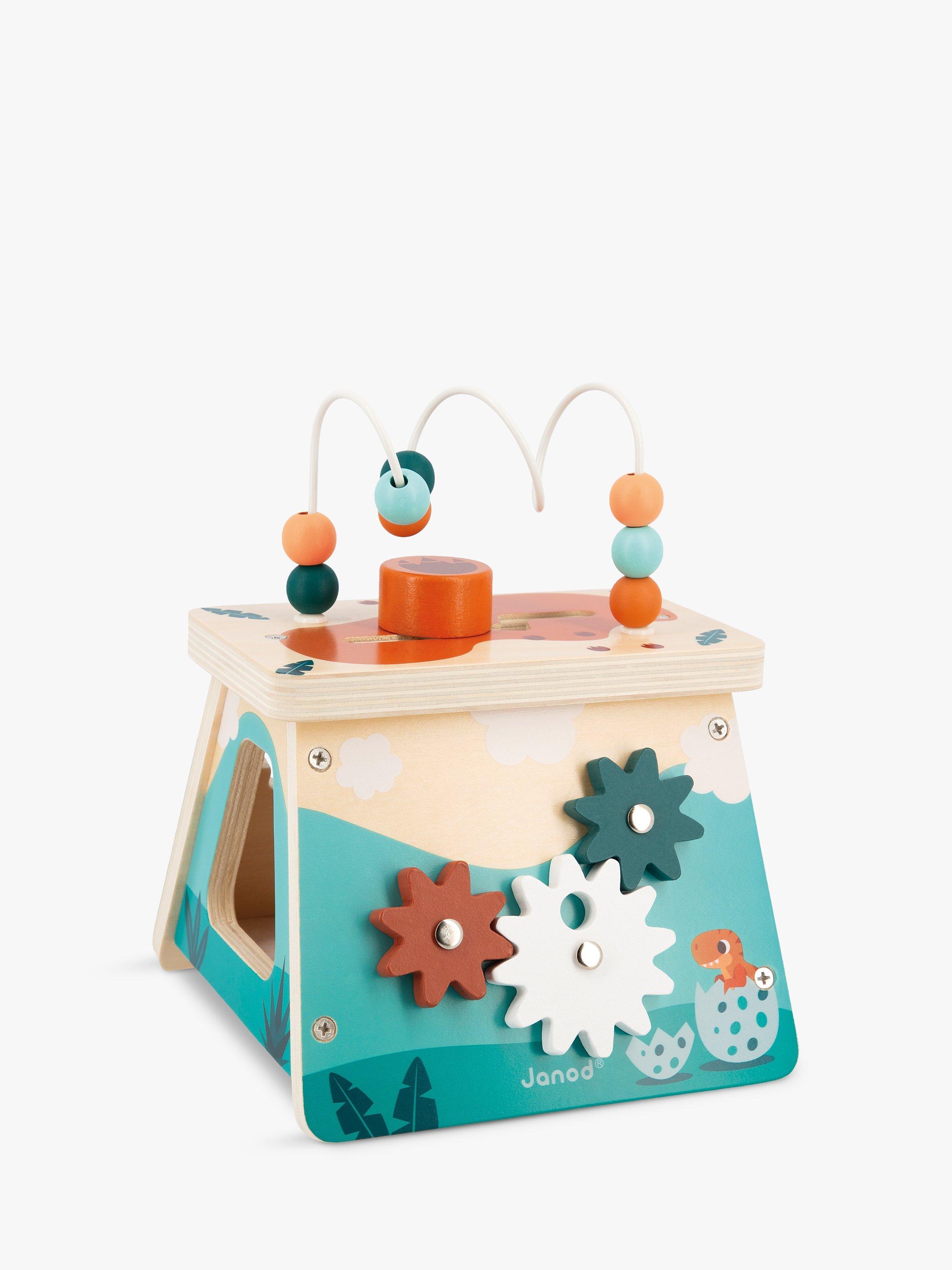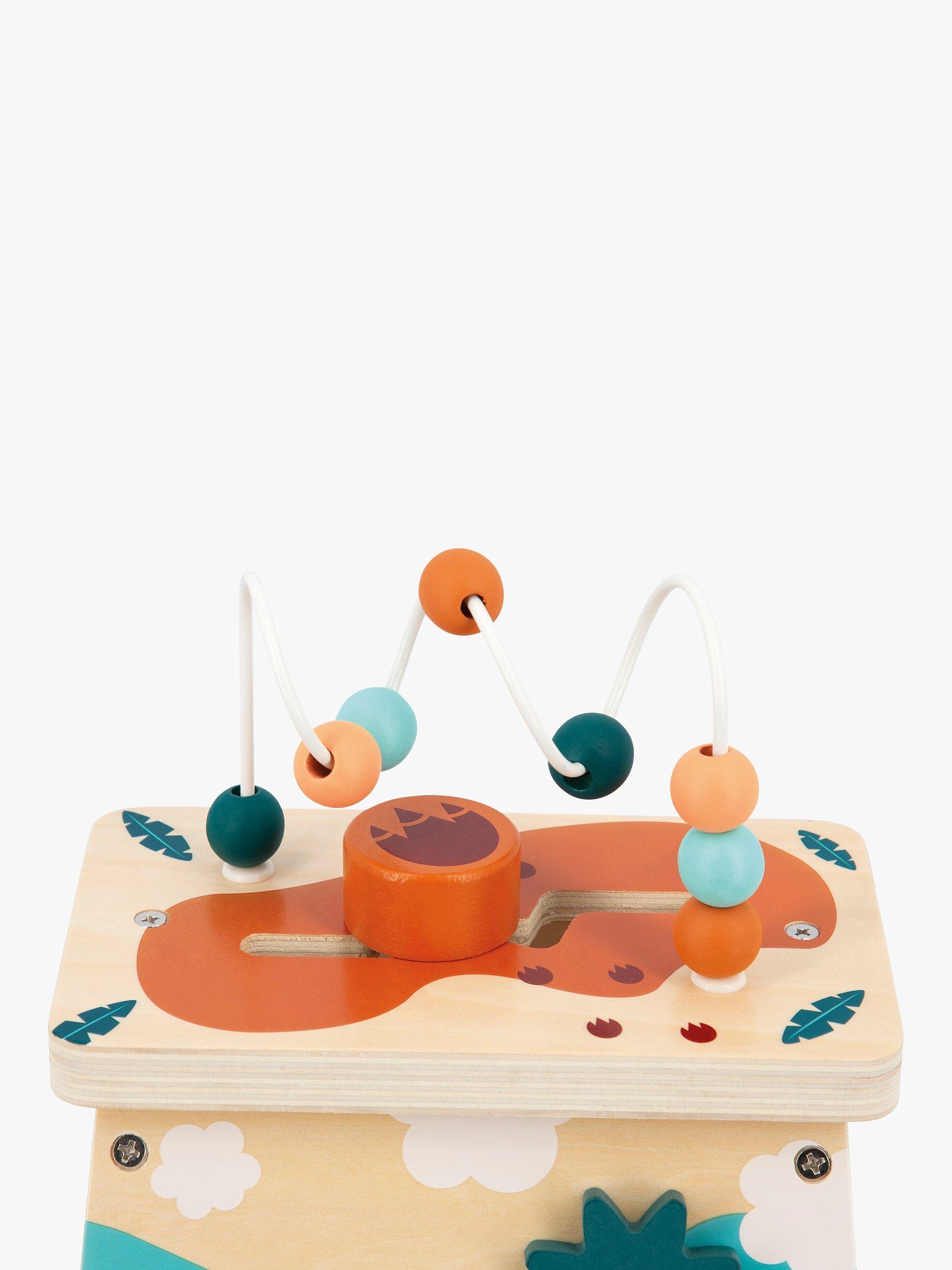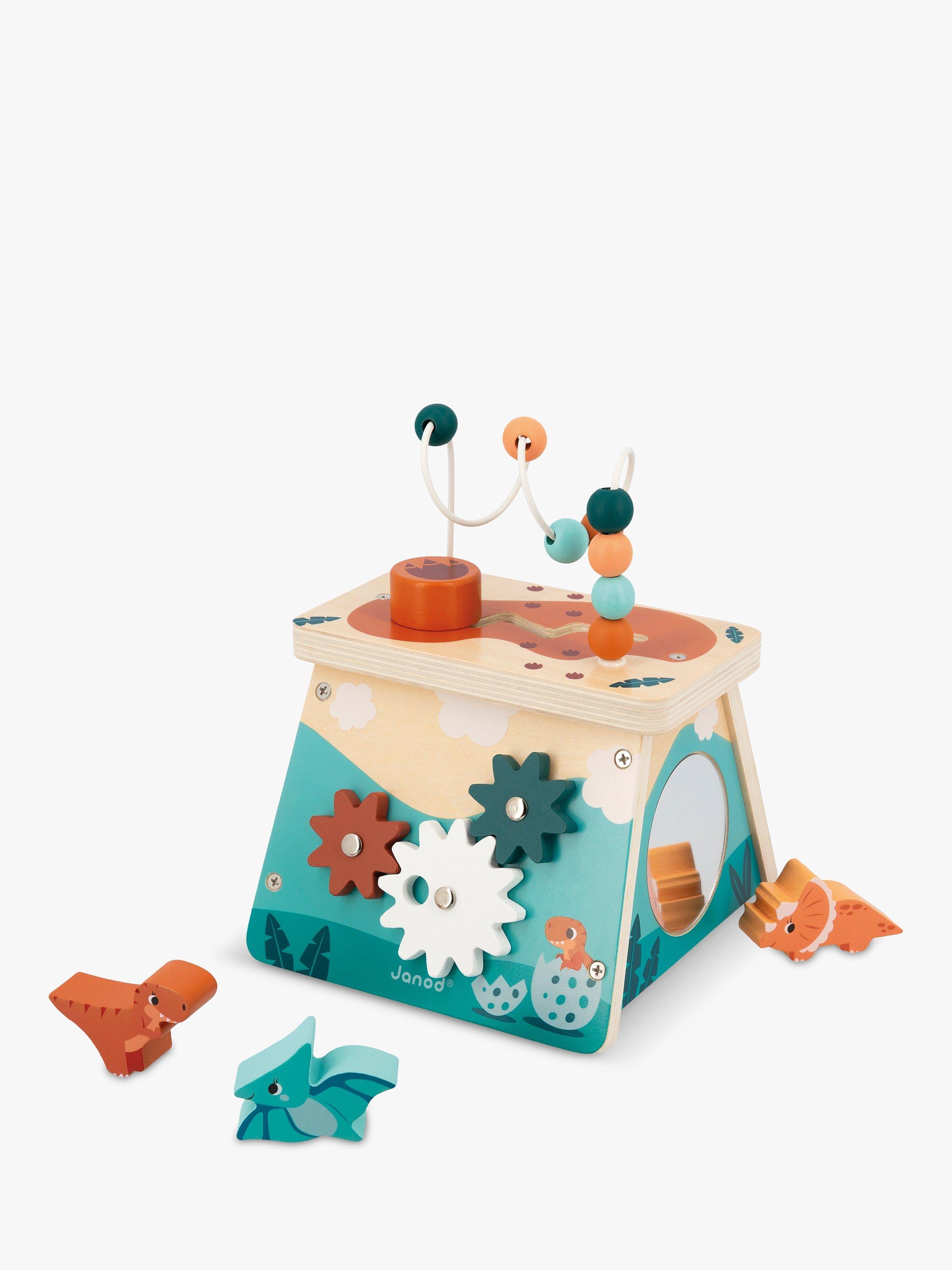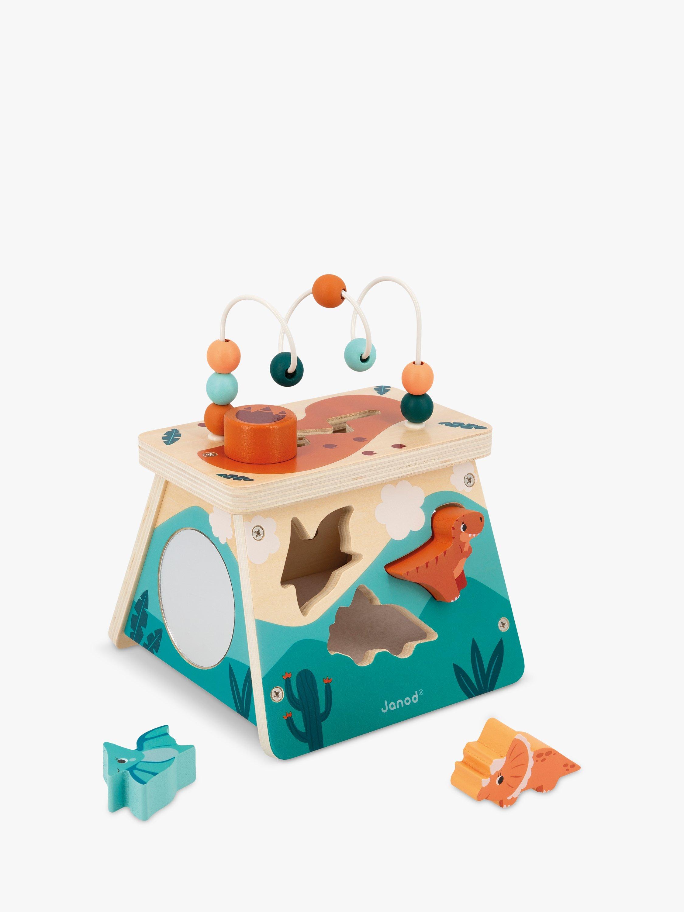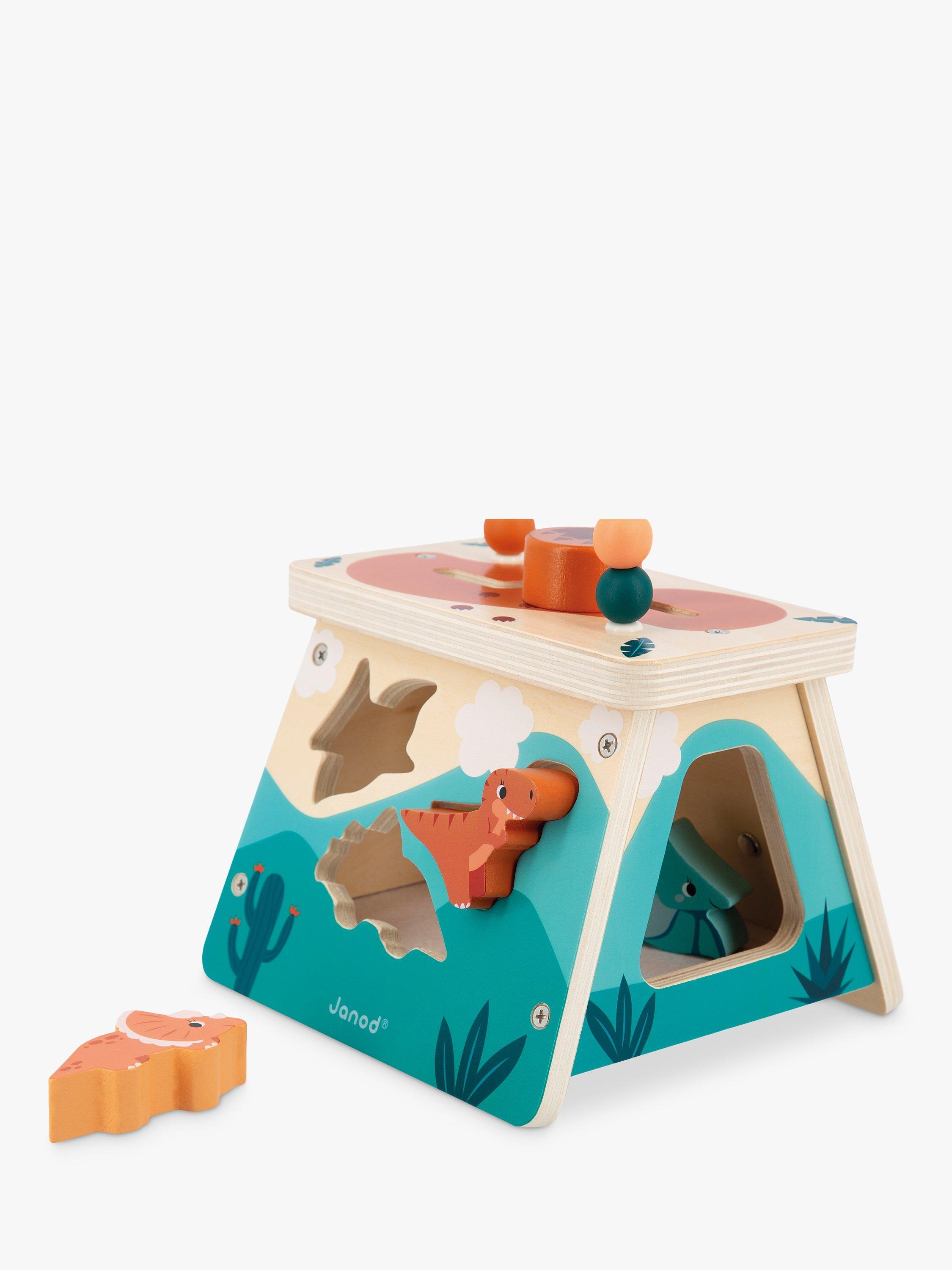 The front features a shape sorter with wooden dinosaurs to slot through the correct holes. Kids will need to scratch their brains to figure out where to place the cute Tyrannosaurus, Triceratops and Pteranodon!