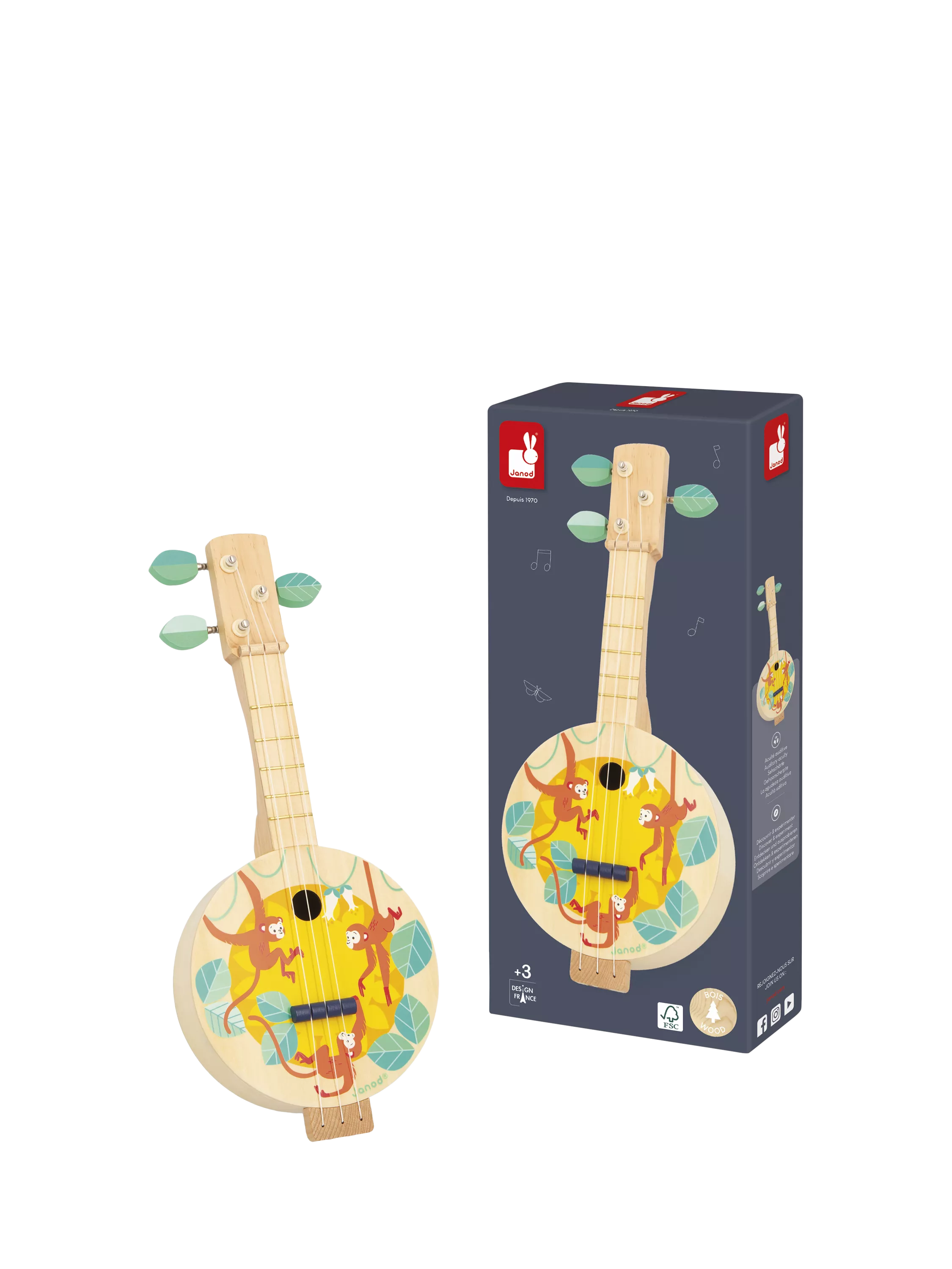 Hello, banjo! This wooden banjo is perfect for kids aged 3+ years, with three strings and tuning keys to imitate grown-up instruments. Great for developing musical taste and talent, it comes in the joyful colours of our Gioia range. The three monkeys can't wait to hear the tunes!