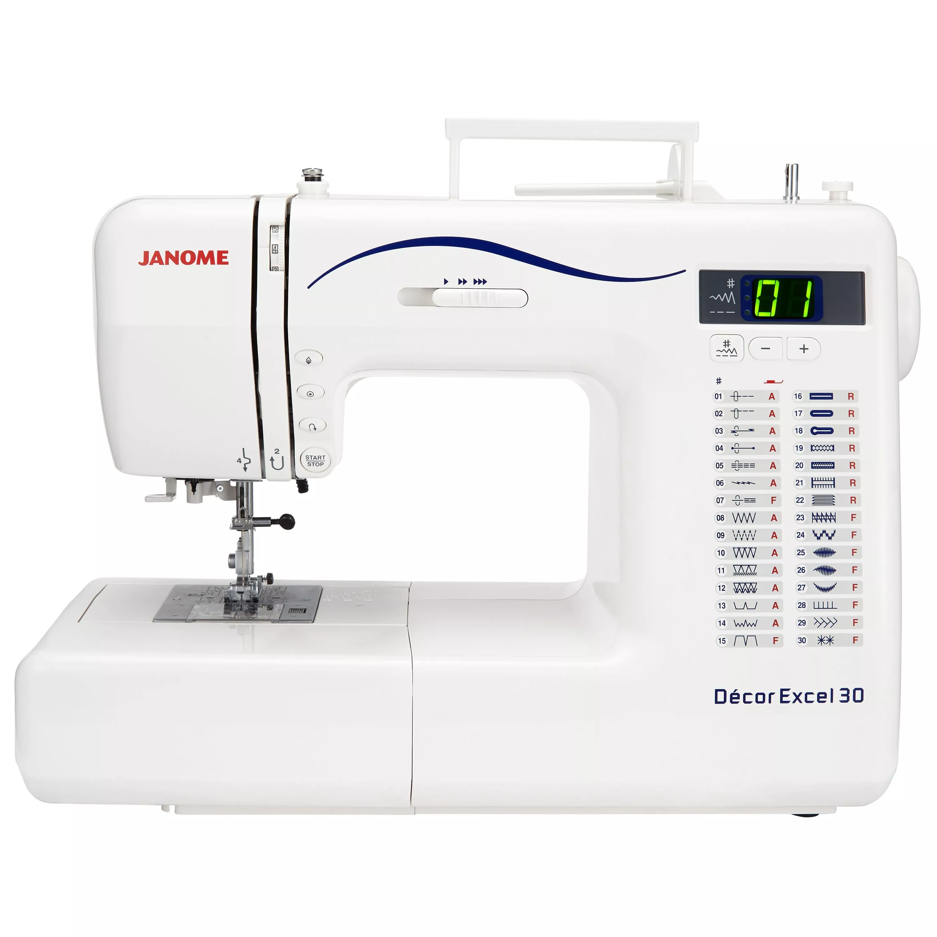 The Janome Decor Excel 30 features 30 stitches including embroidery and six styles of auto 1-step buttonholes whilst the built-in LCD screen provides information on stitch settings.