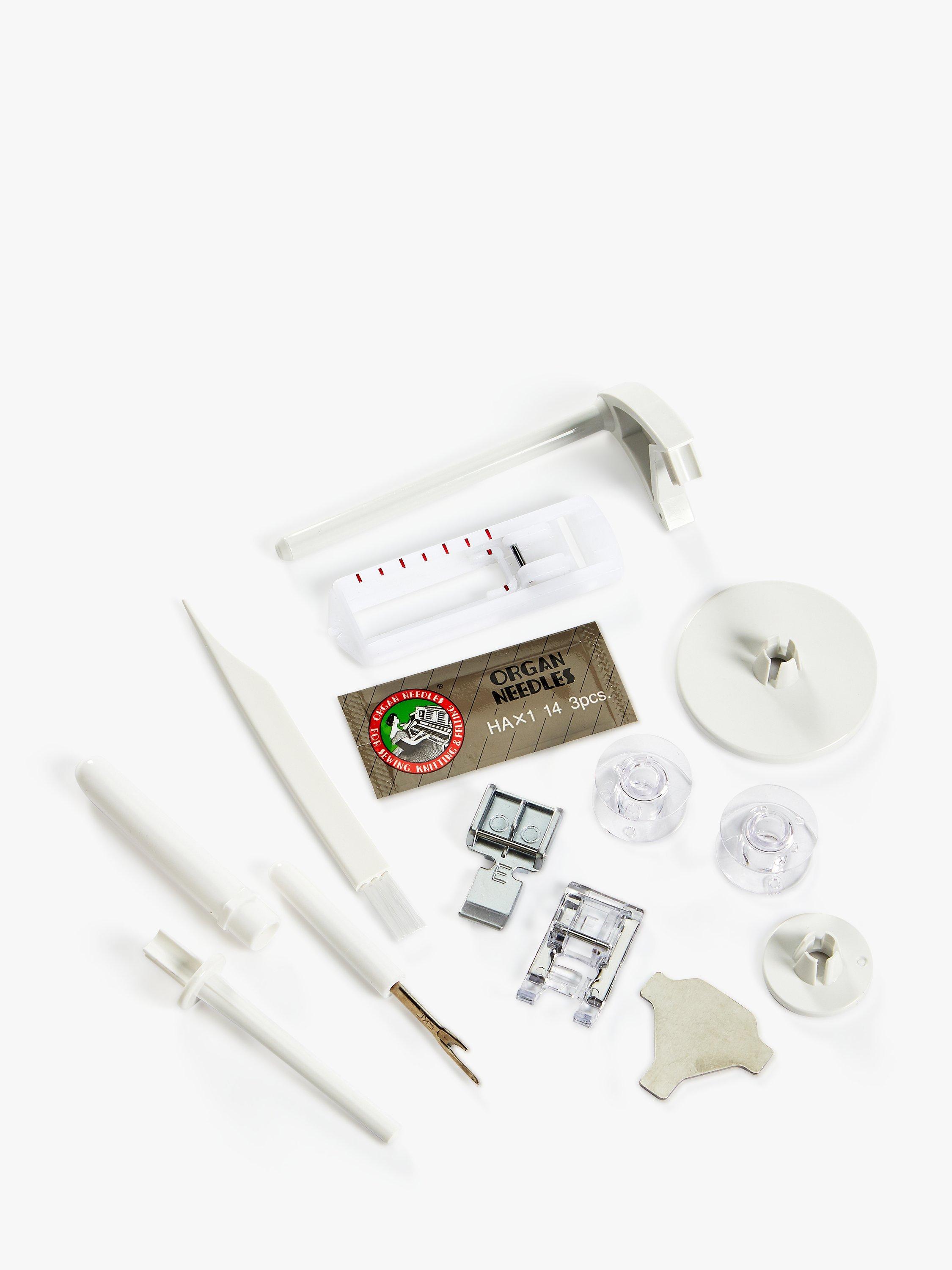This machine comes with a lint brush, buttonhole foot, satin stitch foot (F), screwdriver, seam ripper, spool caps (large and small), spool pin, standard foot, zipper foot, foot control, power lead, instruction manual, needles and x 4 plastic bobbins.