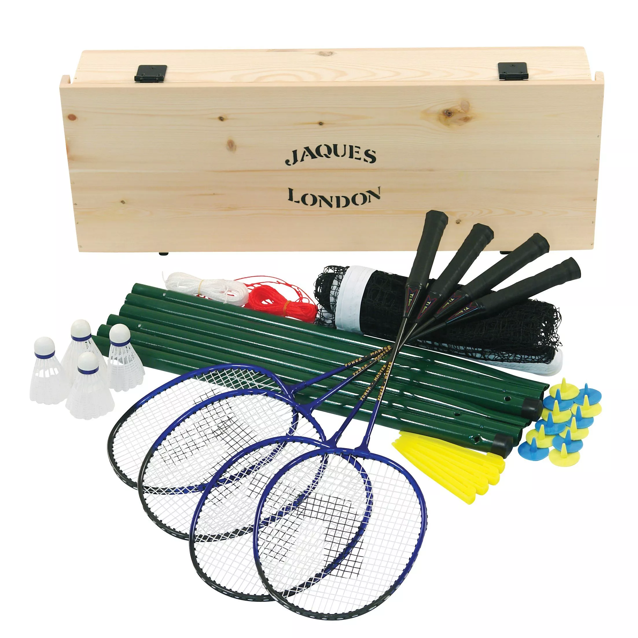 Jaques have been making badminton sets for over 100 years. This is the finest set they make, with deluxe rackets and presented in a beautiful, handmade wooden box.