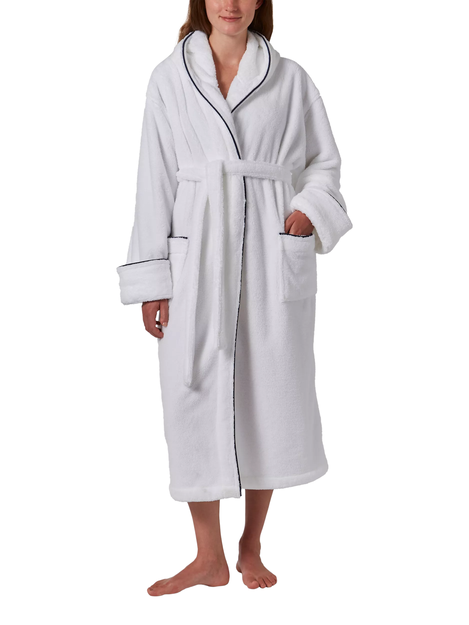 This plain robe, with smart contrast piping, is woven from recycled polyester. Soft and lightweight, featuring a belt, patch pockets and hood, it's cut to a generous unisex fit.