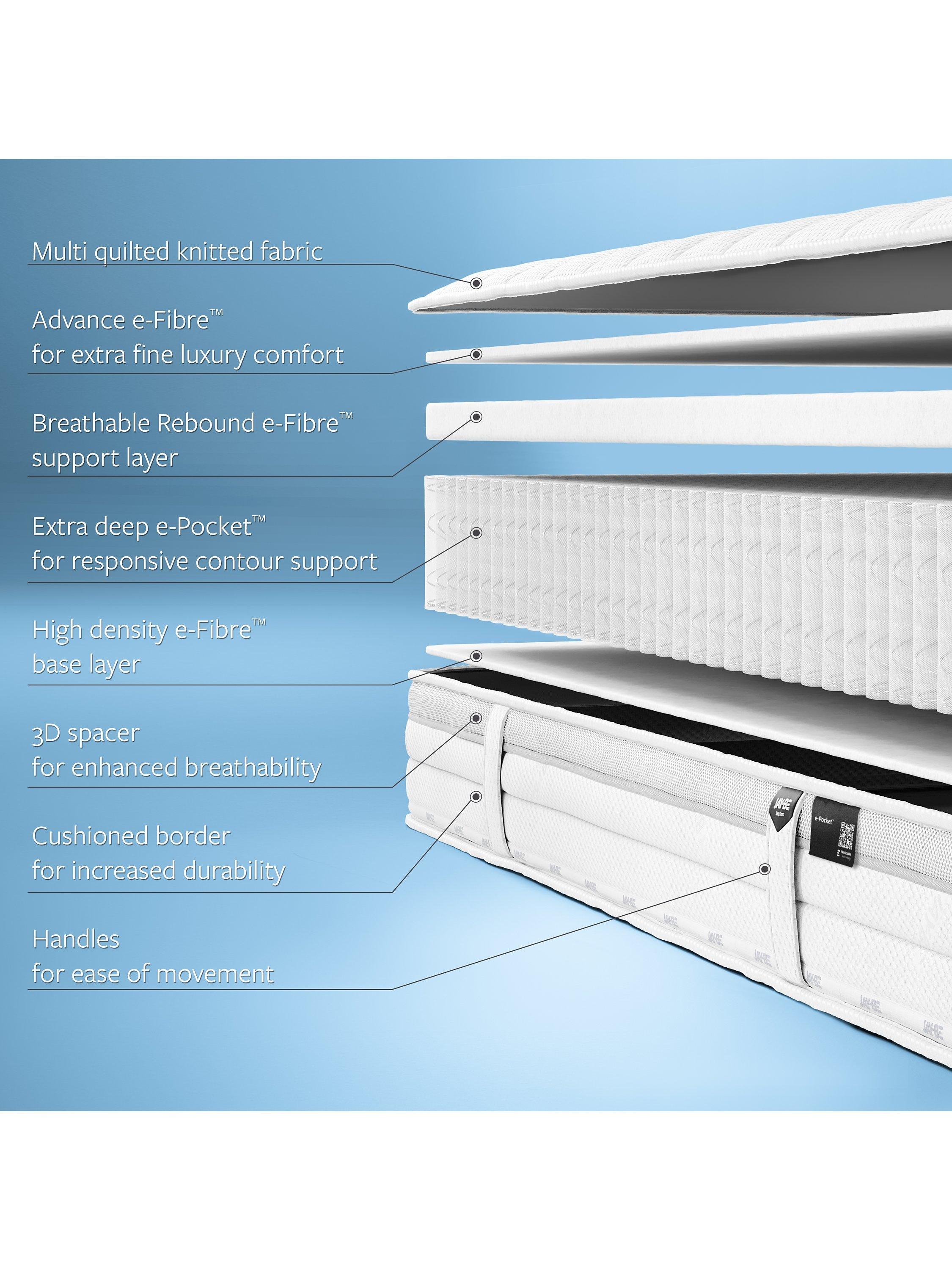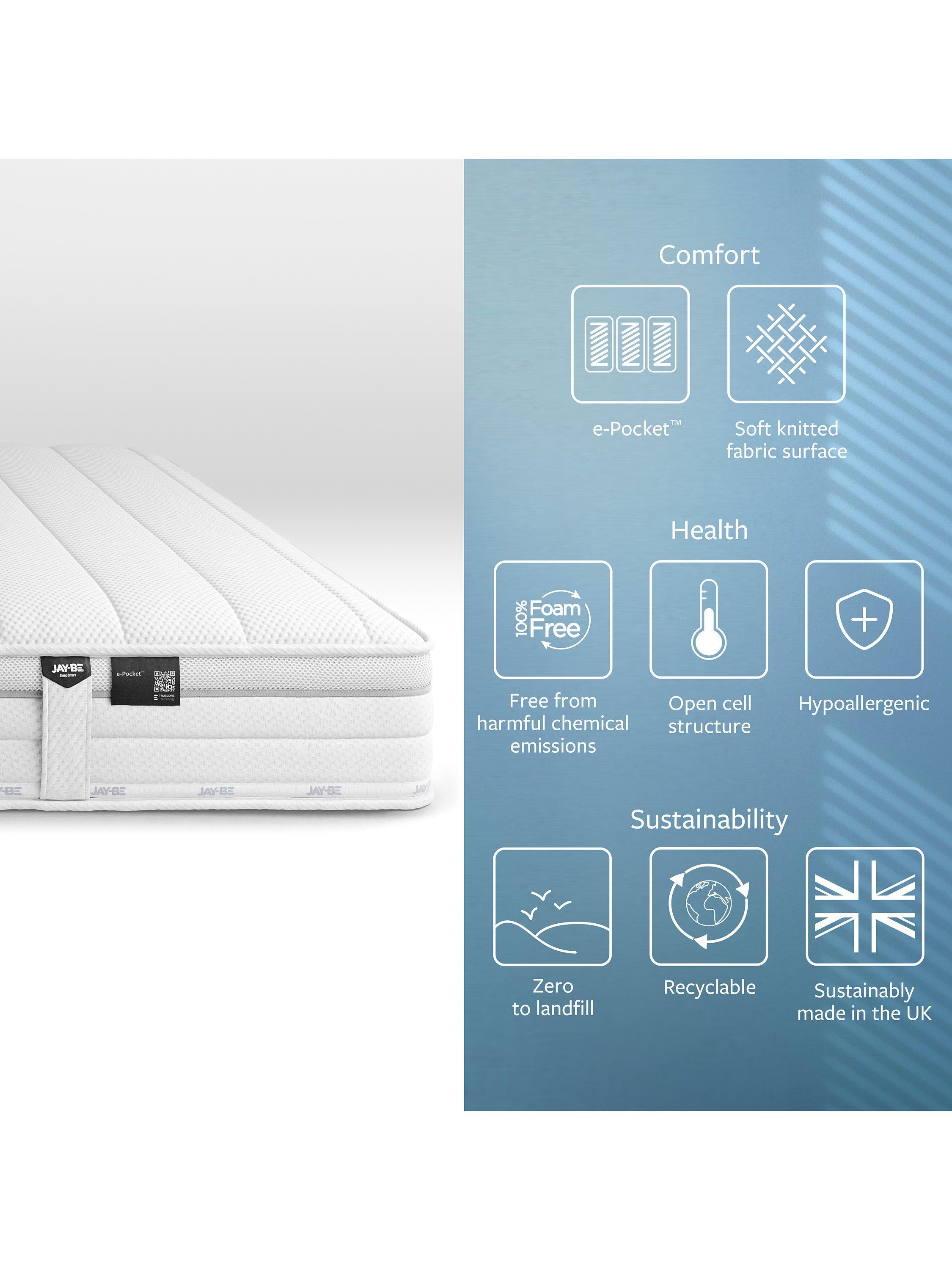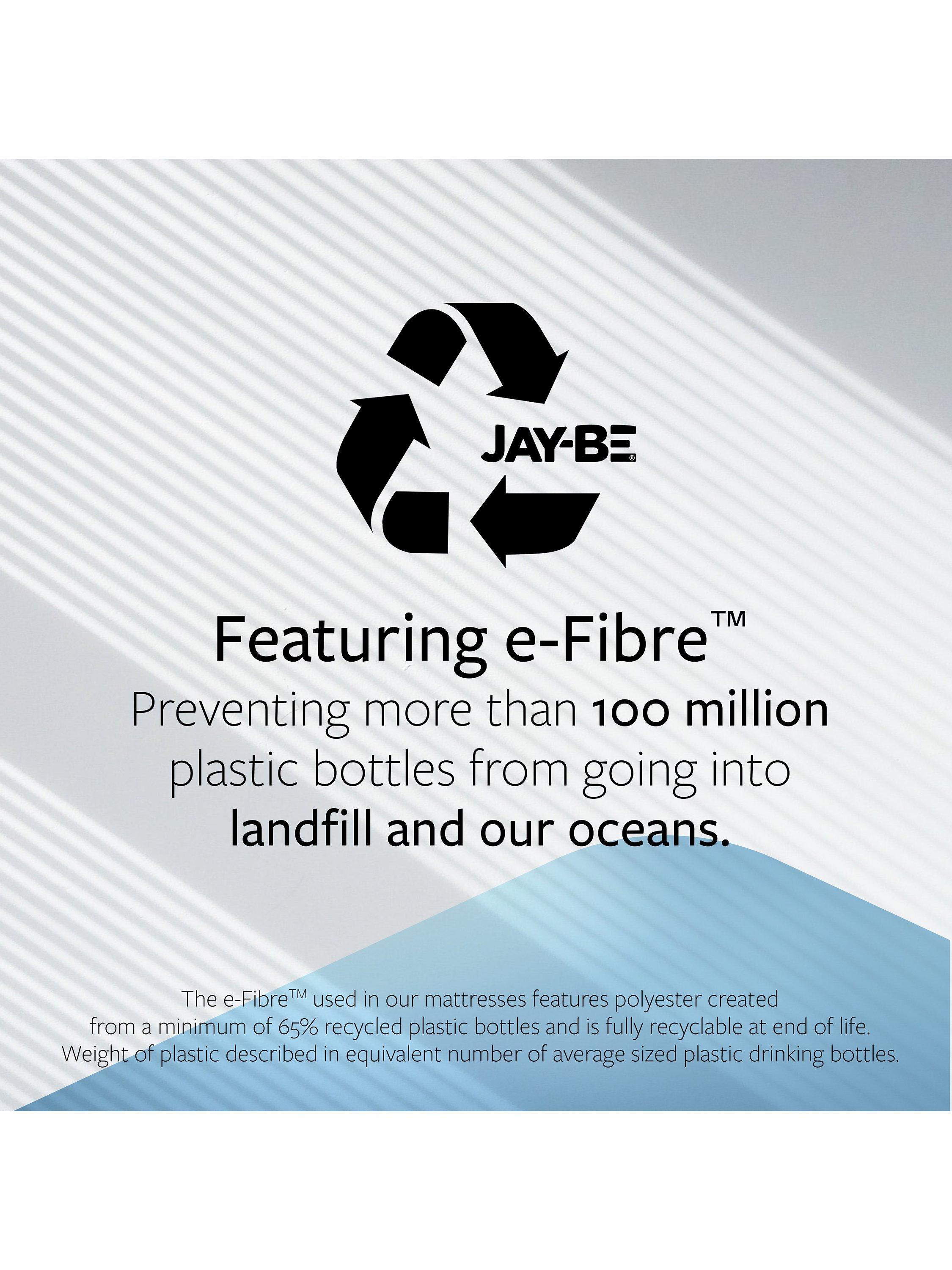 This mattresses is designed with breathable e-Fibre comfort layers which allow air to flow freely, reducing heat and moisture build up, creating a healthier and fresher sleep environment. Whilst the deep e-Pocket cor, moulds to your body's contours and prevents any transfer of movement (roll together) across the mattress for an undisturbed night’s sleep. Made from 100% foam free materials, including Advance e-Fibre™ which has superior moisture wicking abilities. The e-Fibre™ used in Jay-Be mattresses features polyester created from a minimum of 65% recycled plastic bottles and is fully recyclable at end of life.