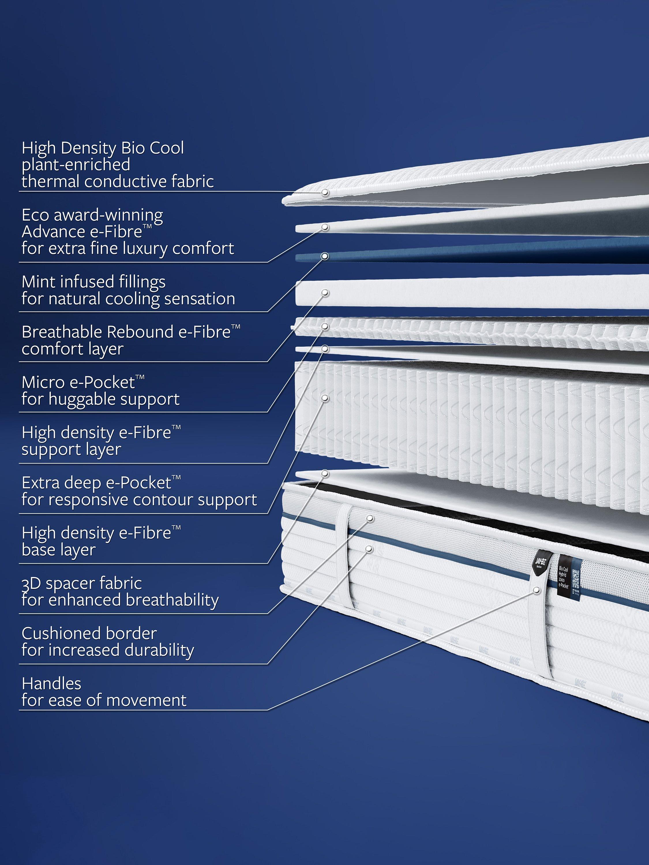 Just beneath the sleep surface is the mint enriched premium comfort layer. As well as having natural anti-bacterial properties the mint extract is independently tested and proven to provide a natural cooling feeling. 100% foam free and free from harmful chemicals, this mattress contains award winning Advance e-Fibre™ and breathable e-Fibre layers. Additionally, a foundation of Deep e-Pocket™ springs and micro pocket springs, give real huggable support and the cushioned border provides increased durability.