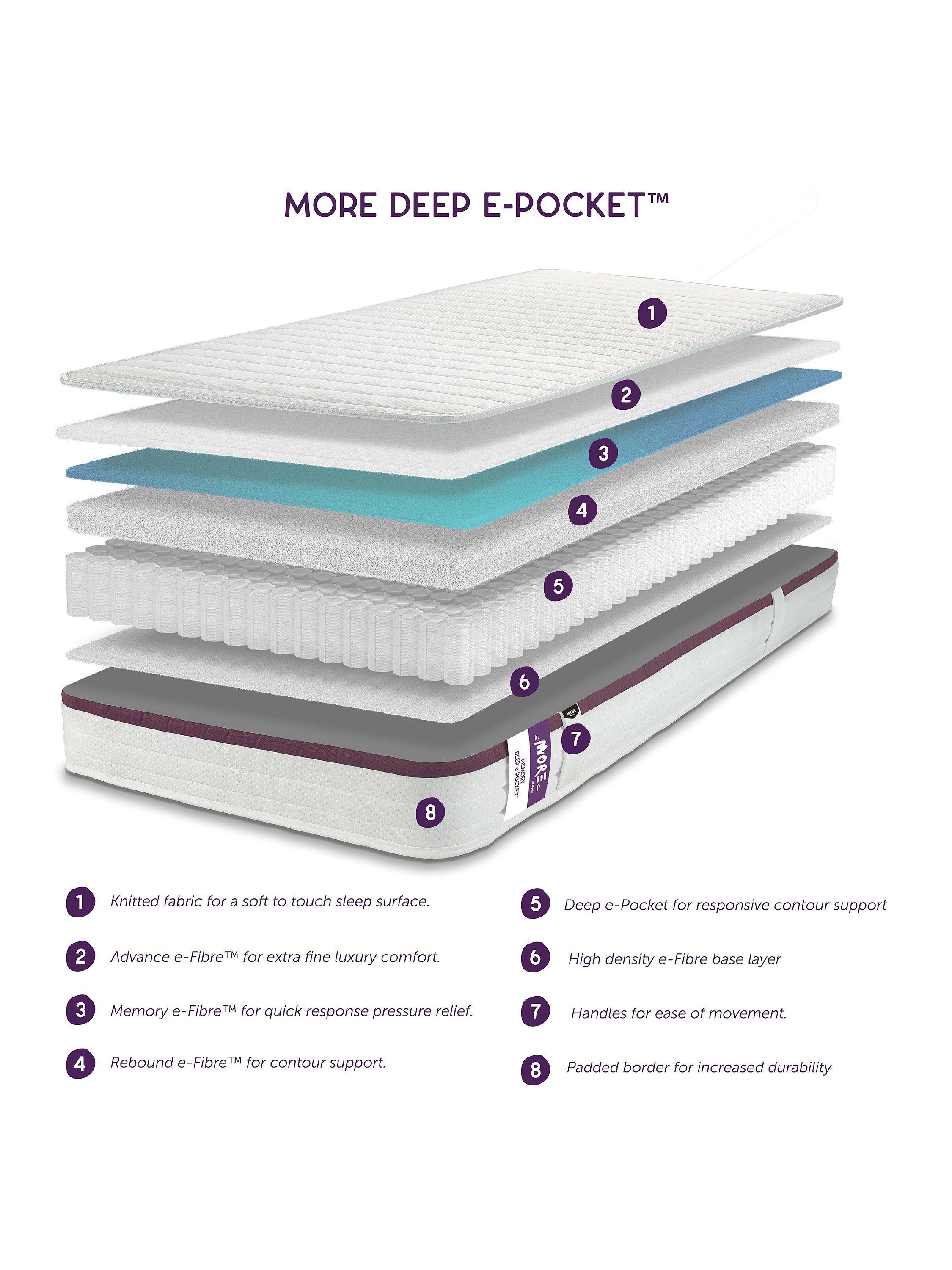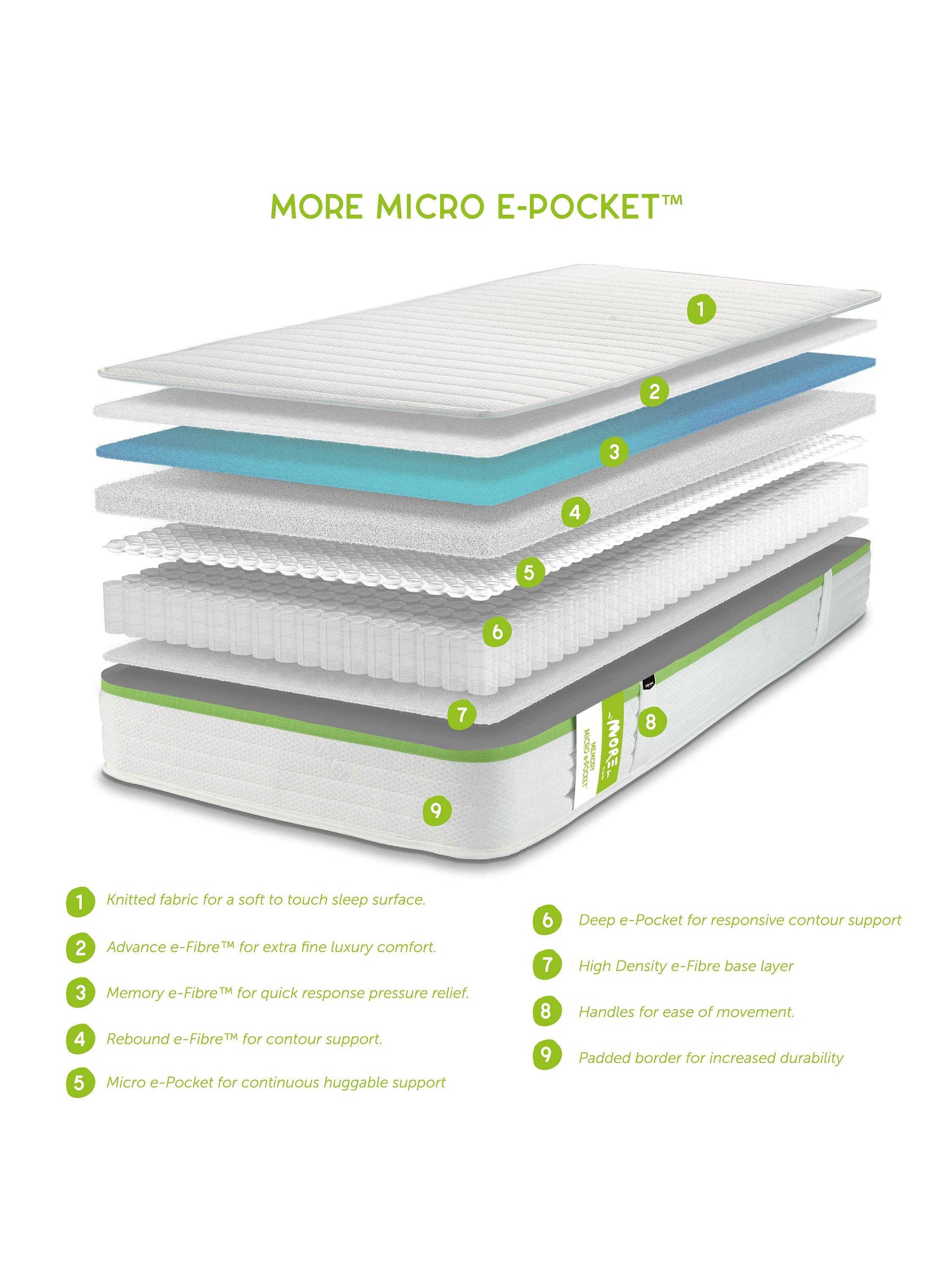 Pressure relieving memory e-Fibre and a comforting Deep e-Pocket core are boosted with the addition of micro e-Pocket™ springs which allow this mattress to respond to even the gentlest of movements giving continuous huggable support and comfort throughout the night.