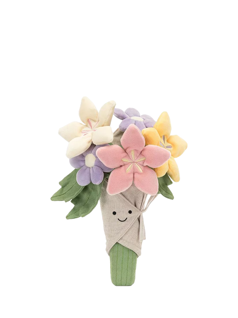 The Amuseable Bouquet is the perfect gift for any occasion. Soft flowers in pastel shades of pink, purple, yellow, and cream sit alongside suedette green leaves with stitched detail, all wrapped up in a beige linen wrap with a stitched smile.