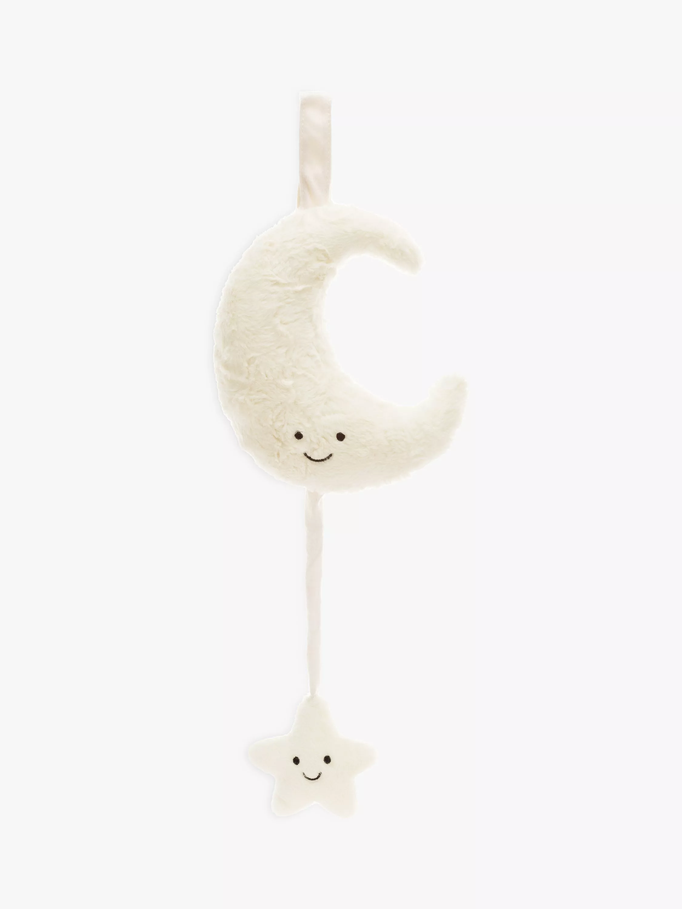 Amuseable Moon Musical Pull will send little ones to a joyful dreamland. A tiny white cloud suspends from a soft textured Amuseable Moon, all created from recycled fibres. Pull down to play the sweet original Jellycat Lullaby.
