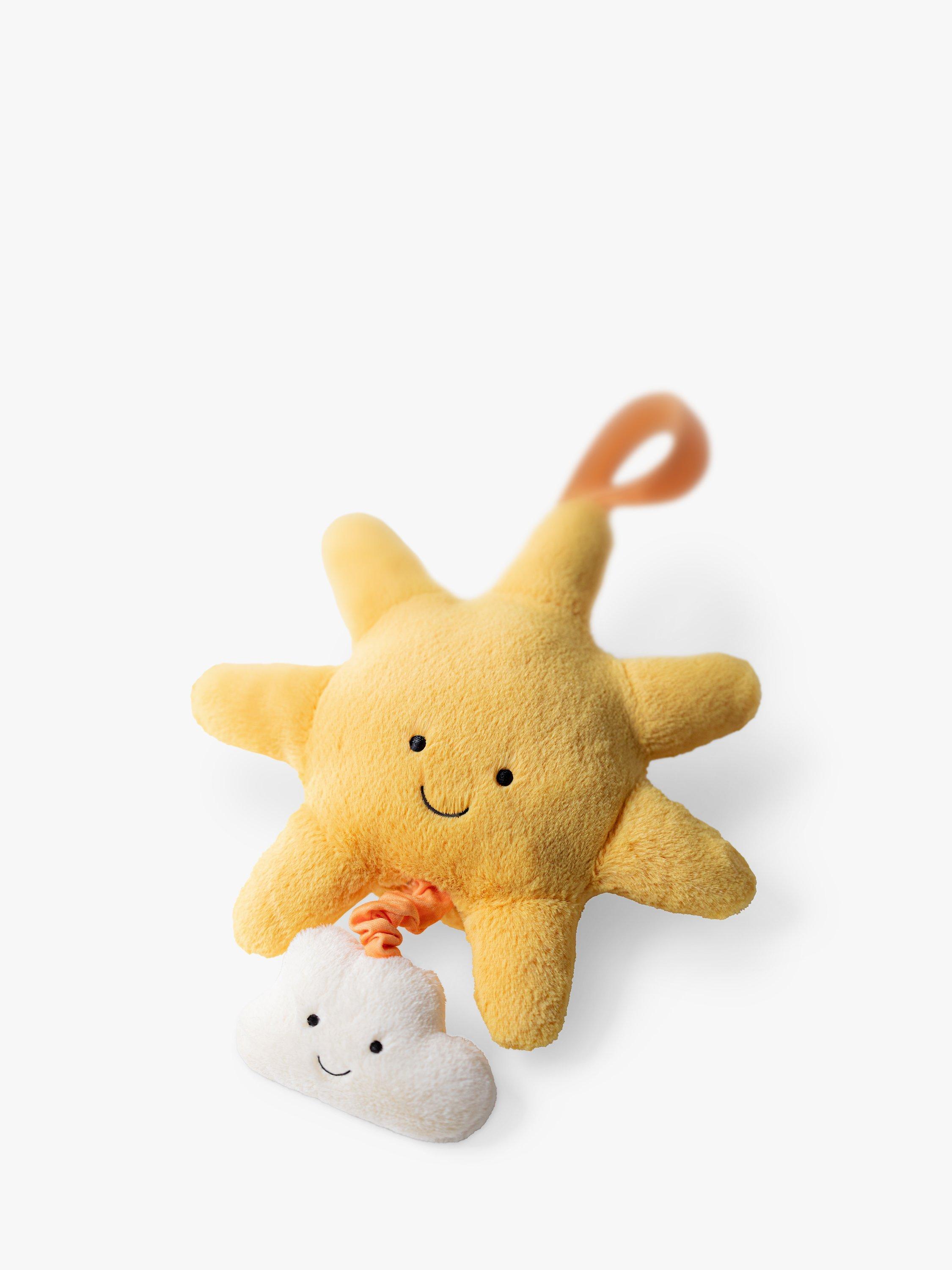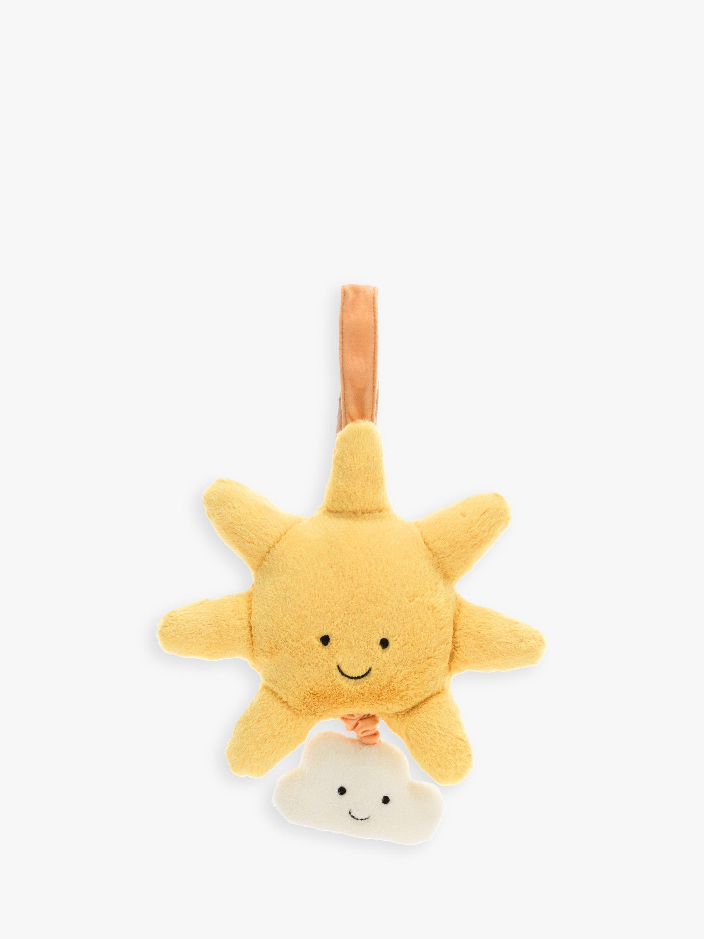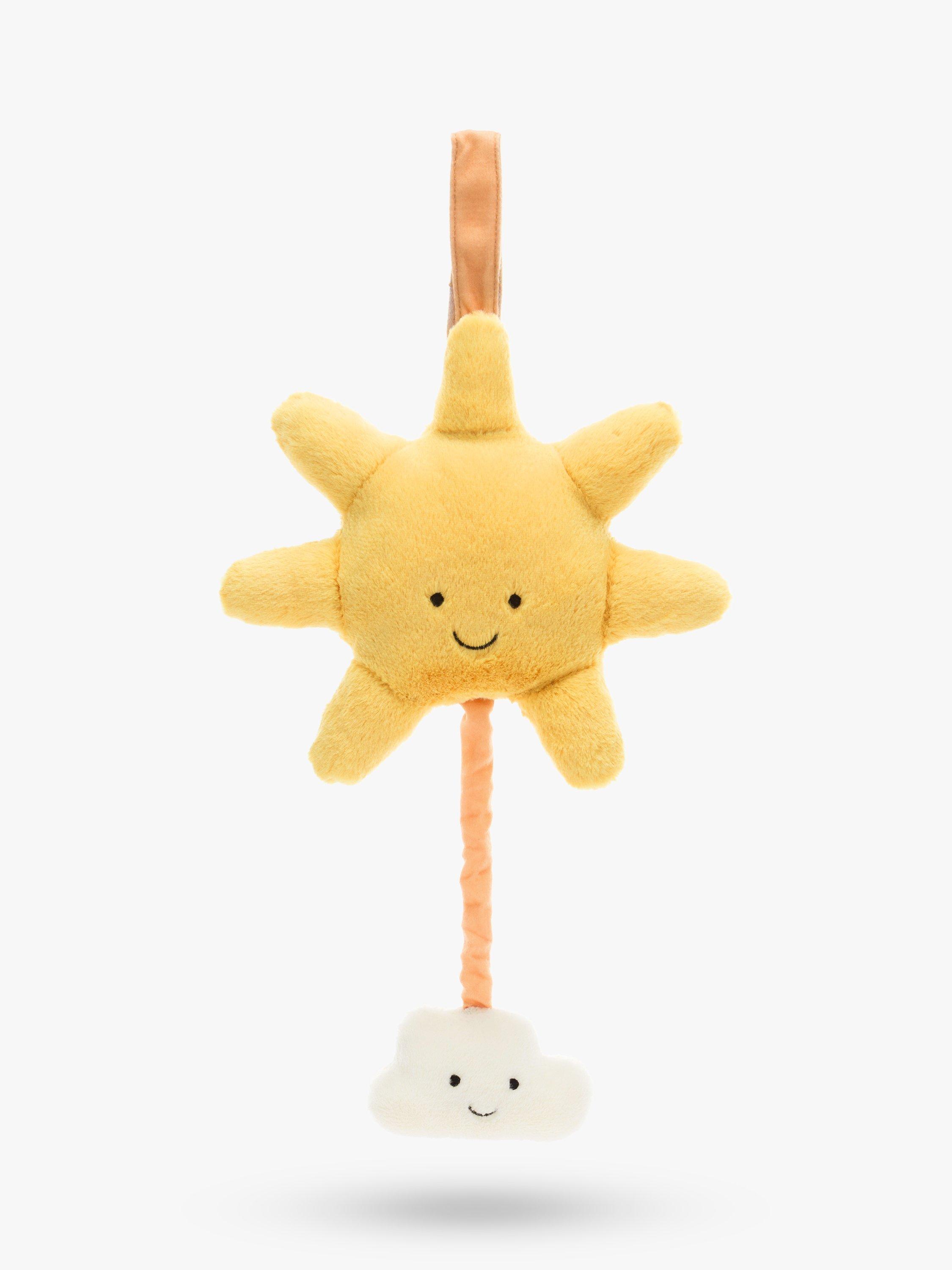 Amuseable Sun Musical Pull will send little ones to a joyful dreamland. A tiny white cloud suspends from a bright yellow Amuseable Sun, all created from recycled fibres. Pull down to play the sweet original Jellycat Lullaby.