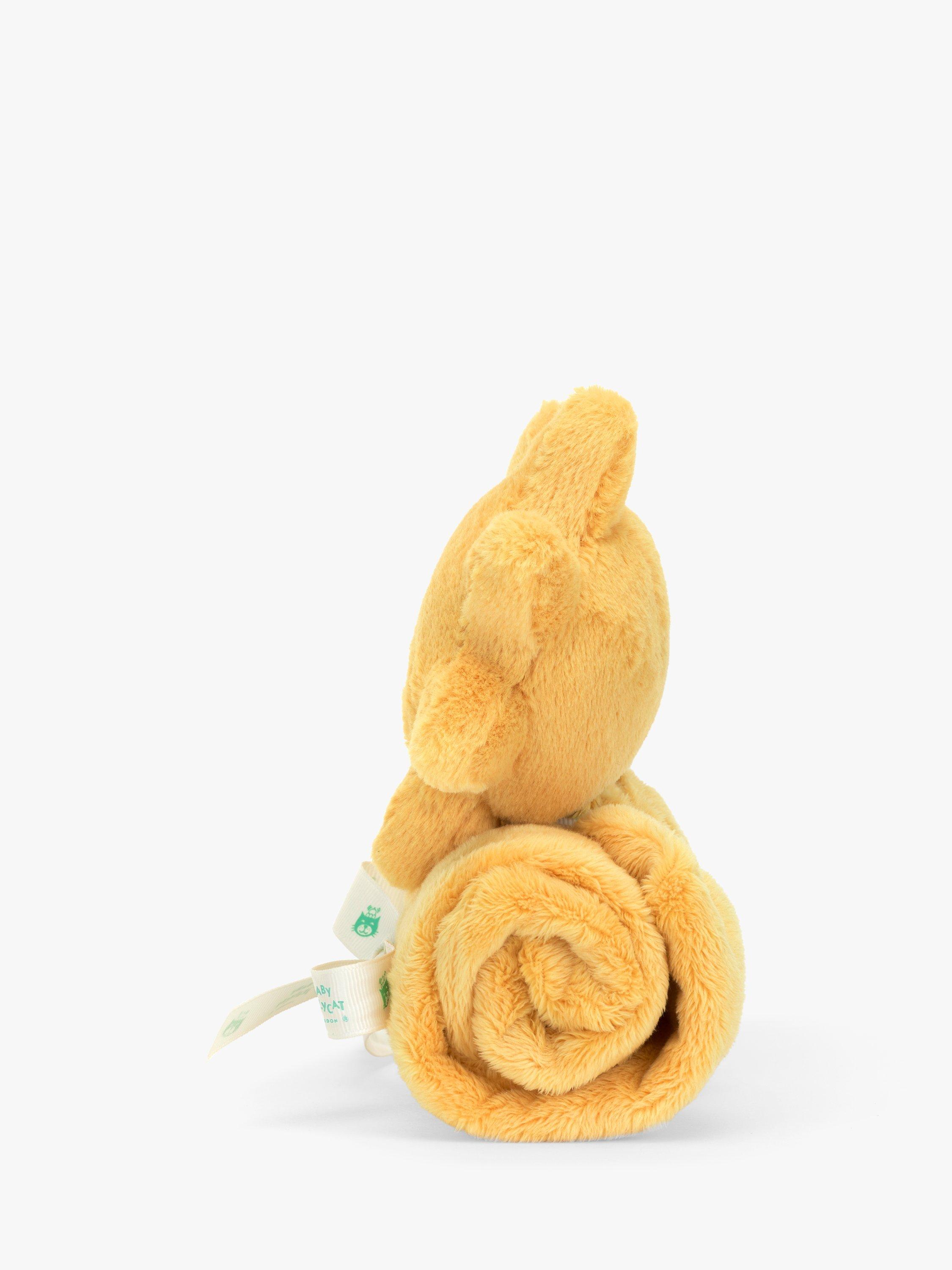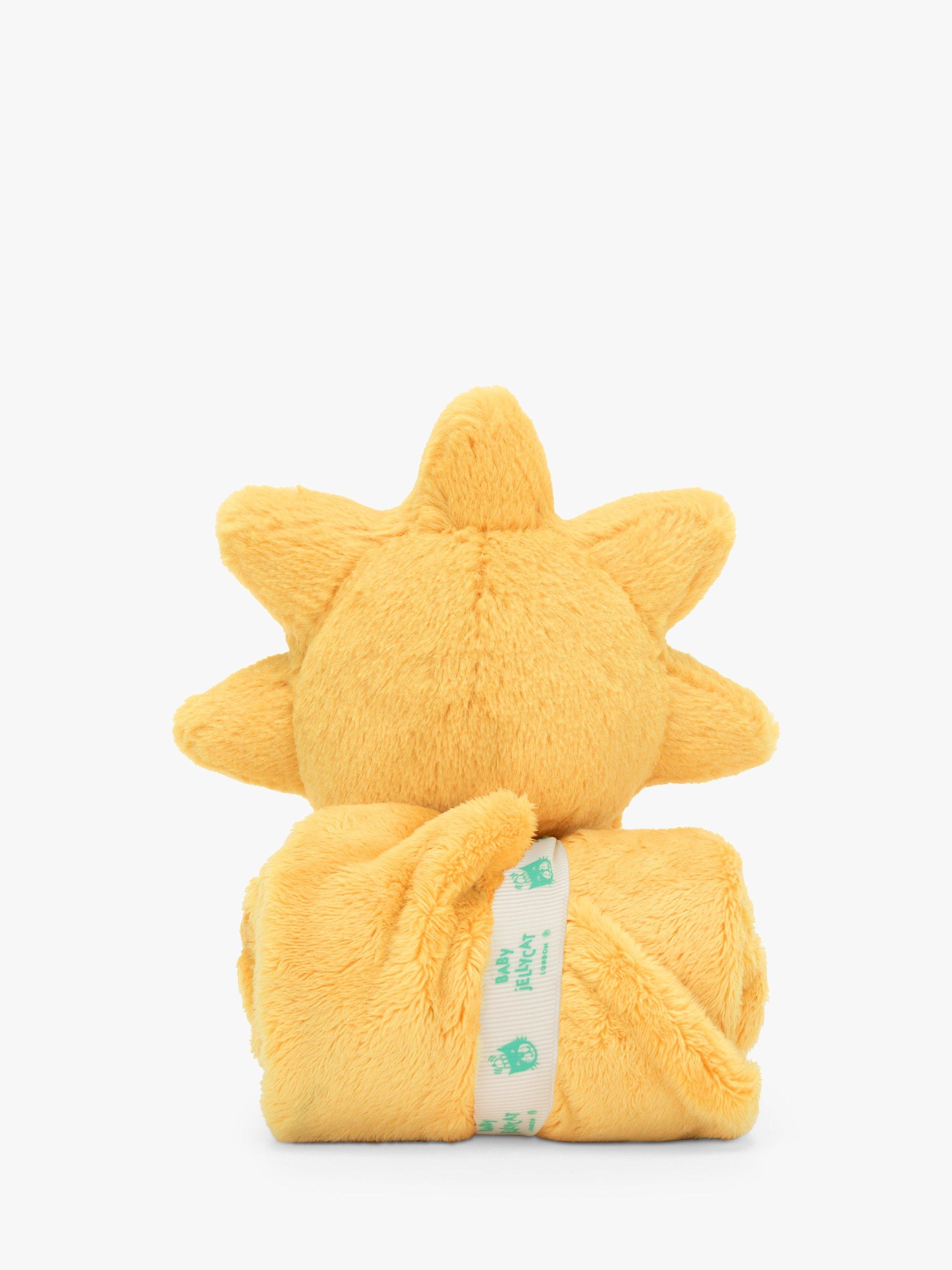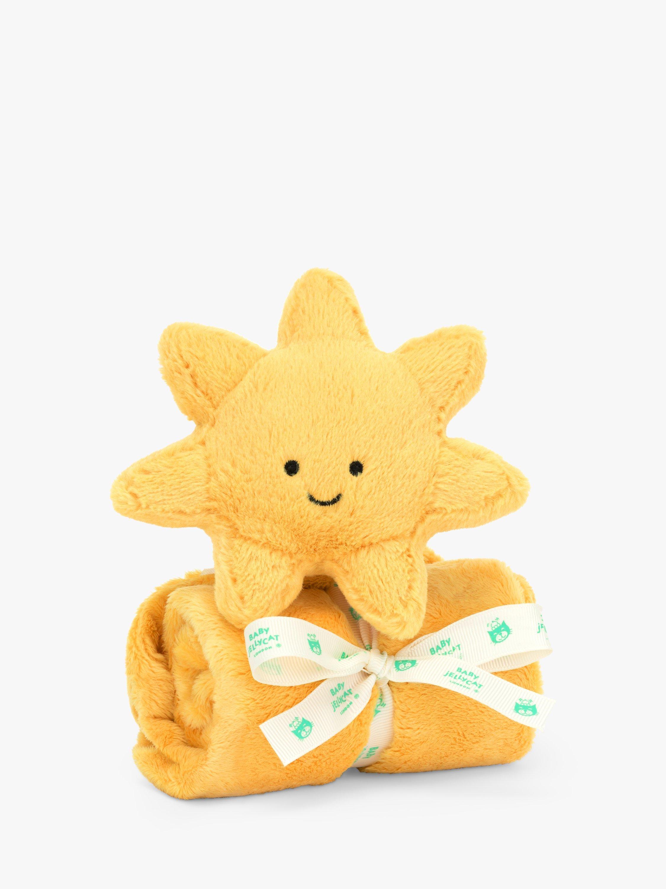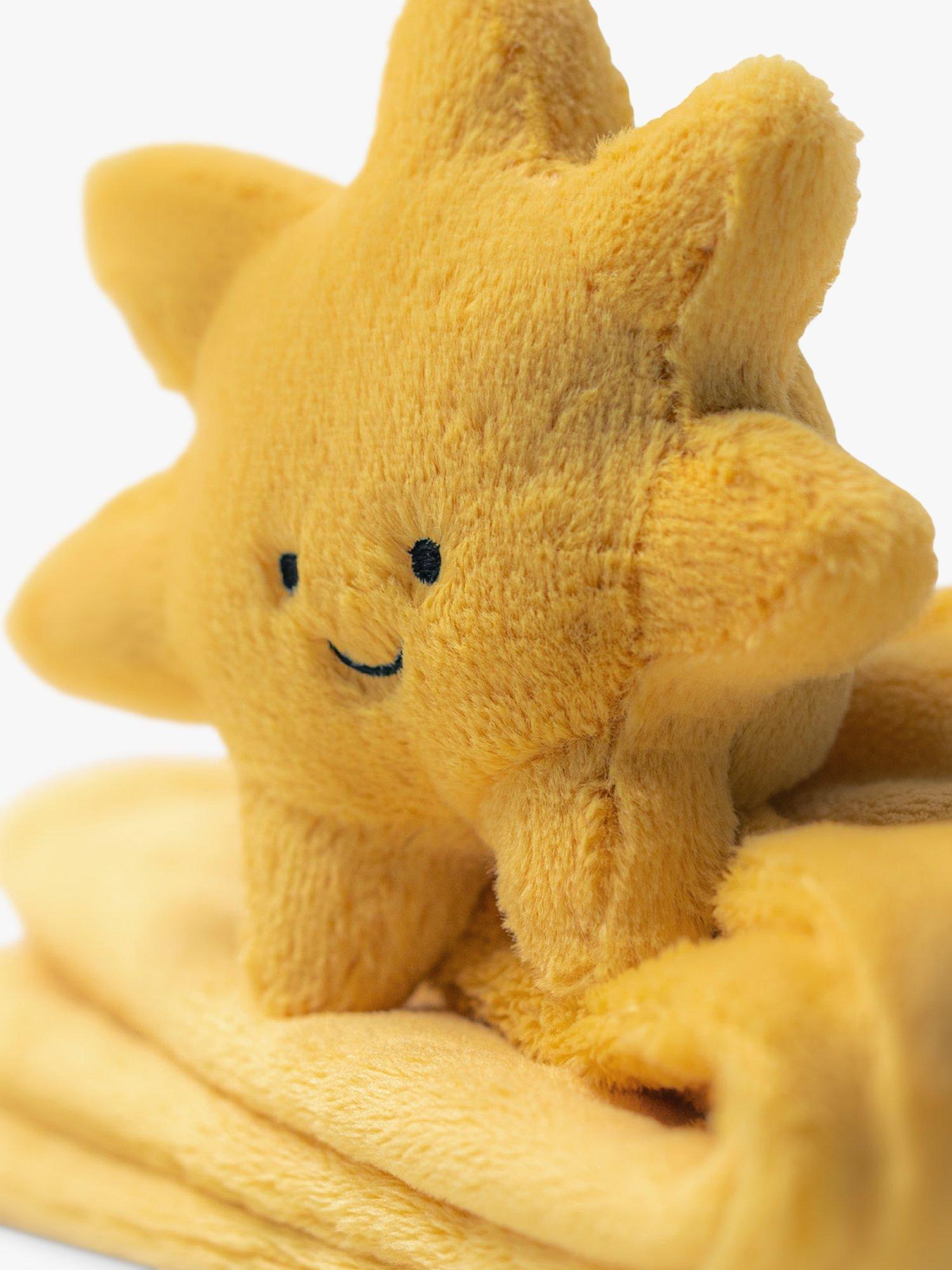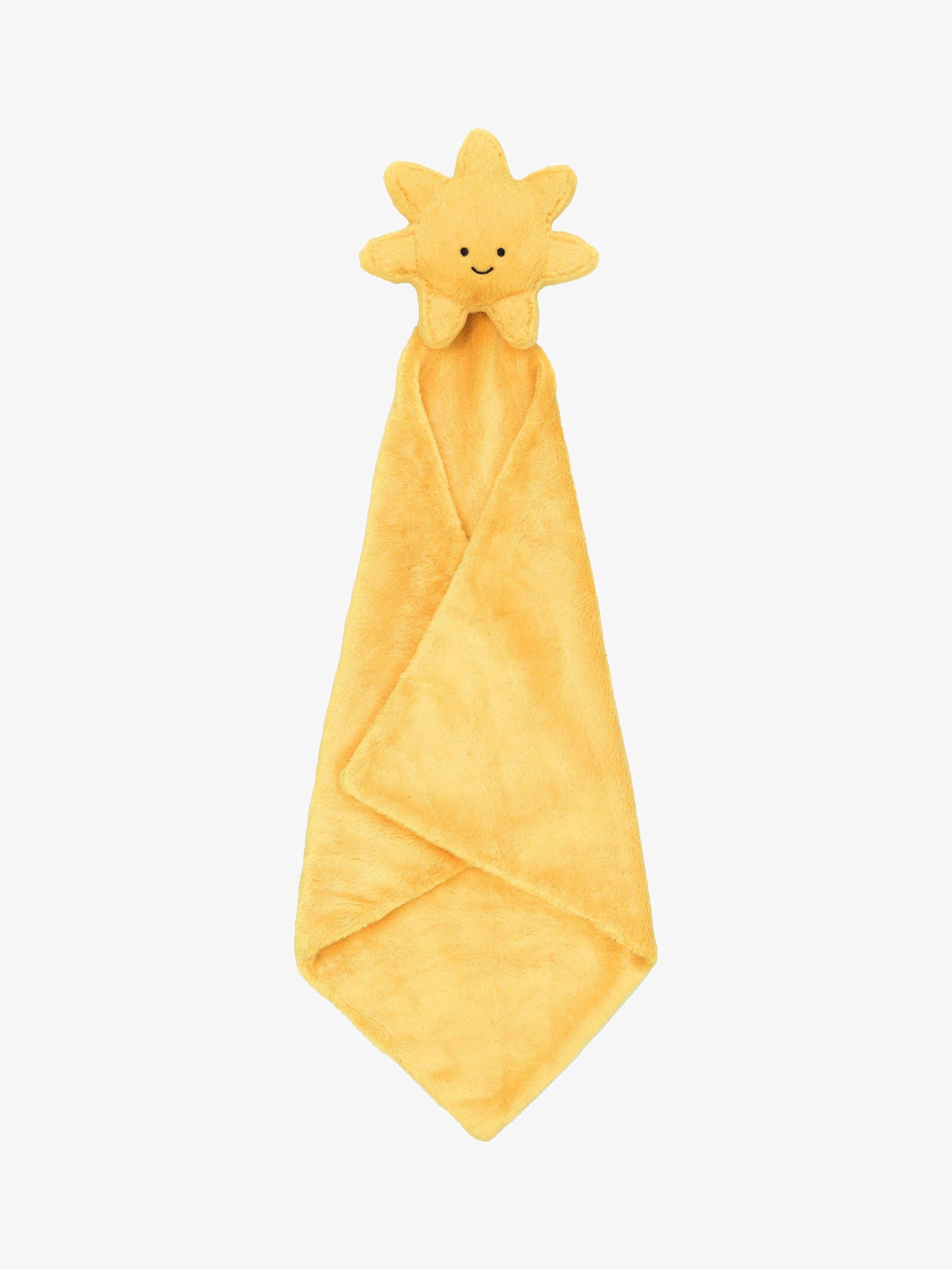 Amuseable Sun Soother from Jellycat brings comfort at sleep times. The soother and matching sun in soft bright yellow faux fur are created from recycled fibres. Little ones can cuddle up with the blanket or with the tiny Amuseable Sun on to the corner, for sweet dreams.