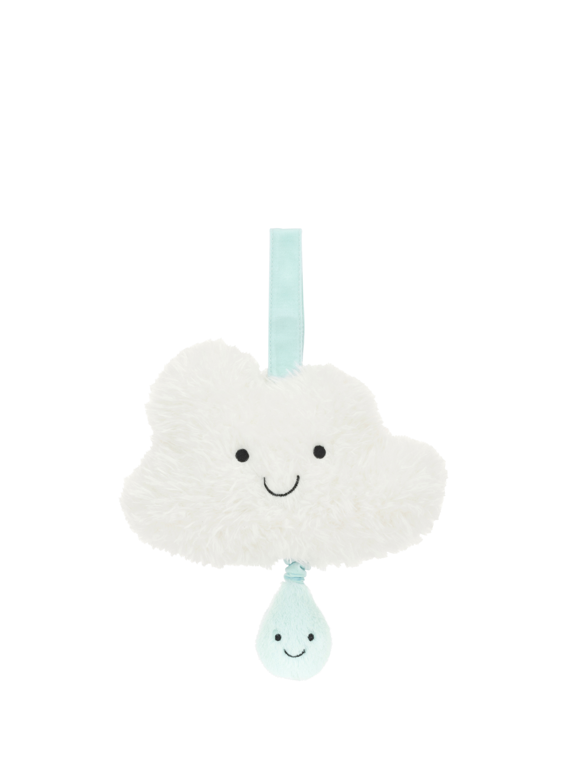 Amuseables Cloud Musical Pull is sure to send little ones to a joyful dreamland. A tiny blue raindrop hangs from a soft, cream Amuseables Cloud, all created from recycled fibres and can be pulled down to play the sweet original Jellycat Lullaby.