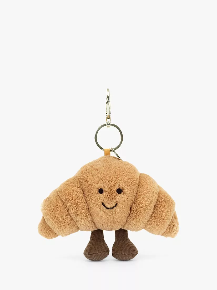 Fluffy and golden, with chocolate cord boots, this embroidered croissant is bakery-fresh! With a silver chain, Jellycat disc and friendly smile, this cheery pastry is délicieux!