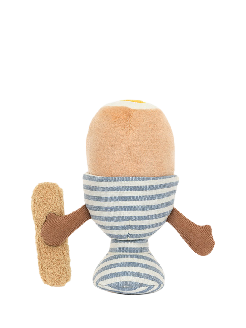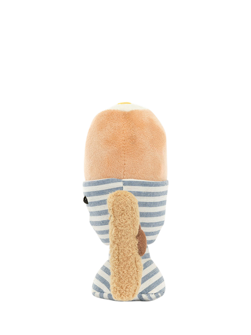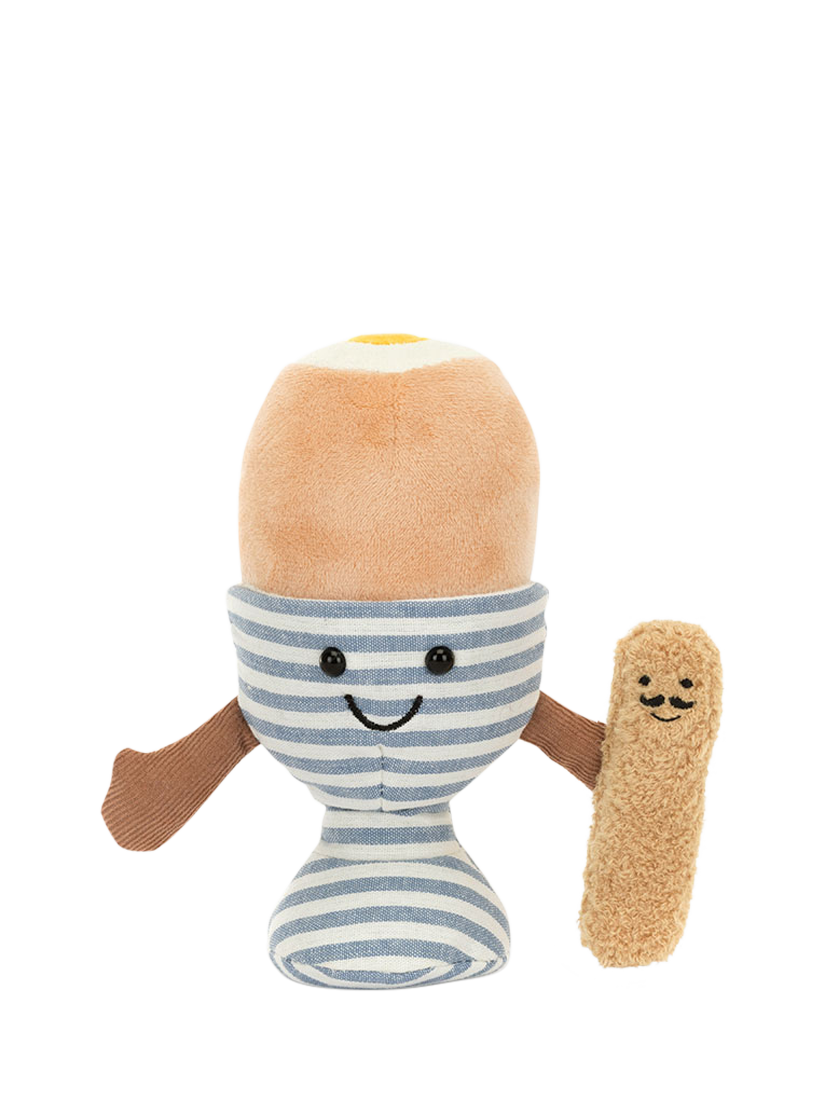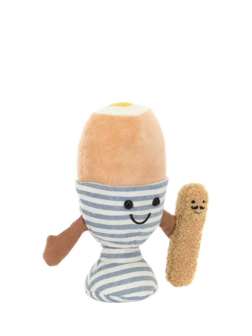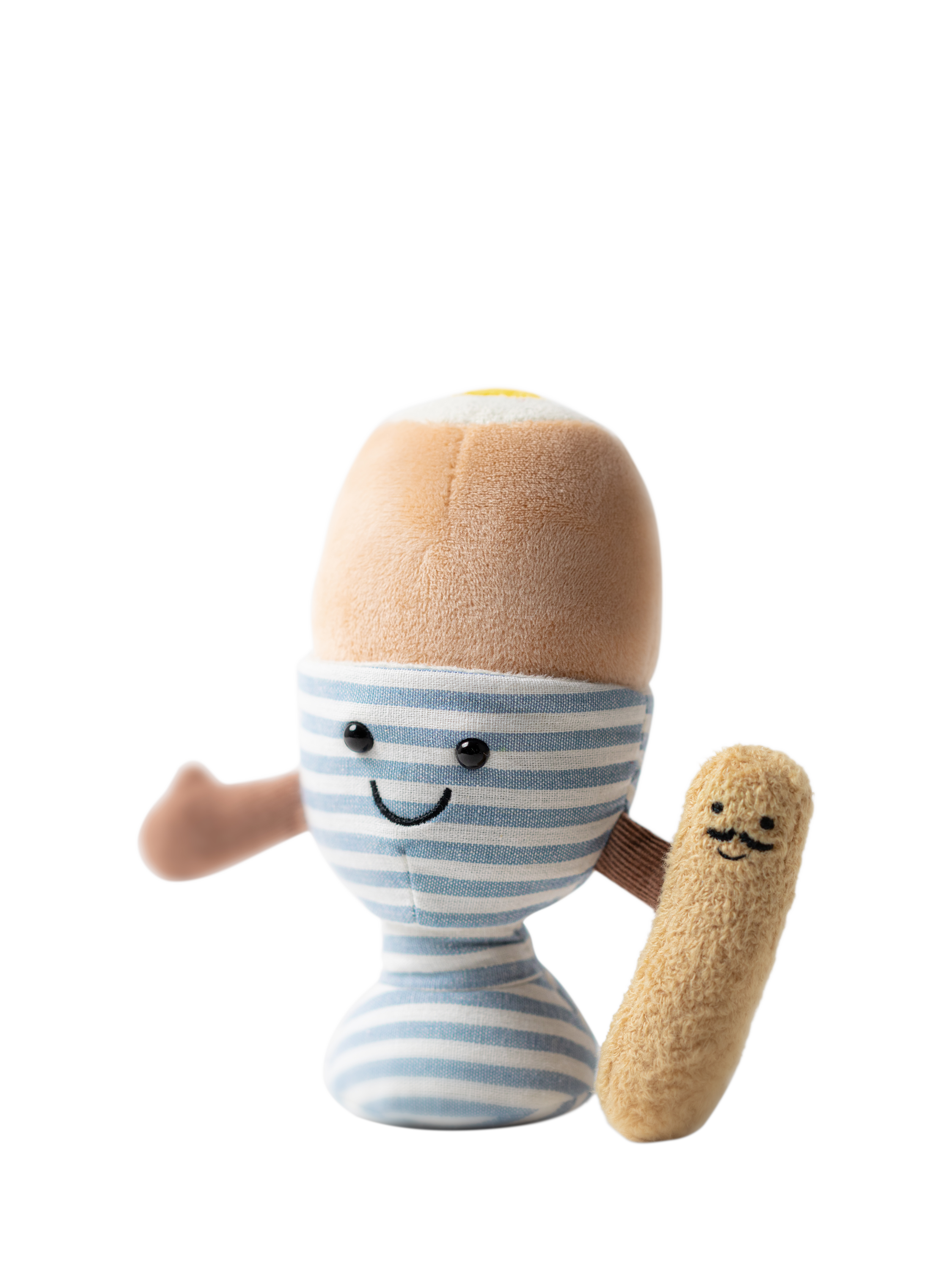 Start every day right with Amuseables Eggetha Egg & Lance Soldier. A textured soft-boiled egg sits in a blue and white striped cotton egg cup with fine cord arms and a stitched smile. Eggetha Egg holds on to perfectly toasted Lance Soldier, in golden brown textured fur with embroidered facial features and moustache.