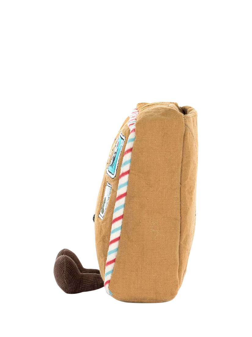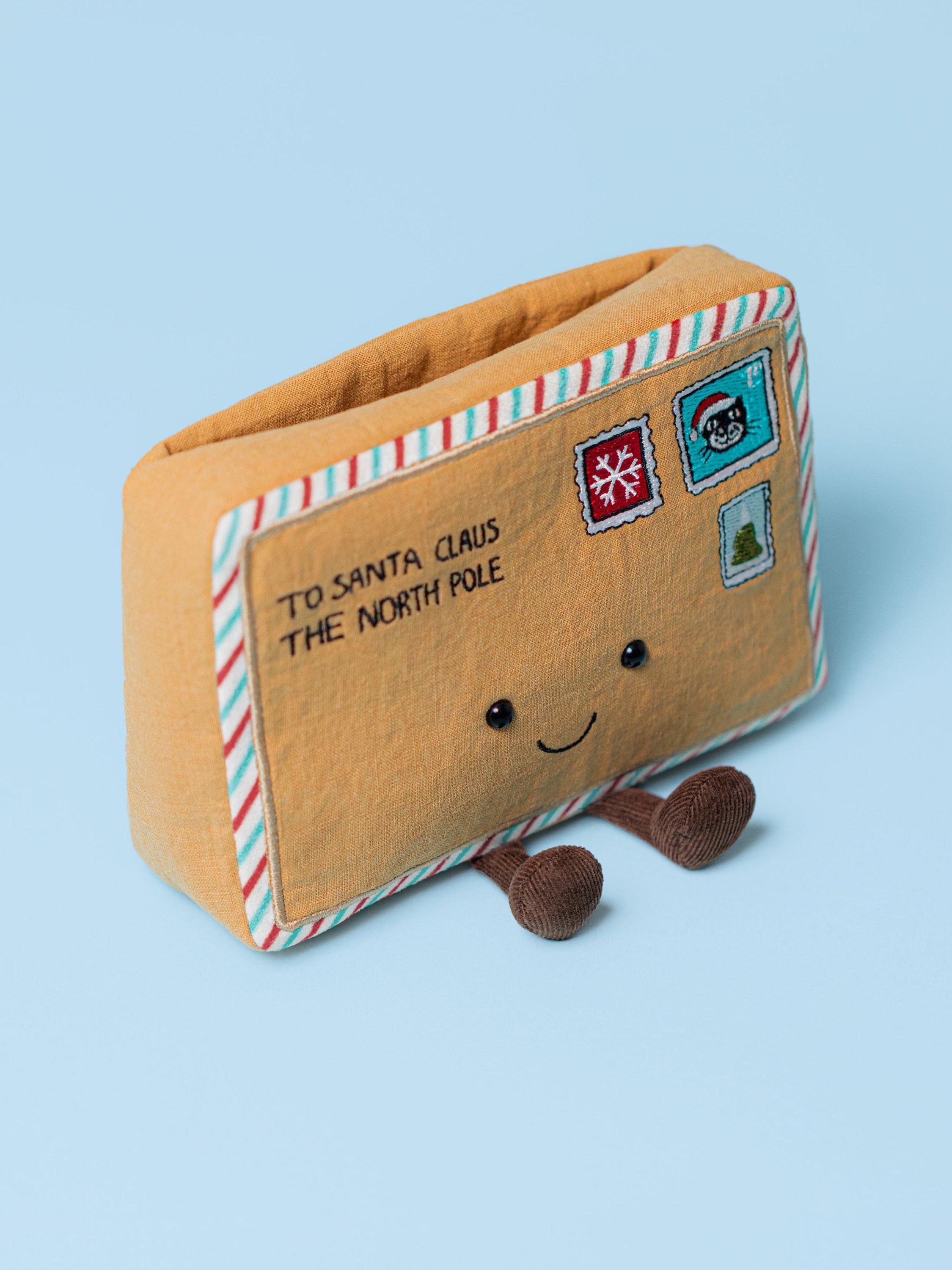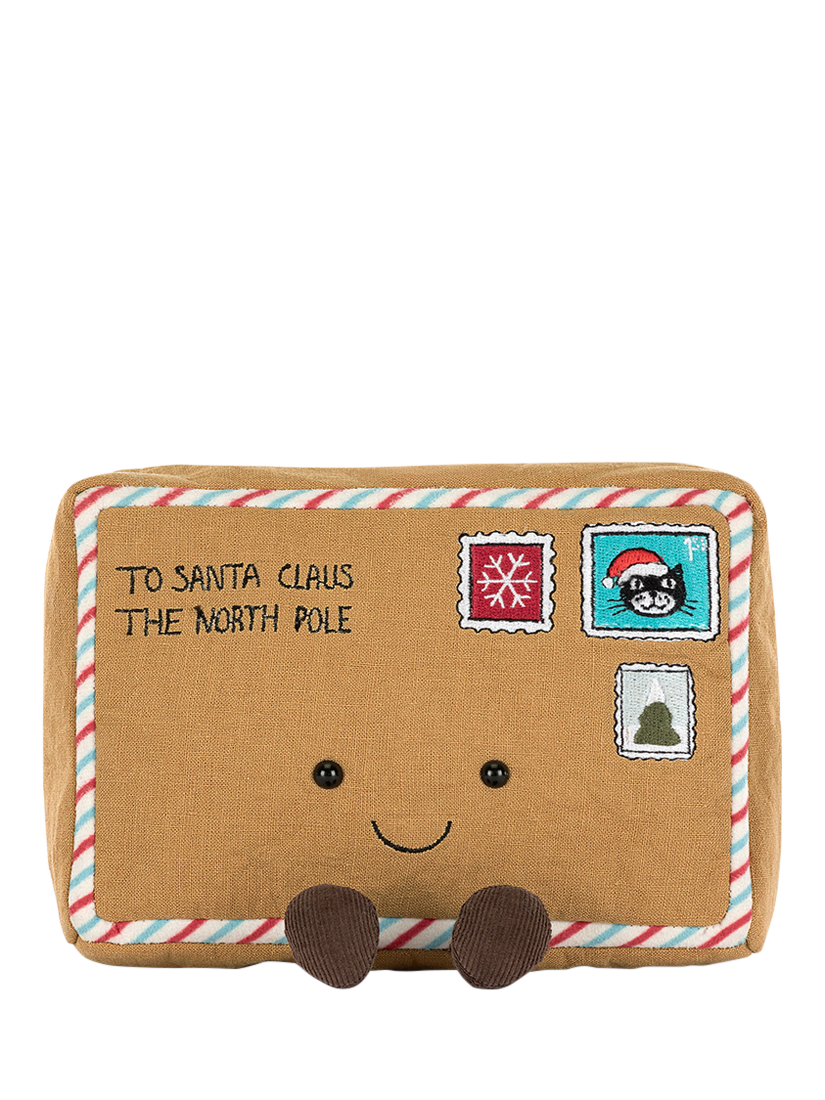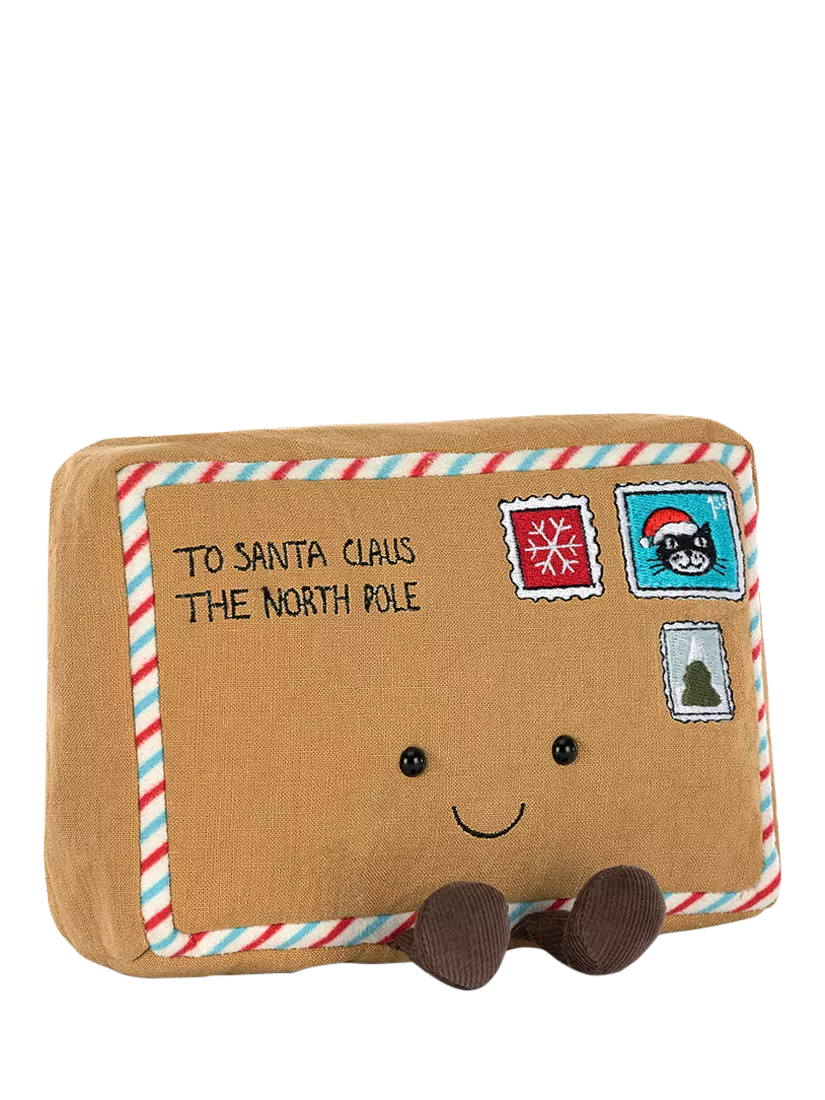 Send a special message this Christmas with Amuseables Letter to Santa. A textured brown envelope with Candy Cane striped edging is decorated with embroidered stamps and address, with a slot in the back for your letter and sealed with an embroidered Jellycat head.