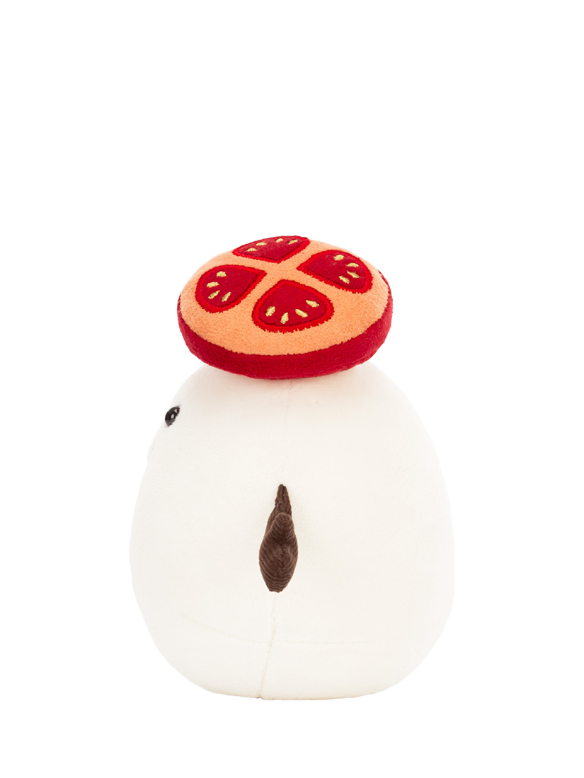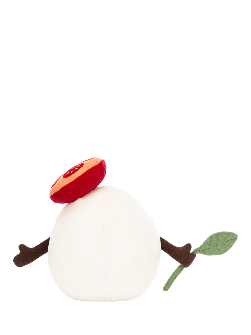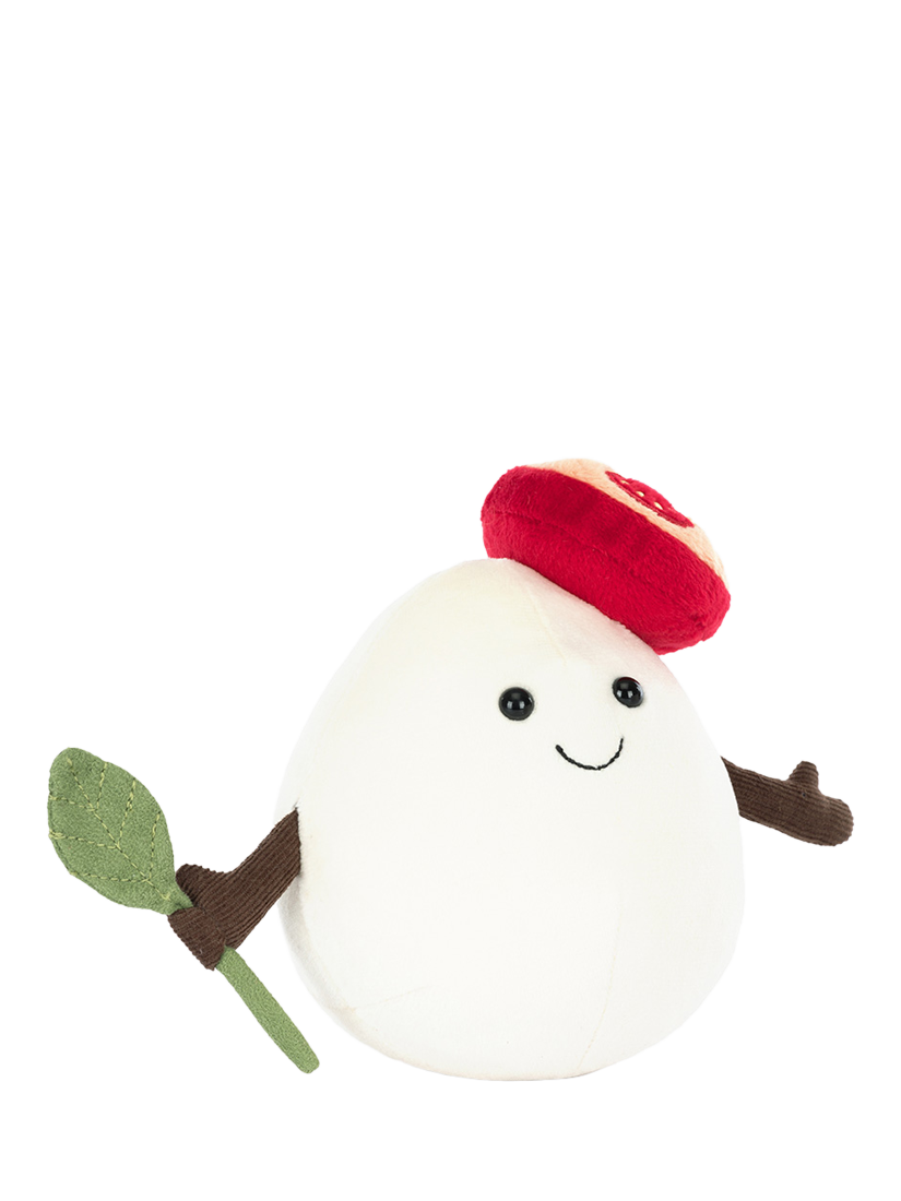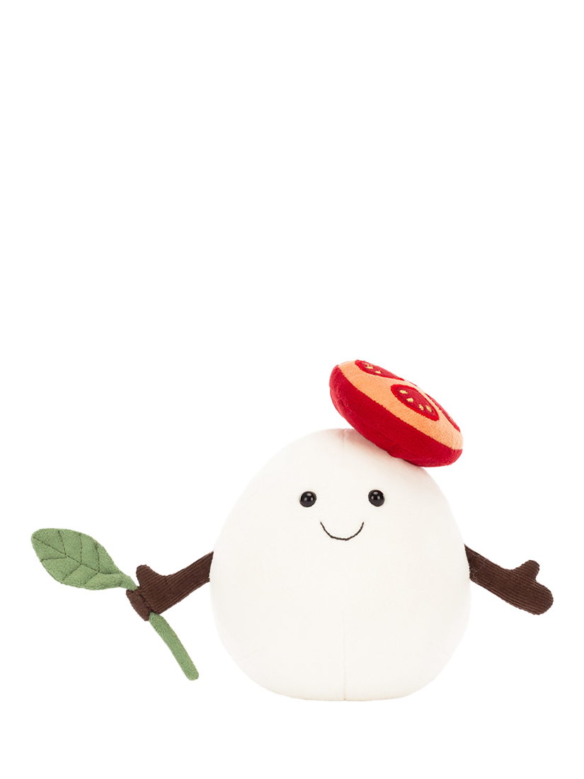 Amuseables Mozzarella is a ball of pure joy. In soft cream fur with a stitched smile and fine cord arms, this mozzarella is adorned with a textured tomato slice and suedette basil leaf.